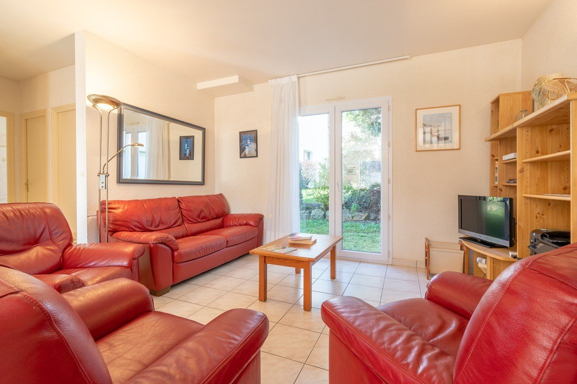- Living room with dining area (table, chairs, sideboard) and lounge area (armchairs, sofa, TV) opening onto the South-facing terrace extended by the enclosed garden (garden furniture, barbecue)