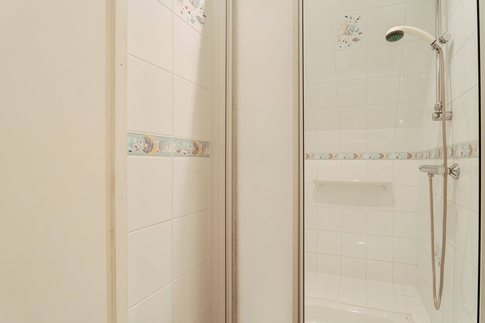- 1 bedroom with 1 double bed (160cm, duvet), shower, sink, and storage