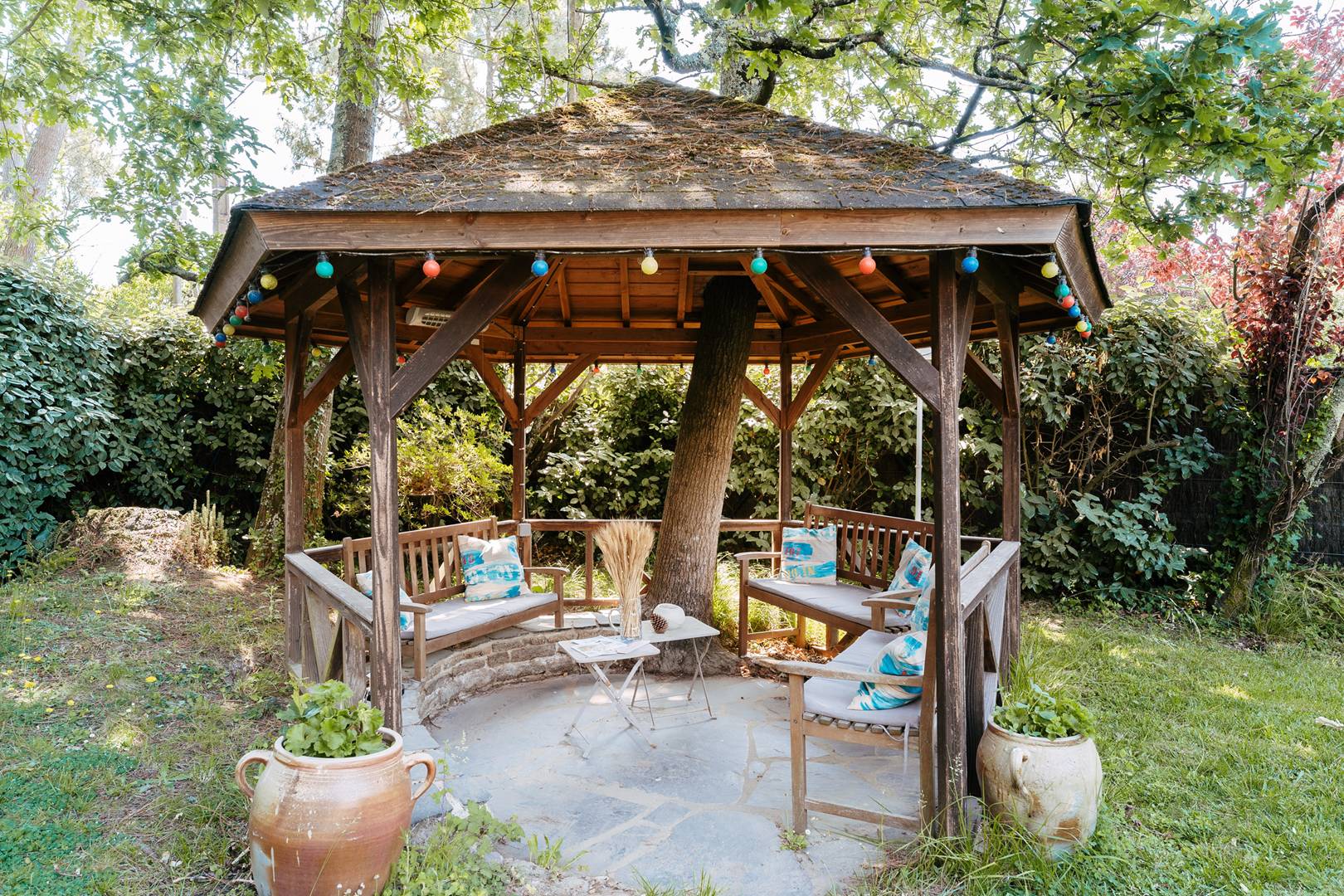 - Living room with lounge area (sofas, fireplace) and dining area (table and chairs), opening onto a south-facing terrace (garden furniture, barbecue), extended by the private enclosed garden with semi-buried pool (1.40m deep)