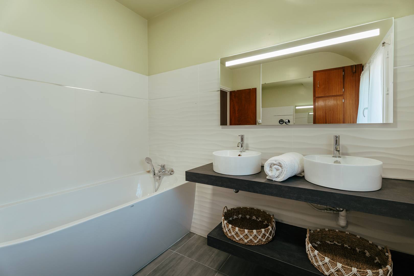 - Open-plan, fully equipped kitchen (3-ring induction hob, fridge-freezer, oven, microwave, dishwasher)
