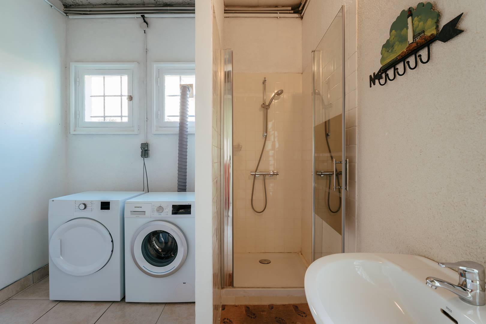 - Utility room with fridge, washing machine, dryer, "beach return" shower, and access to the garage