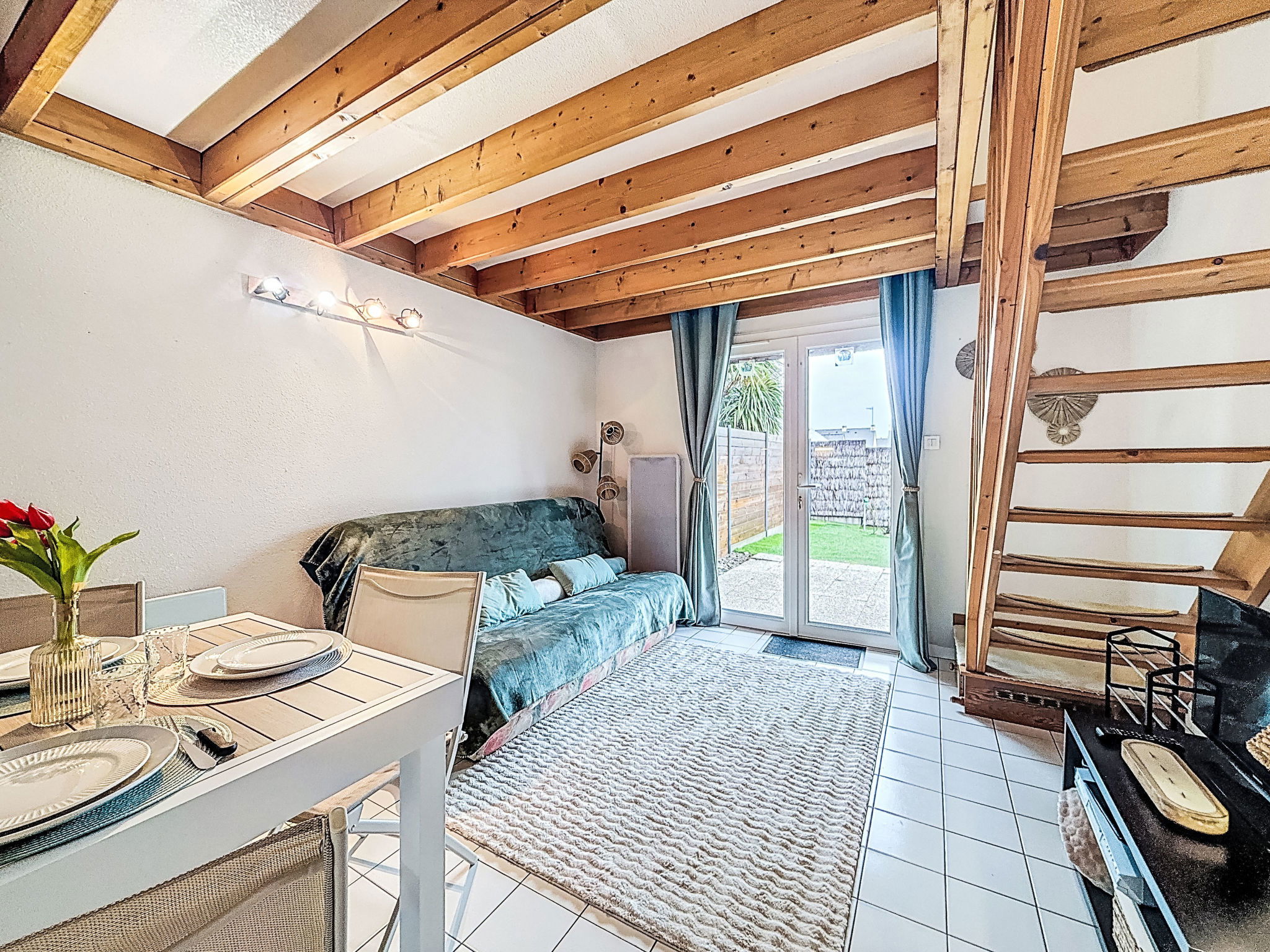 3-room semi-detached house 45 m2. Comfortable furnishings: living/dining room with 1 double sofabed (1 x 140 cm, length 190 cm), TV (flat screen). Exit to the terrace. Kitchenette (mini-oven, oven, dishwasher, 3 induction hot plates, toaster, kettle, microwave, electric coffee machine). Sep. WC. Upper floor: 2 rooms, each room with 1 french bed (1 x 140 cm, length 190 cm). Bathroom. Terrace 15 m2, south facing position and west facing position. Terrace furniture, electric barbecue, deck chairs (2). Facilities: washing machine, hair dryer. Internet (WiFi, extra). Parking (2 cars). Please note: 1 pet/ dog allowed. Smoke alarm. Offer by a private individual according to Art. 155, IV of CGI. 56034001054AC