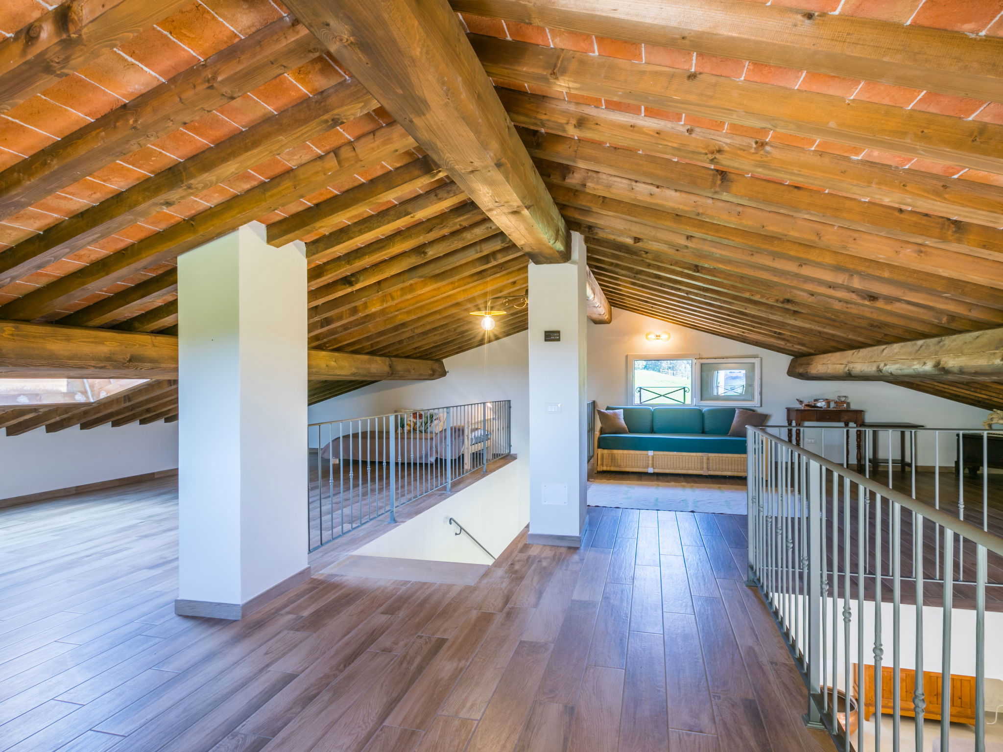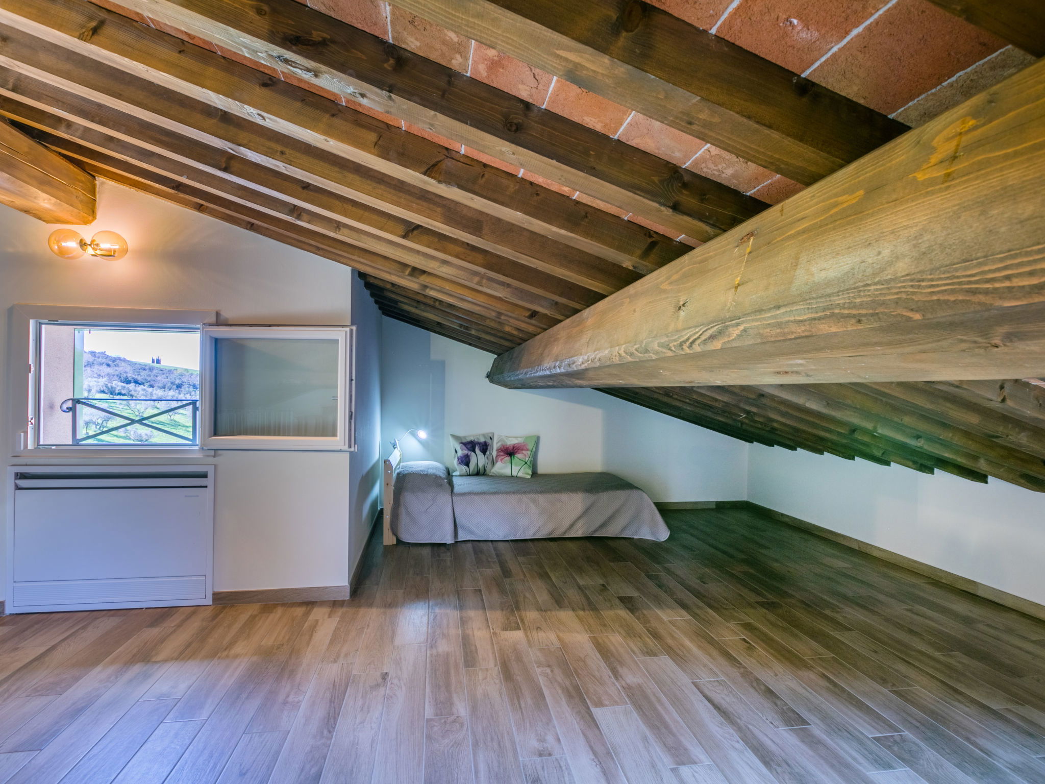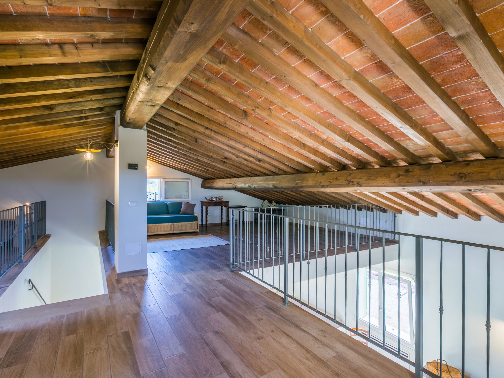 3-room house 100 m2. Beautiful and modern furnishings: open large living/dining room with dining table and TV. Exit to the garden, to the terrace. 2 double bedrooms. Open kitchen (oven, dishwasher, 4 induction hot plates, toaster, kettle, electric coffee machine). Bath/bidet/WC. Electric heating, air-conditioning. Solar power. Upper floor: gallery with 2 beds. Large garden. Terrace furniture, barbecue (portable), deck chairs. Beautiful panoramic view of the countryside and the town. Facilities: washing machine. Internet (WiFi, free). Parking at the house. Maximum 1 pet/ dog allowed. Instead of an enclosed bedroom, some sleeping areas are located in an open-plan area (gallery, alcove, etc.). Bedlinen, towels, final cleaning and all energy costs are included. IT050006C28UZQVXPS