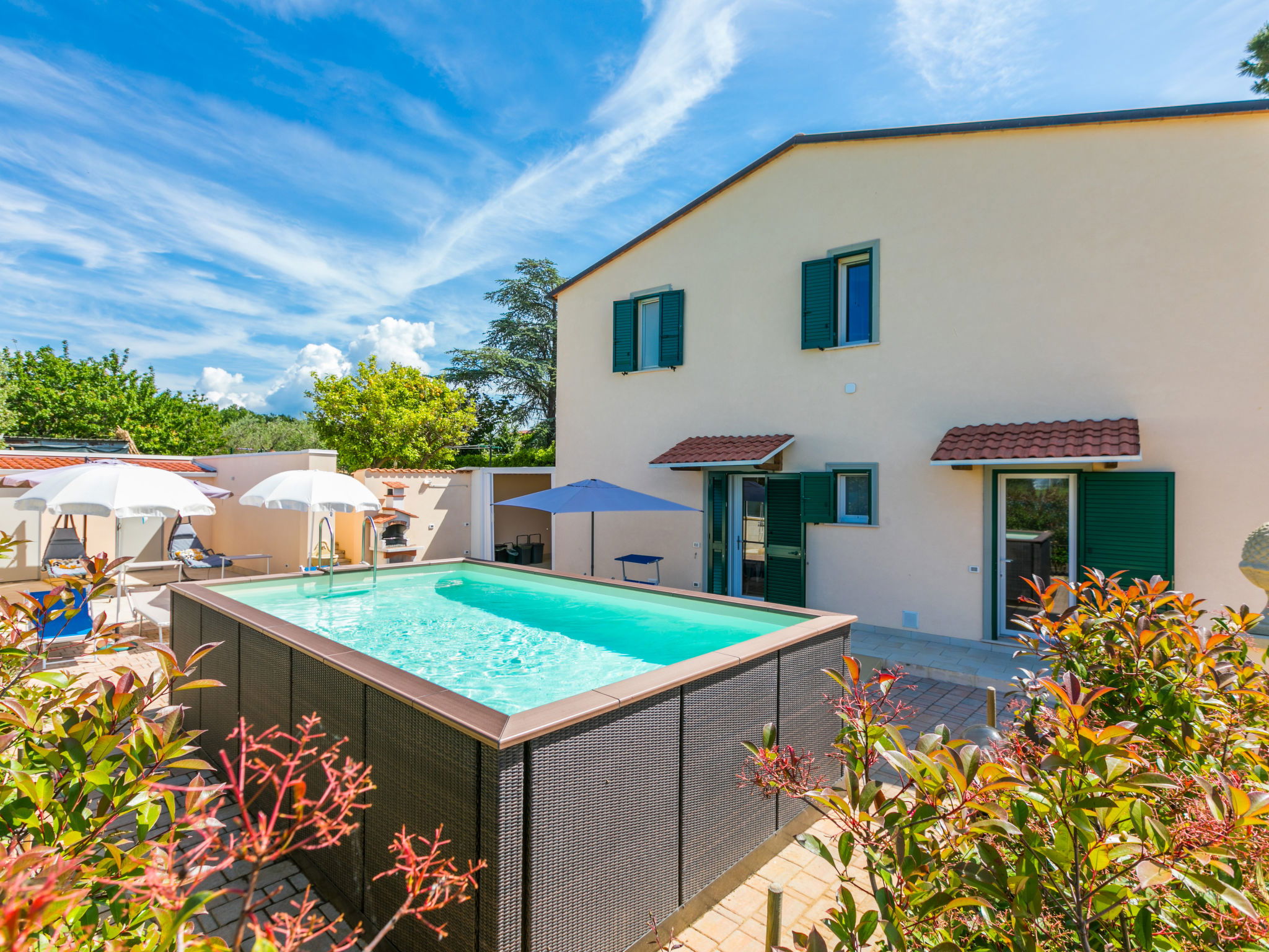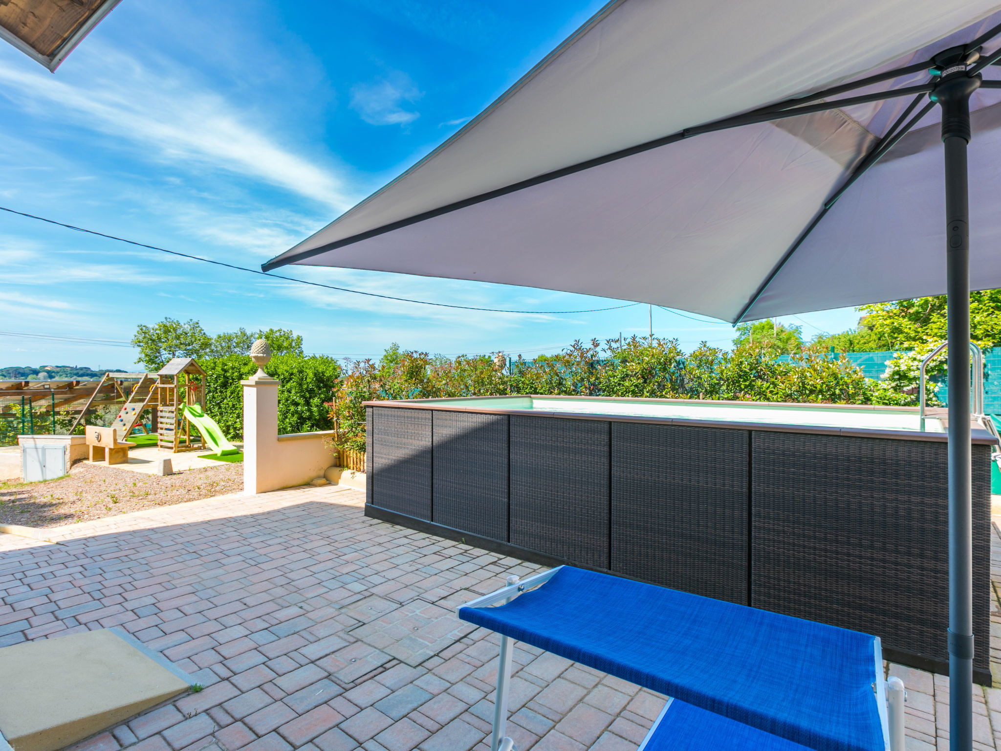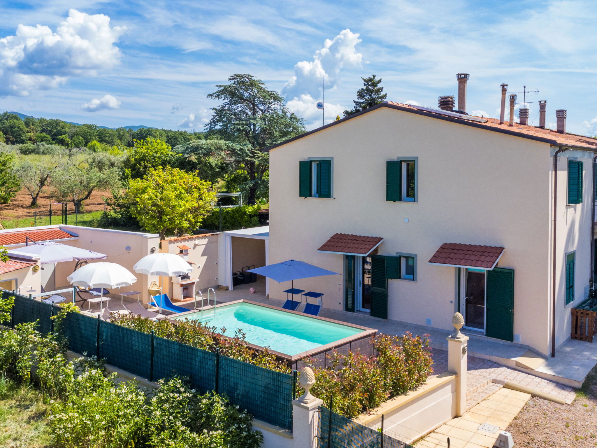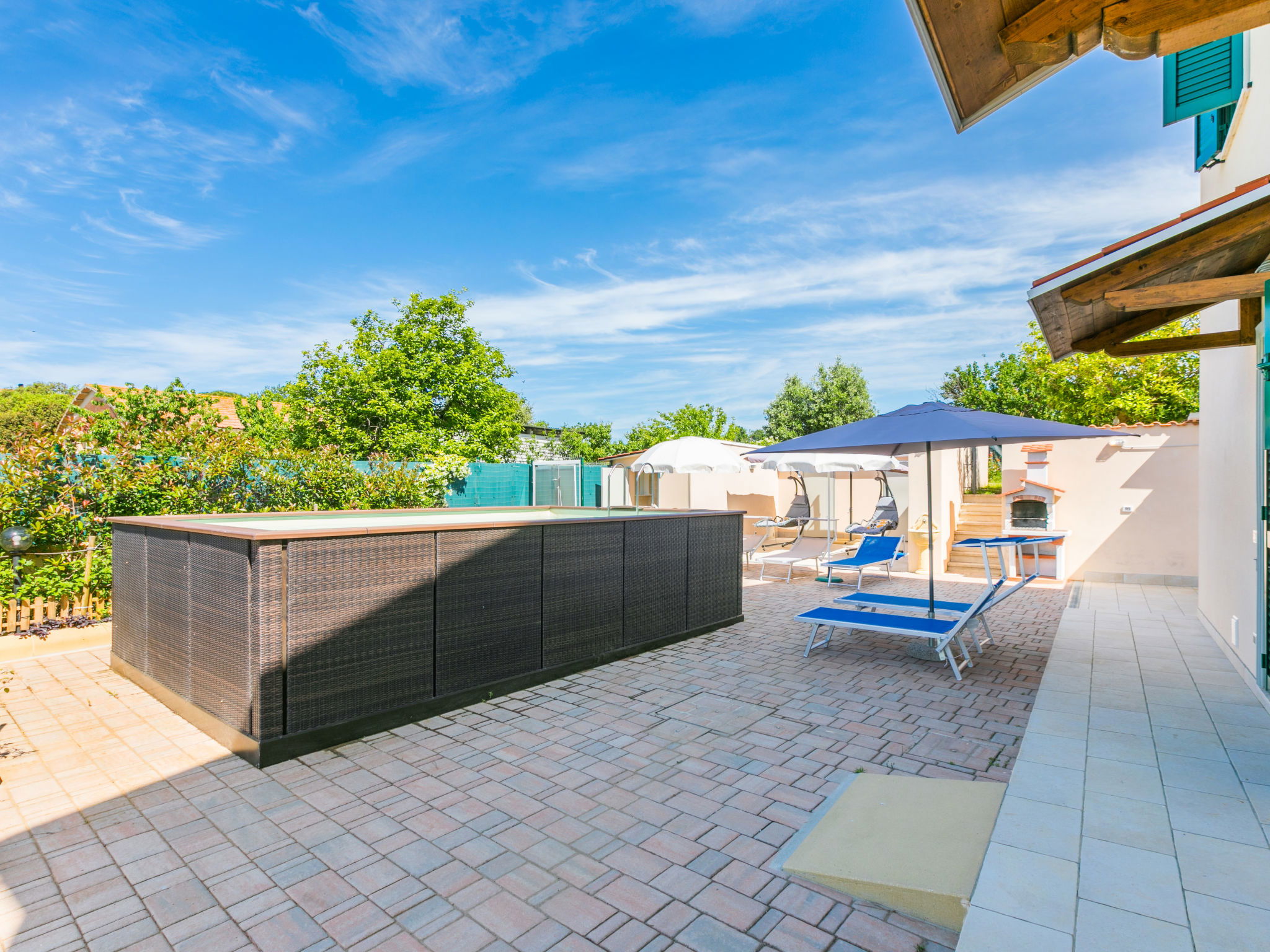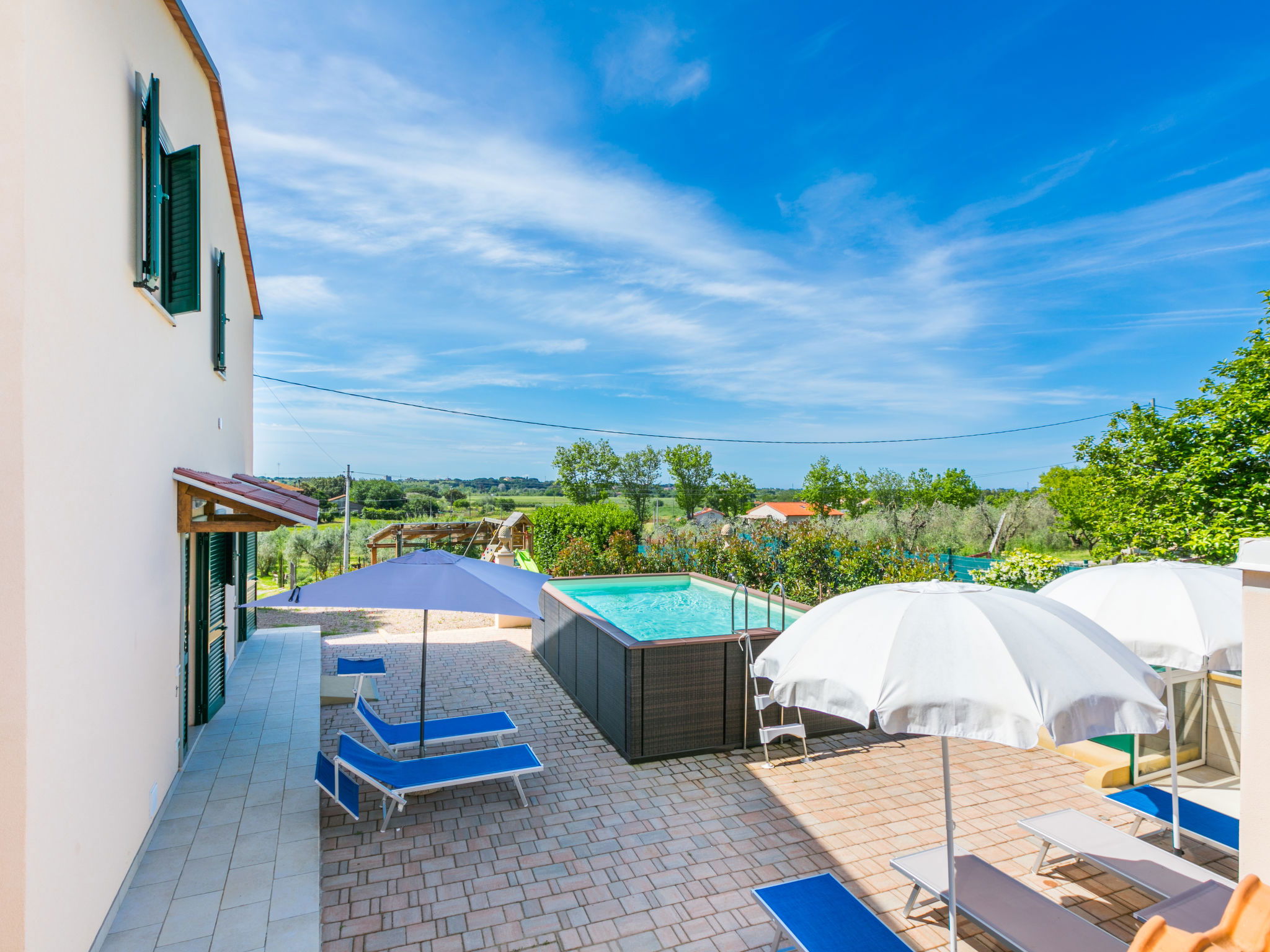 Comfortable house "Da Lisa", 2 storeys, semi-detached, renovated in 2024, surrounded by meadows and fields. 3 km from the centre of San Pietro in Palazzi, 5 km from the centre of Cecina, in an elevated position, 5 km from the sea, 5 km from the beach. Private: property 700 m2 (fenced), swimming pool (above ground) (3 x 5 m, depth 120 - 120 cm, seasonal availability: 12.Apr. - 13.Oct.). Shower/WC in the pool area, terrace (100 m2), garden furniture, barbecue, children's playground. Linen change (suppl. charge extra). Towel change (suppl. charge extra). Storeroom available. Roofed, parking (for 2 cars). E-charging station. Shop 1 km, supermarket 1 km, restaurant 1 km, bakery 1 km, bus stop "Sp 68 - Bivio Loc. Giardino" 90 m, railway station "Cecina" 5 km, thermal baths "Calidario" 35 km. Marina 6 km. Nearby attractions: Pisa 50 km, Lucca 70 km, Firenze 112 km.