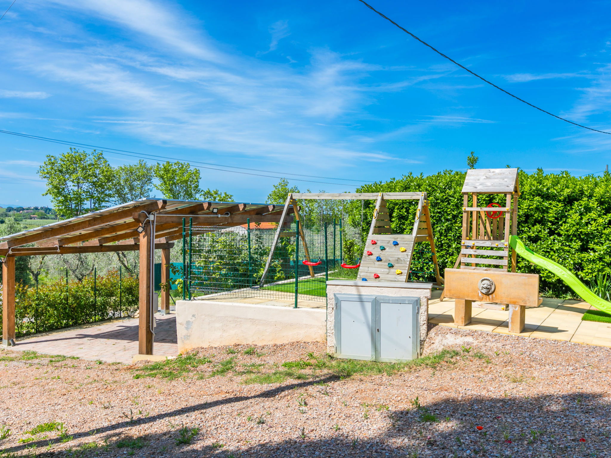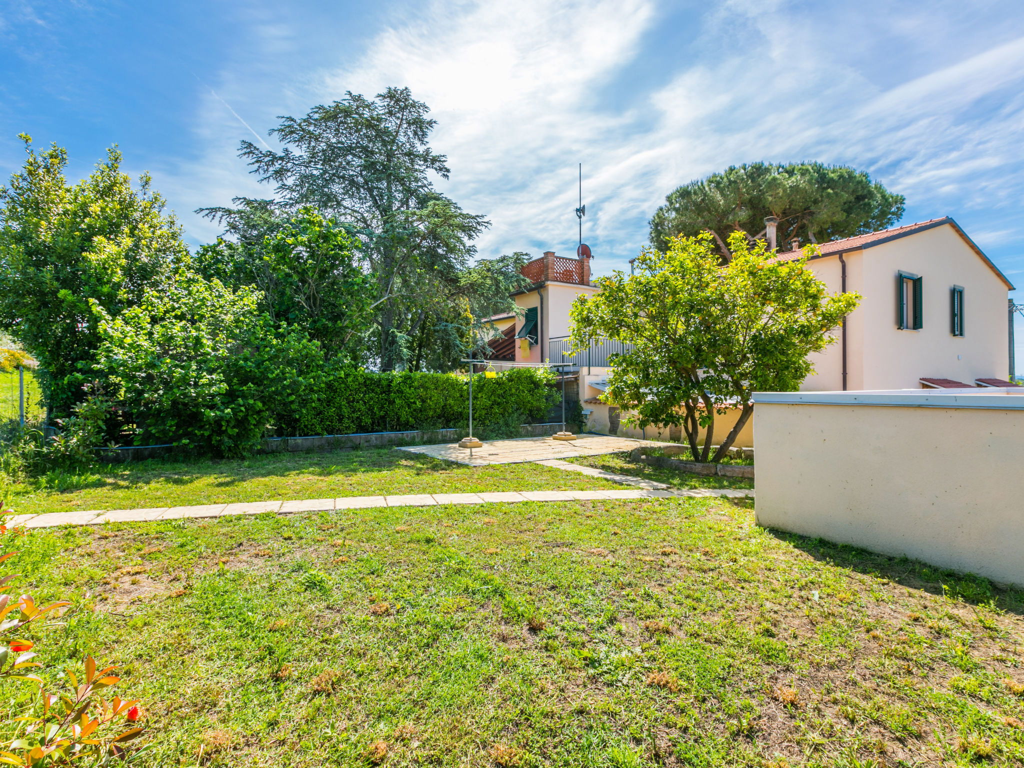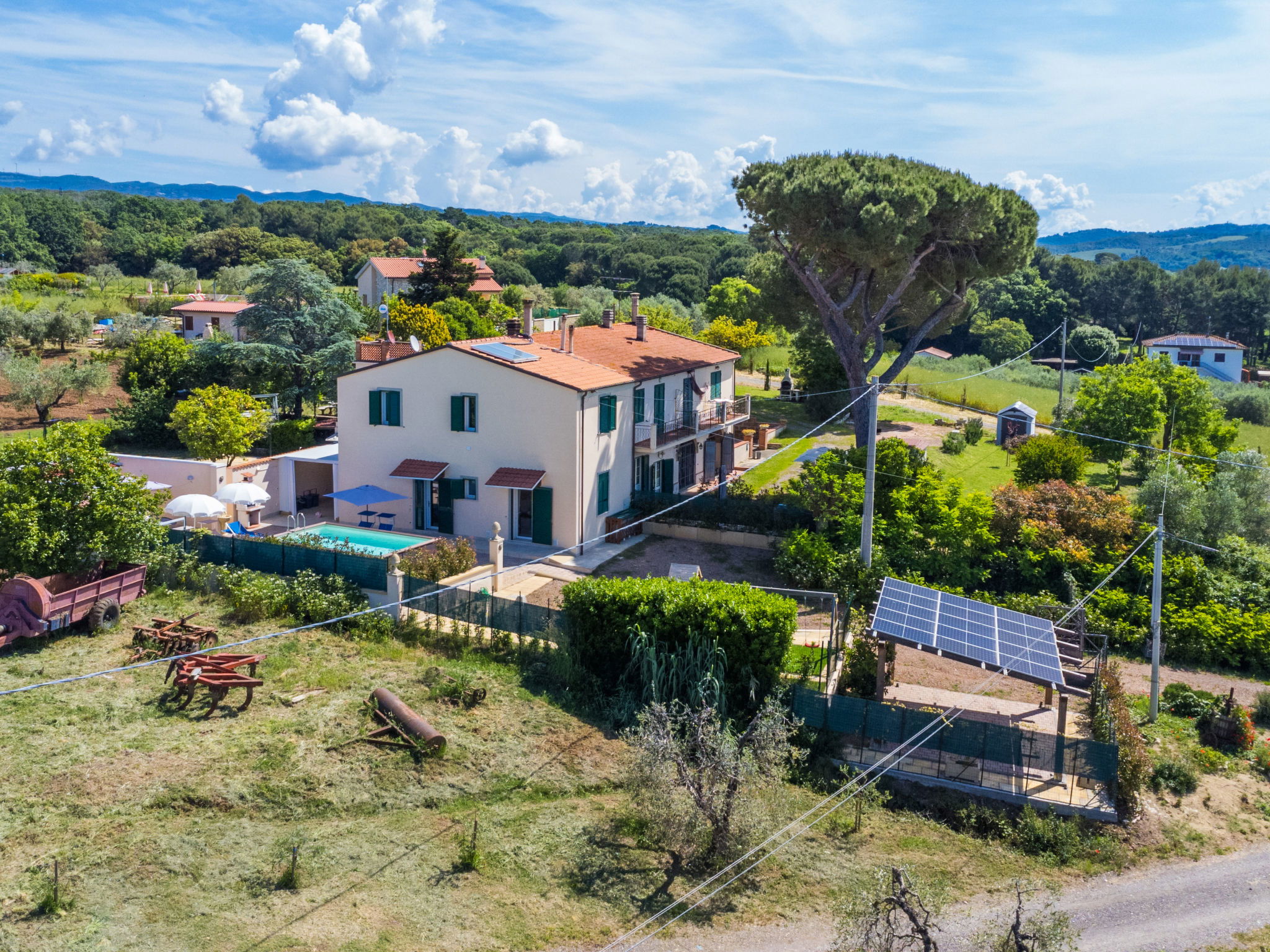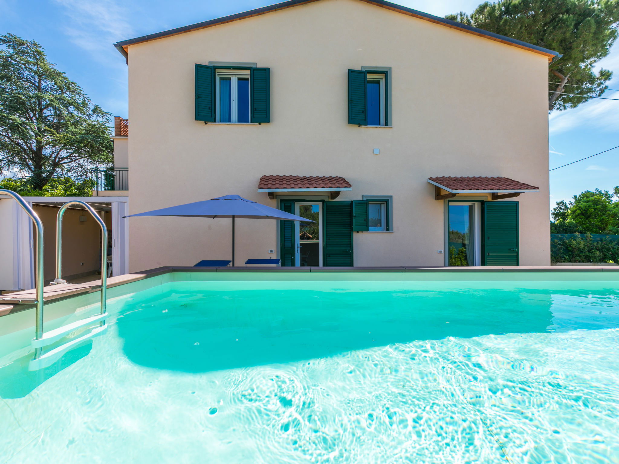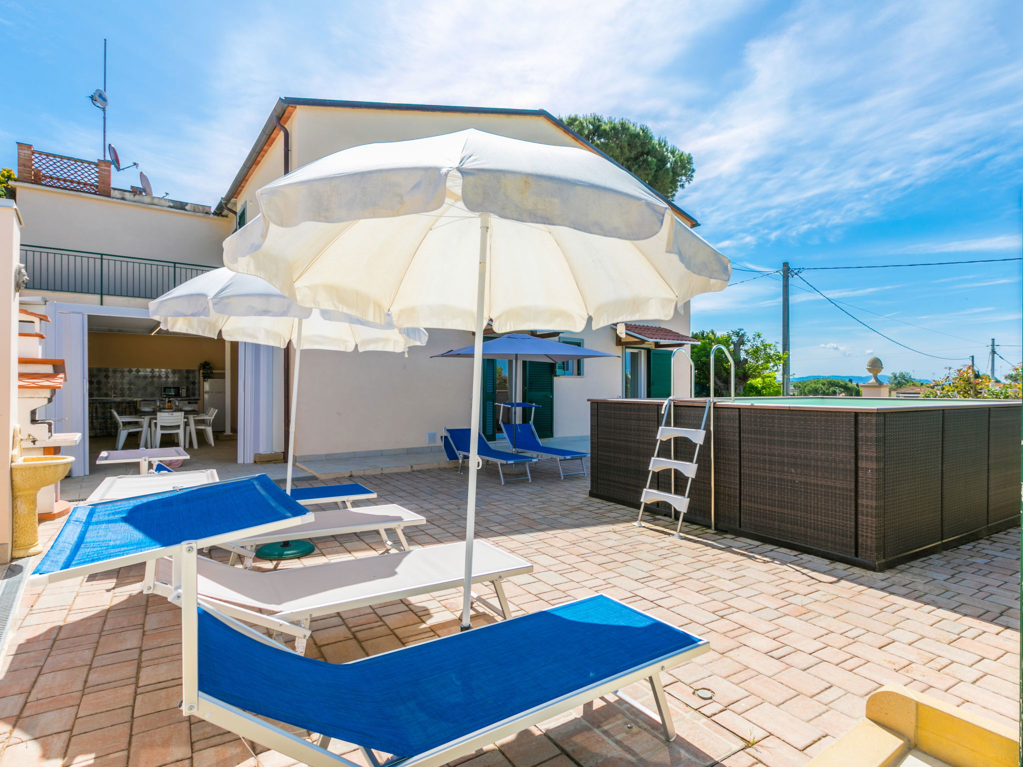 Comfortable house "Da Lisa", 2 storeys, semi-detached, renovated in 2024, surrounded by meadows and fields. 3 km from the centre of San Pietro in Palazzi, 5 km from the centre of Cecina, in an elevated position, 5 km from the sea, 5 km from the beach. Private: property 700 m2 (fenced), swimming pool (above ground) (3 x 5 m, depth 120 - 120 cm, seasonal availability: 12.Apr. - 13.Oct.). Shower/WC in the pool area, terrace (100 m2), garden furniture, barbecue, children's playground. Linen change (suppl. charge extra). Towel change (suppl. charge extra). Storeroom available. Roofed, parking (for 2 cars). E-charging station. Shop 1 km, supermarket 1 km, restaurant 1 km, bakery 1 km, bus stop "Sp 68 - Bivio Loc. Giardino" 90 m, railway station "Cecina" 5 km, thermal baths "Calidario" 35 km. Marina 6 km. Nearby attractions: Pisa 50 km, Lucca 70 km, Firenze 112 km.