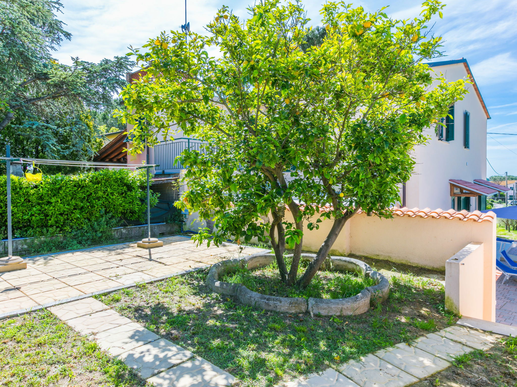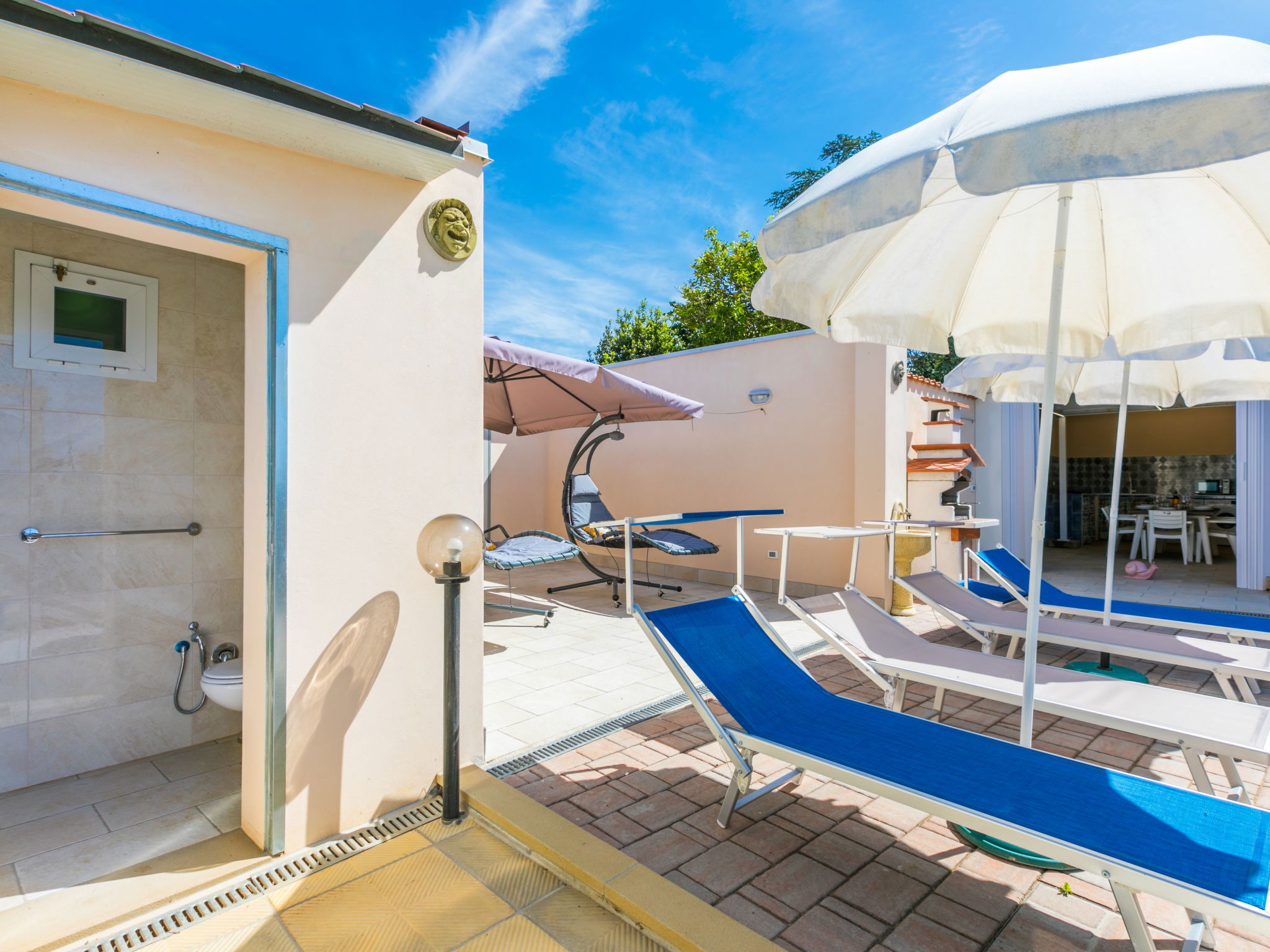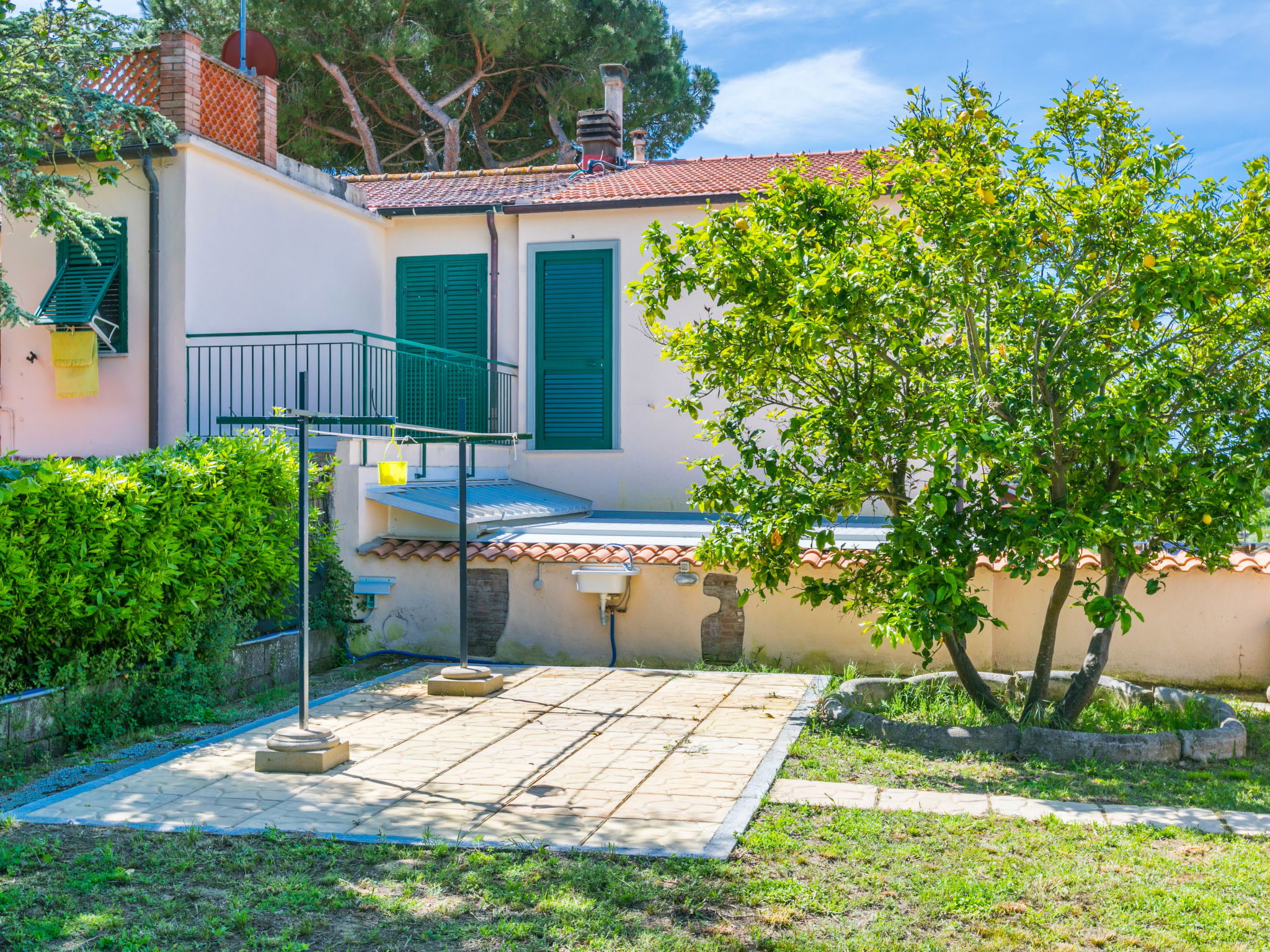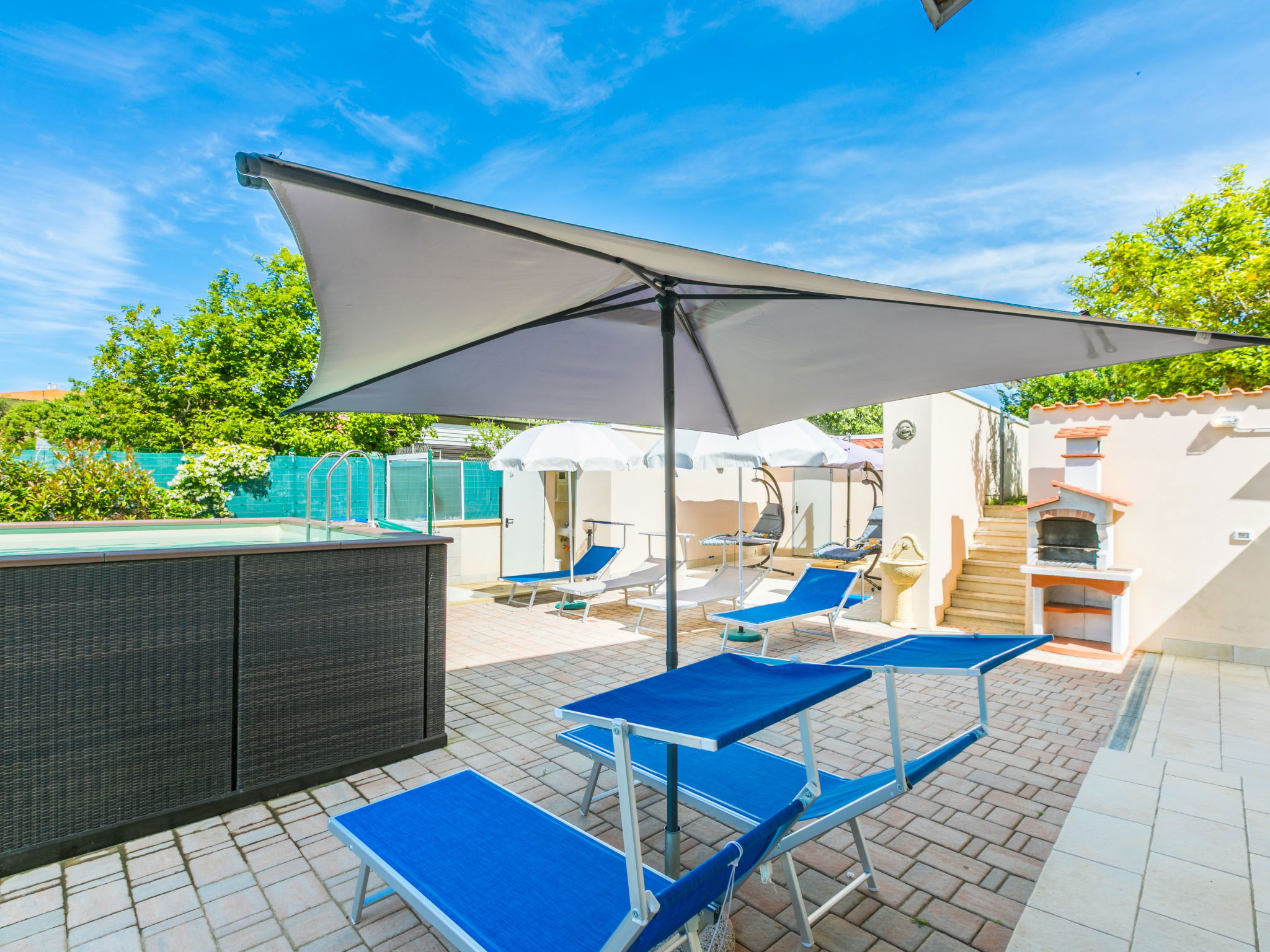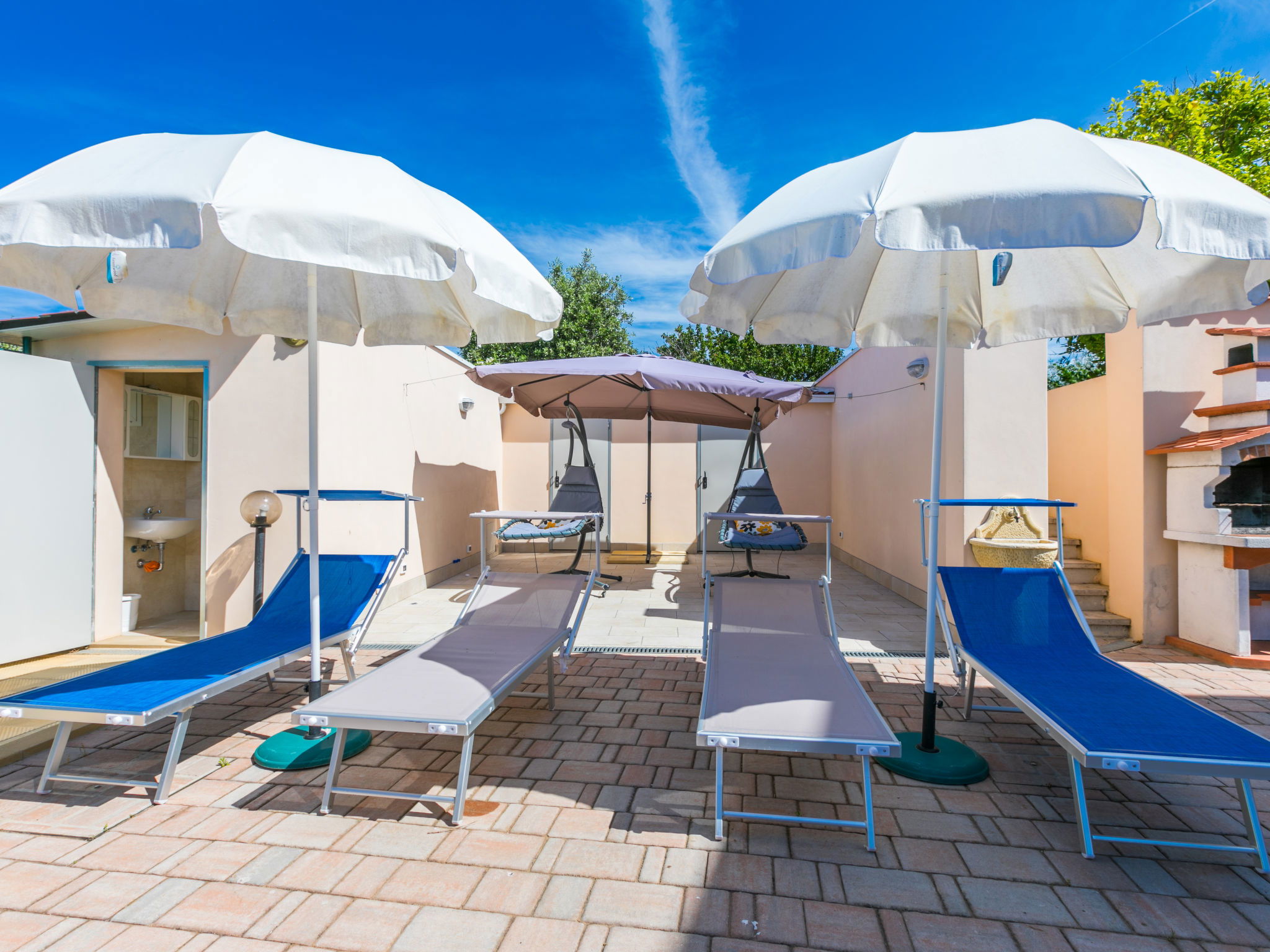 4-room house 110 m2 on 2 levels. Fully renovated in 2024, beautiful and modern furnishings: living/dining room with dining table. Exit to the terrace. 1 room with 1 double sofabed and TV. Exit to the garden. Open kitchen (oven, dishwasher, 4 induction hot plates, toaster, kettle, electric coffee machine). Exit to the terrace. Shower/bidet/WC. Electric heating, air-conditioning. Upper floor: 1 double bedroom with 1 double bed and TV. 1 double bedroom with 2 beds. (ladder) gallery. Shower/bidet/WC. Electric heating, air-conditioning. Large terrace 35 m2 partly roofed. Barbecue, deck chairs (6). Facilities: washing machine, iron, mosquito net, children's high chair, baby cot for up to 2 year olds, hair dryer. Internet (WiFi, free). Parking (roofed, fenced 2 cars). E-charging station. Please note: non-smokers only. Maximum 2 pets/ dogs allowed. Private entrance, fire extinguisher. complete outdoor kitchen (2 plates, microwave, dishwasher, washing machine, fridge). IT050030C2VXQG94XA