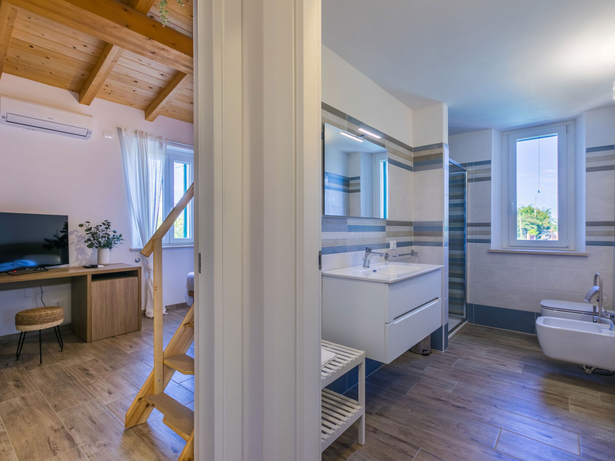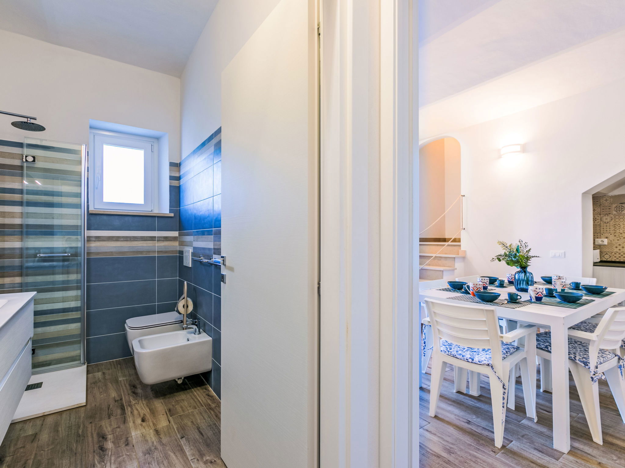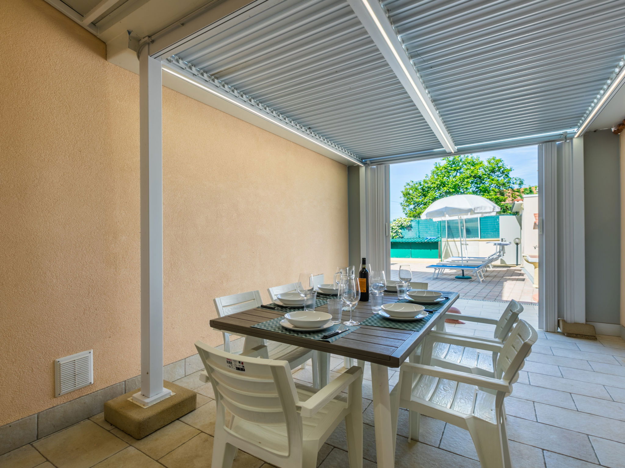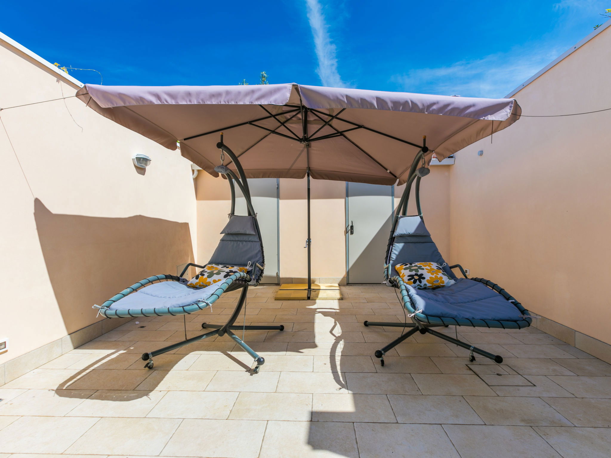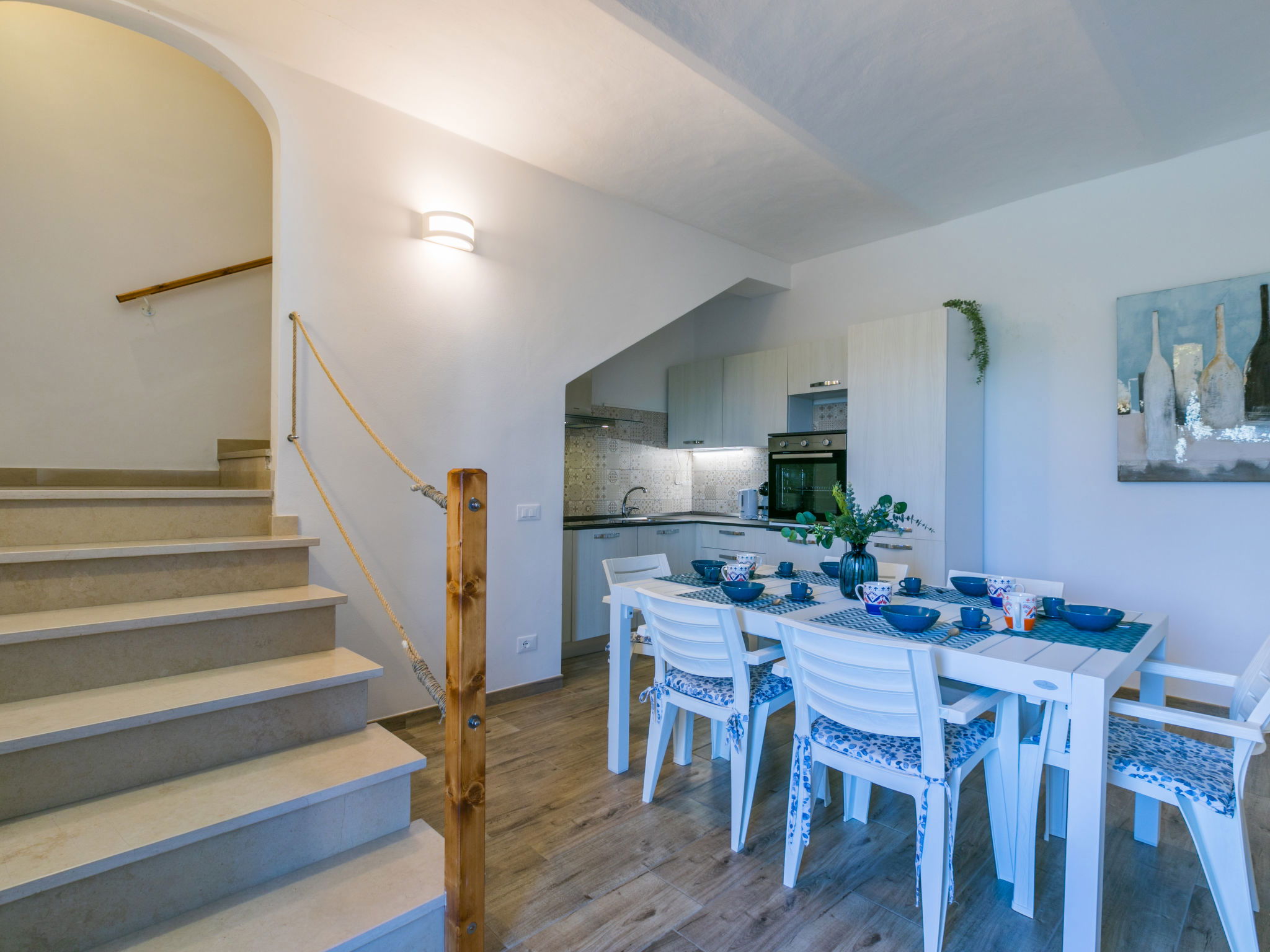 4-room house 110 m2 on 2 levels. Fully renovated in 2024, beautiful and modern furnishings: living/dining room with dining table. Exit to the terrace. 1 room with 1 double sofabed and TV. Exit to the garden. Open kitchen (oven, dishwasher, 4 induction hot plates, toaster, kettle, electric coffee machine). Exit to the terrace. Shower/bidet/WC. Electric heating, air-conditioning. Upper floor: 1 double bedroom with 1 double bed and TV. 1 double bedroom with 2 beds. (ladder) gallery. Shower/bidet/WC. Electric heating, air-conditioning. Large terrace 35 m2 partly roofed. Barbecue, deck chairs (6). Facilities: washing machine, iron, mosquito net, children's high chair, baby cot for up to 2 year olds, hair dryer. Internet (WiFi, free). Parking (roofed, fenced 2 cars). E-charging station. Please note: non-smokers only. Maximum 2 pets/ dogs allowed. Private entrance, fire extinguisher. complete outdoor kitchen (2 plates, microwave, dishwasher, washing machine, fridge). IT050030C2VXQG94XA