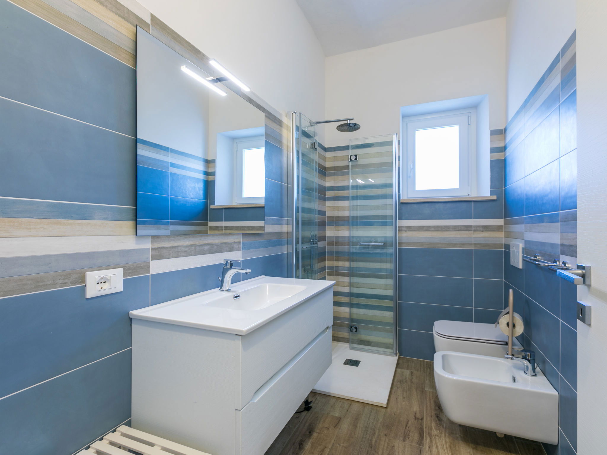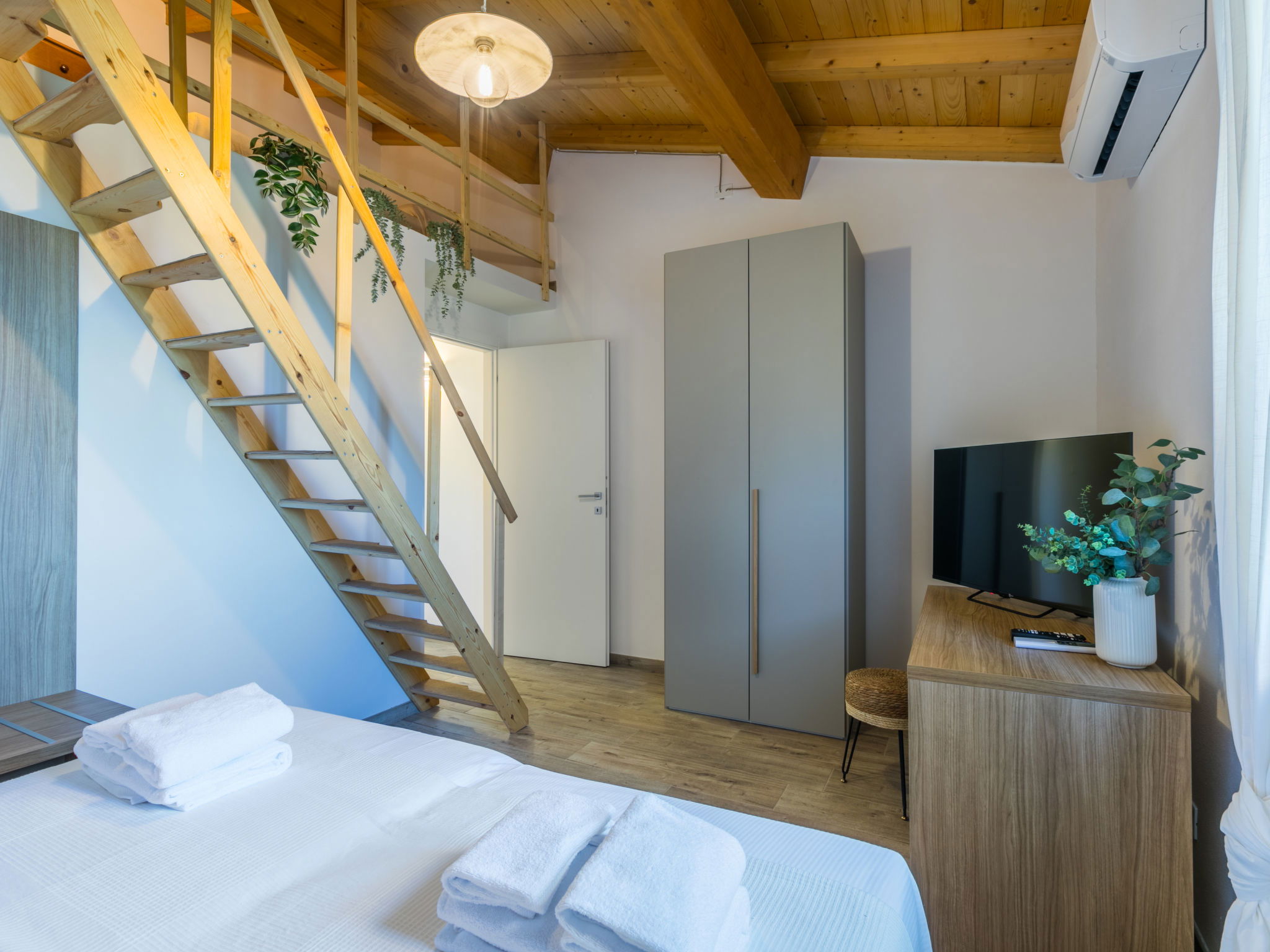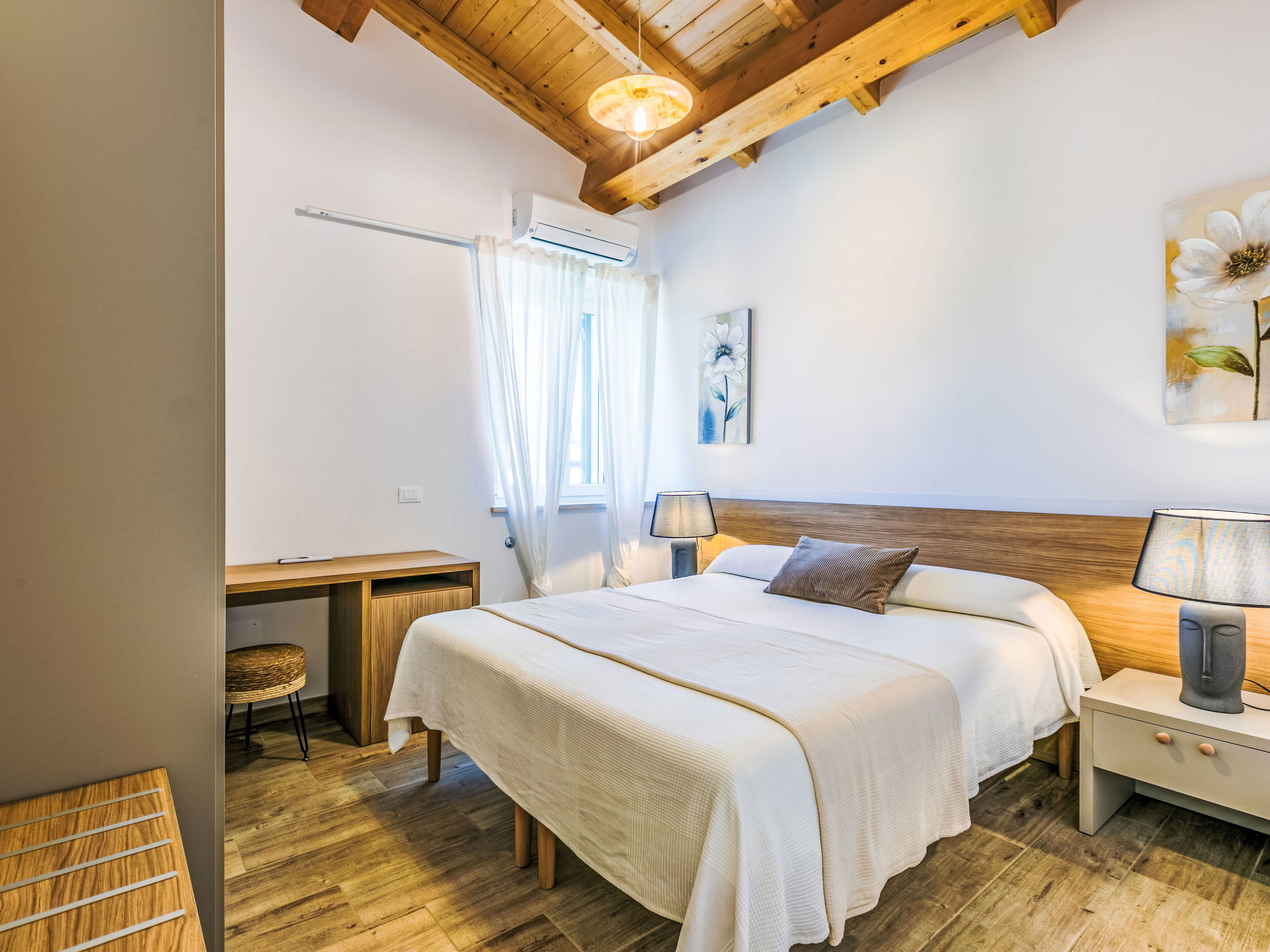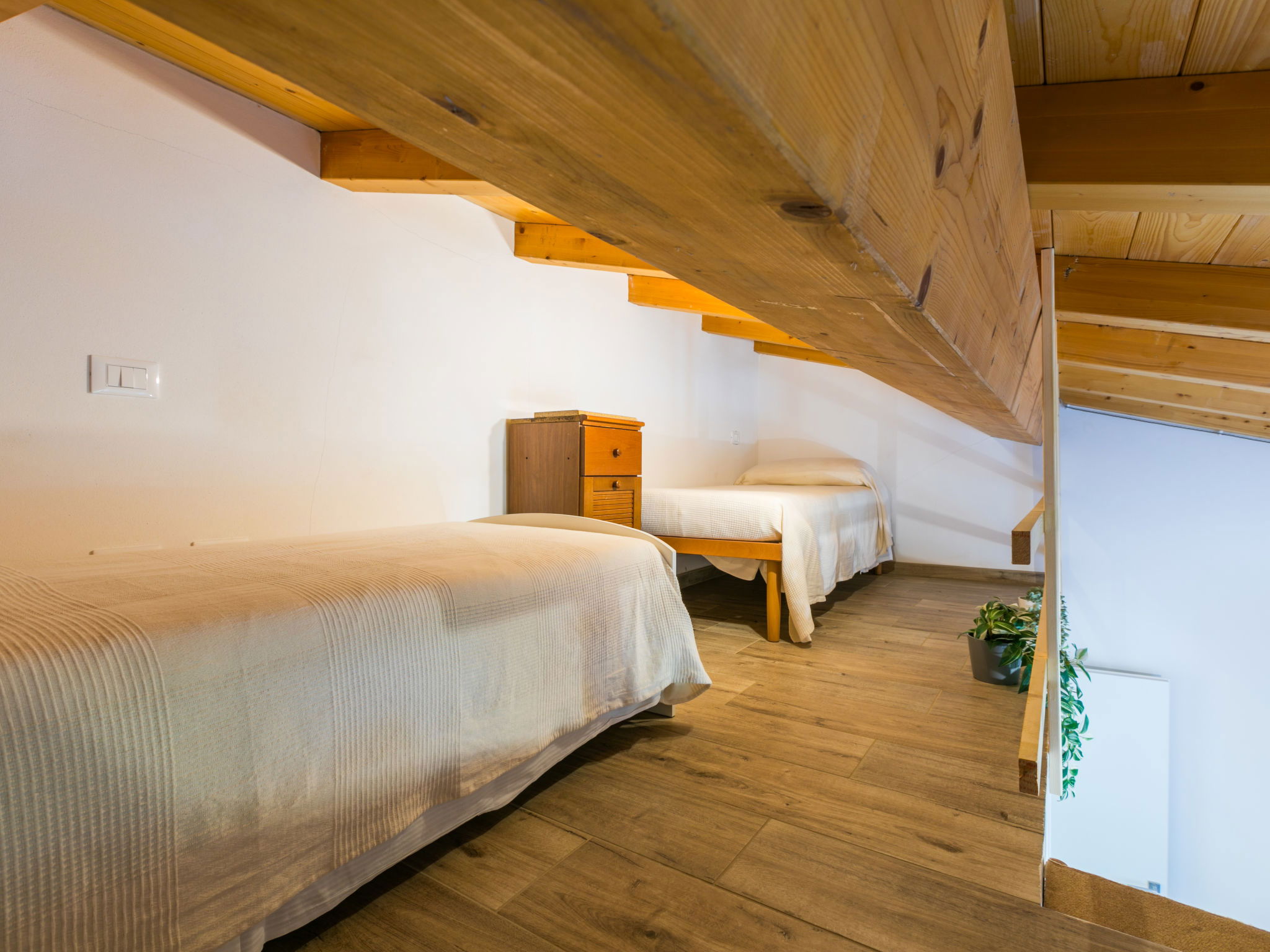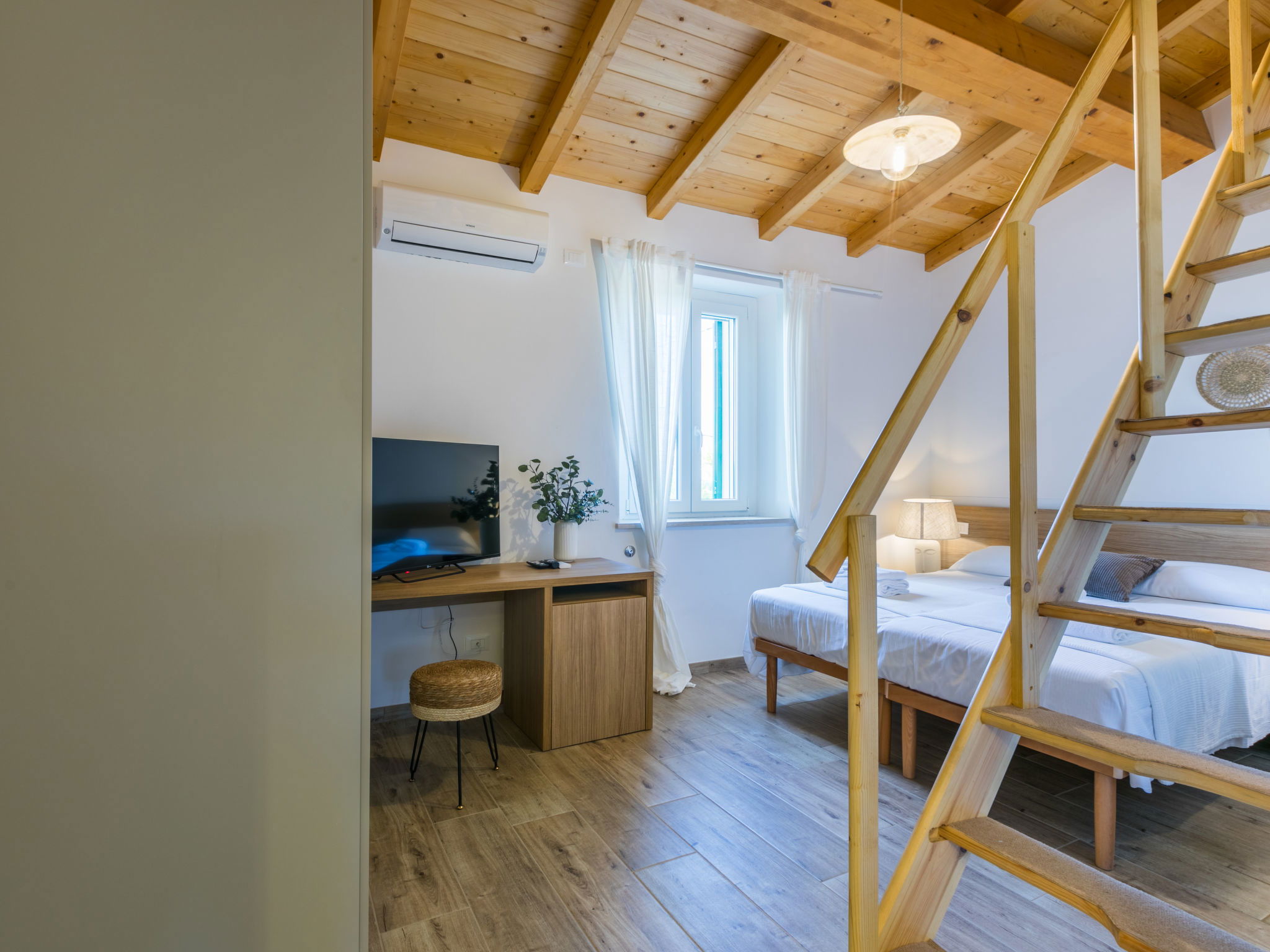4-room house 110 m2 on 2 levels. Fully renovated in 2024, beautiful and modern furnishings: living/dining room with dining table. Exit to the terrace. 1 room with 1 double sofabed and TV. Exit to the garden. Open kitchen (oven, dishwasher, 4 induction hot plates, toaster, kettle, electric coffee machine). Exit to the terrace. Shower/bidet/WC. Electric heating, air-conditioning. Upper floor: 1 double bedroom with 1 double bed and TV. 1 double bedroom with 2 beds. (ladder) gallery. Shower/bidet/WC. Electric heating, air-conditioning. Large terrace 35 m2 partly roofed. Barbecue, deck chairs (6). Facilities: washing machine, iron, mosquito net, children's high chair, baby cot for up to 2 year olds, hair dryer. Internet (WiFi, free). Parking (roofed, fenced 2 cars). E-charging station. Please note: non-smokers only. Maximum 2 pets/ dogs allowed. Private entrance, fire extinguisher. complete outdoor kitchen (2 plates, microwave, dishwasher, washing machine, fridge). IT050030C2VXQG94XA