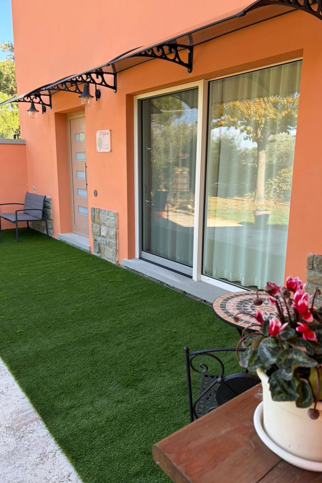 "Il Tiglioré", 3-room house 80 m2, on the ground floor. Bright, fully renovated, modern and tasteful furnishings: living/dining room with dining table and TV (flat screen). Exit to the garden. 2 double bedrooms, each room with air conditioning and forced-air heating. Open kitchen (oven, dishwasher, 4 induction hot plates, toaster, kettle, microwave, electric coffee machine). Exit to the garden. Shower/bidet/WC. Air-conditioning, forced-air heating. Heating available only from 15.10. to 15.04. Large garden, porch. Barbecue, sitting area. Facilities: Internet (WiFi, free). Parking. Maximum 1 small pet/ dog allowed. IT051012C2BDTKR6JI