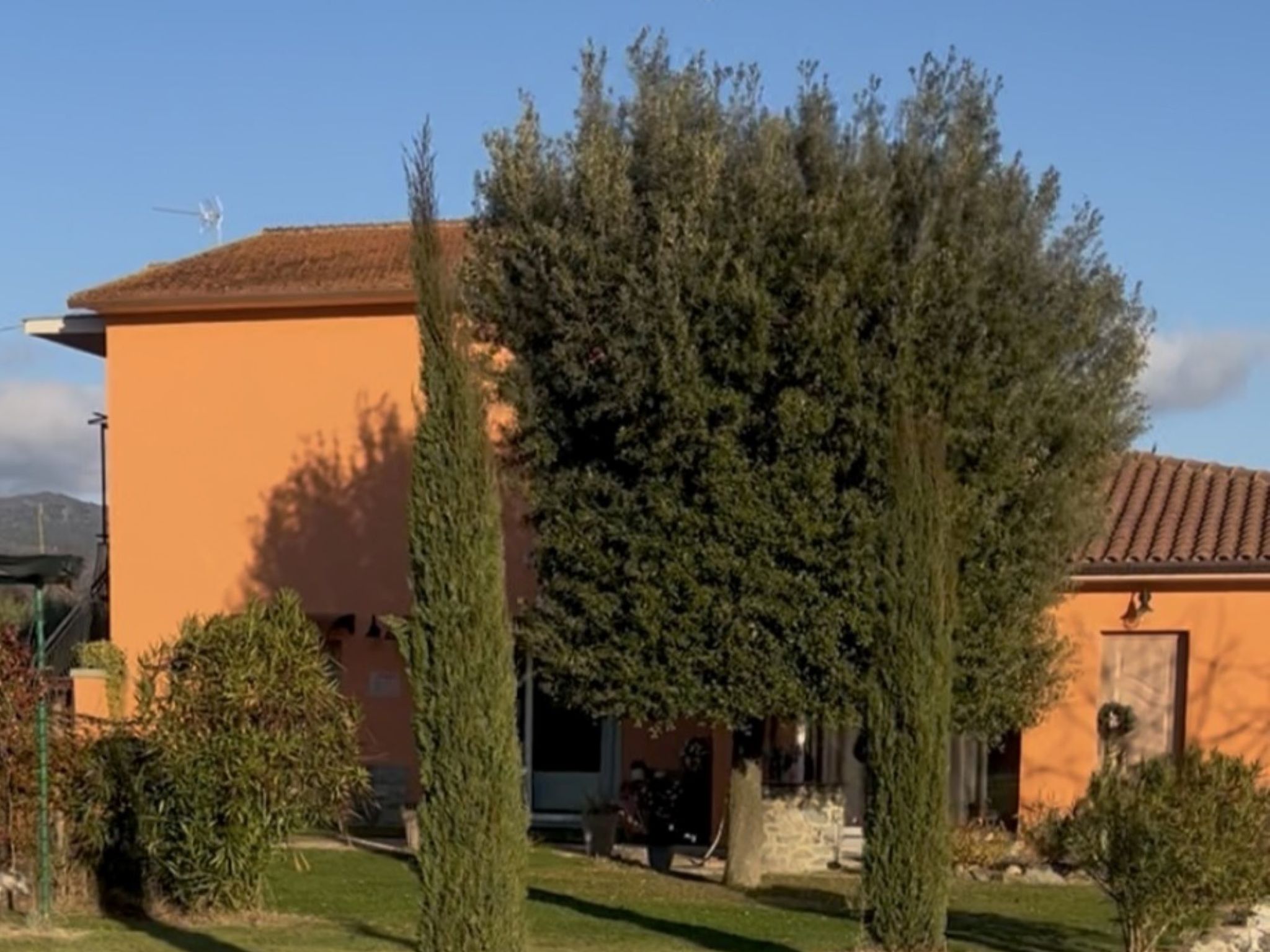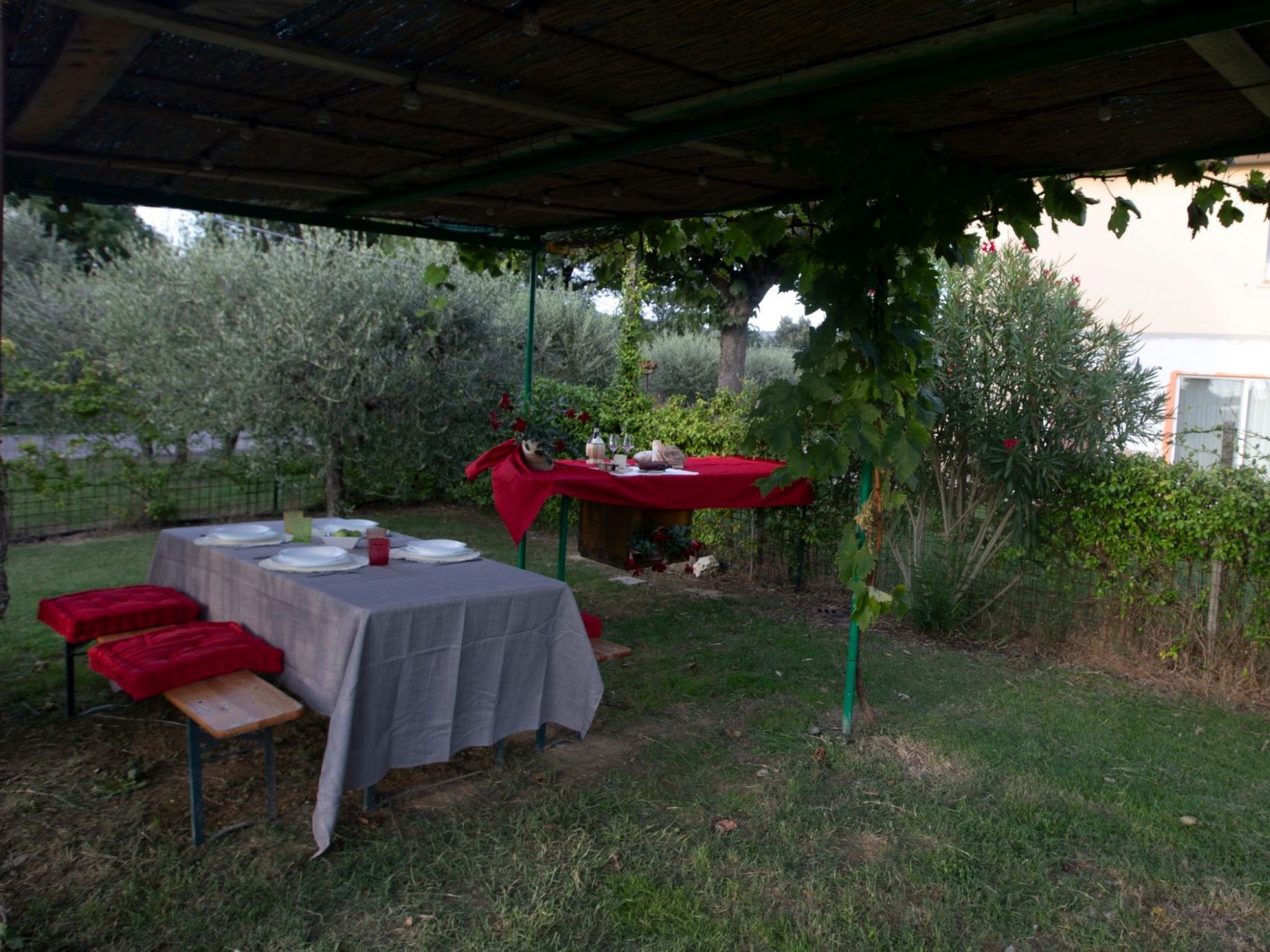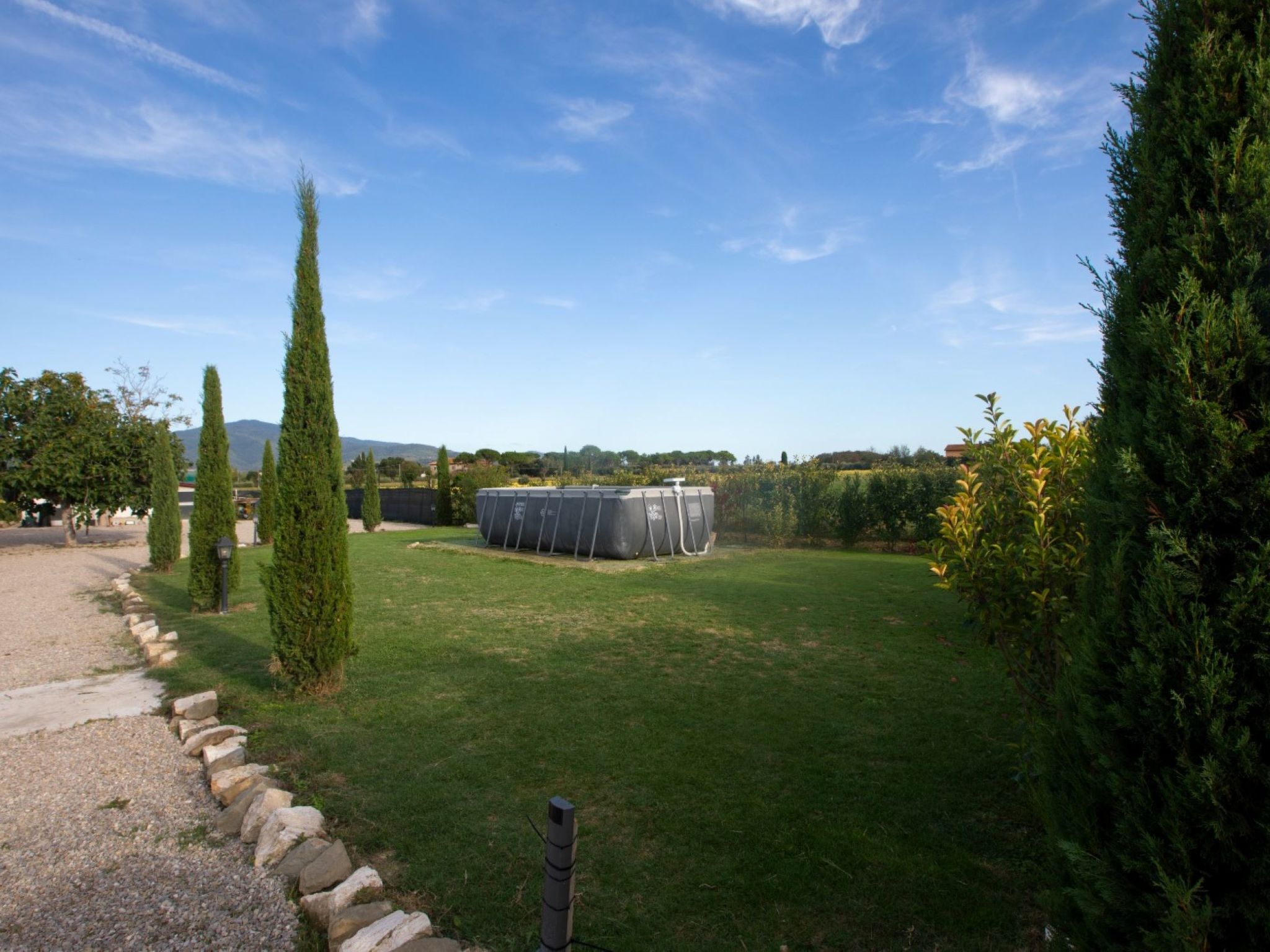 Modern, cosy house "Il Tiglioré", semi-detached, renovated, surrounded by fields. 5 km from the centre of Castiglion Fiorentino. Private: well-kept garden (fenced) with wildlife garden and trees, swimming pool (above ground) (6 x 3 m, depth 132 cm, seasonal availability: 01.Jun. - 31.Aug.). Arbour, garden furniture, barbecue, parking on the premises. Supermarket 3.3 km, restaurant 3 km, bus stop 600 m. Nearby attractions: Cortona 16 km, Arezzo 19 km, Montepulciano 33 km, Firenze 99 km. Well-known lakes can easily be reached: Lago Trasimeno 40 km. Please note: car recommended. The owner lives in the same residence.