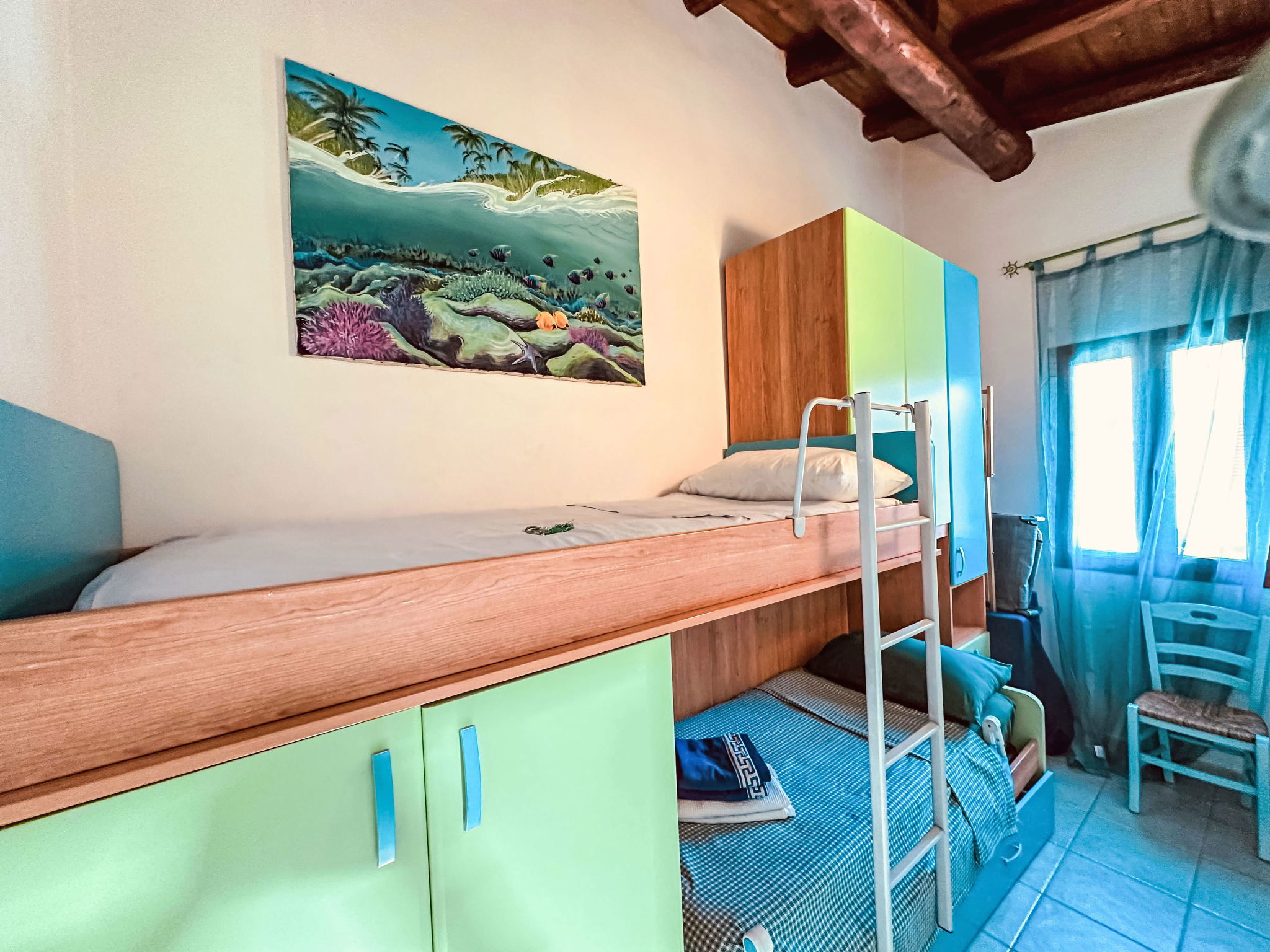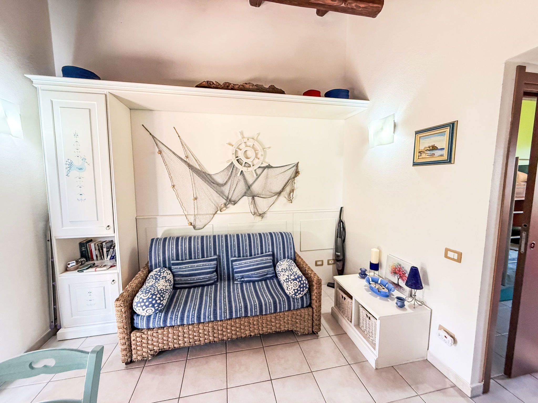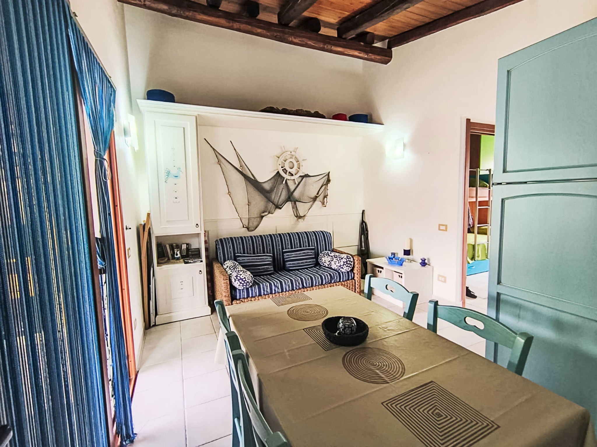 "Azzurra", 3-room terraced house 50 m2, on the ground floor. Beautiful and cosy furnishings: living/dining room with TV (flat screen), air conditioning. Exit to the garden. 1 room with 1 double bed and air conditioning. Exit to the garden. 1 room, 1 bunk beds. Kitchenette (oven, 4 gas rings, toaster, kettle). Shower/bidet/WC. Small garden. Terrace furniture, barbecue, conservatory. Facilities: washing machine, iron, hair dryer. Maximum 1 small pet/ dog allowed. IT000000C0000T0000