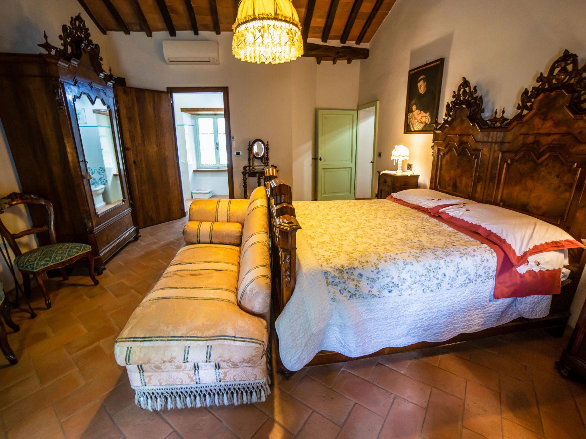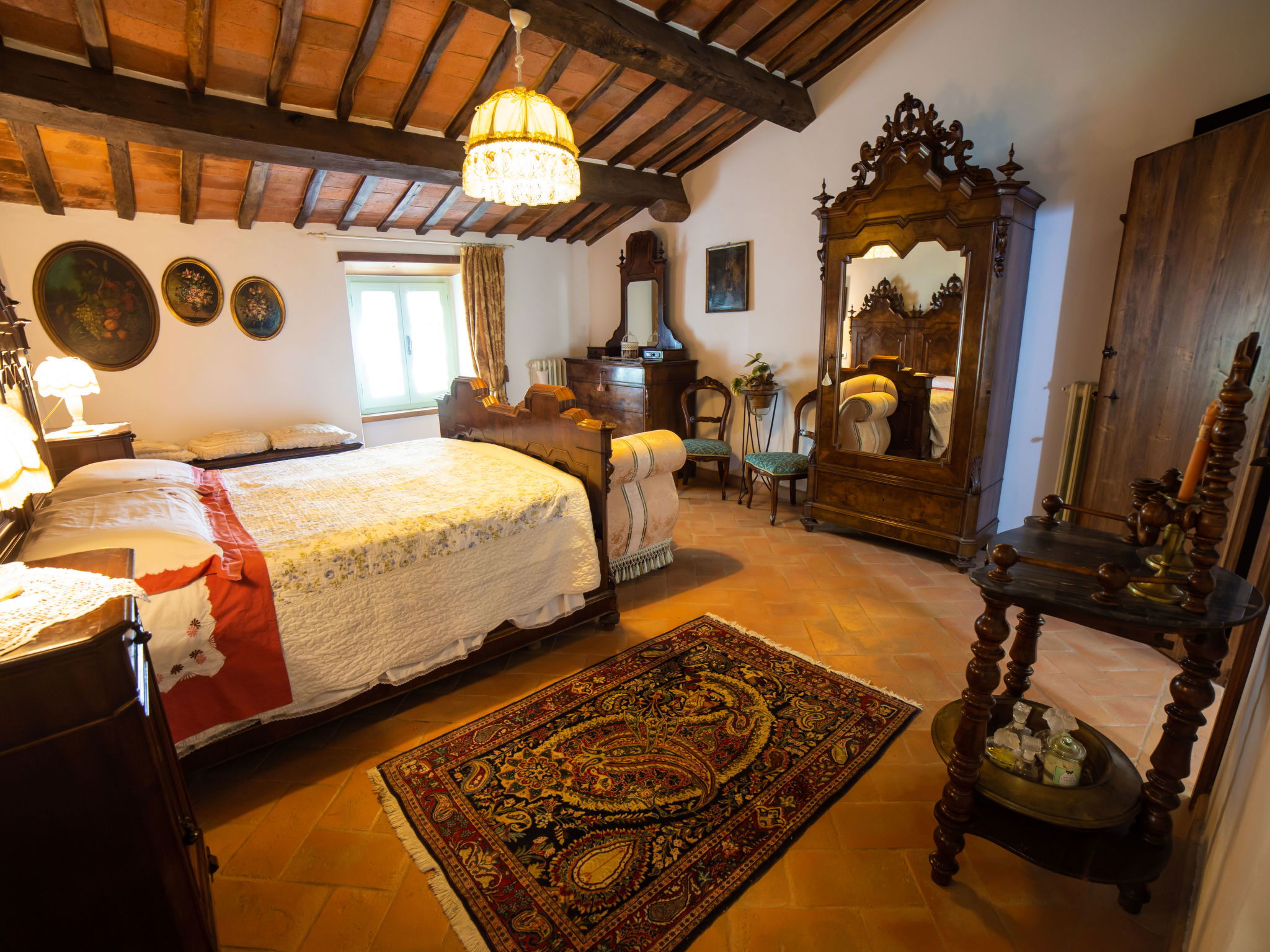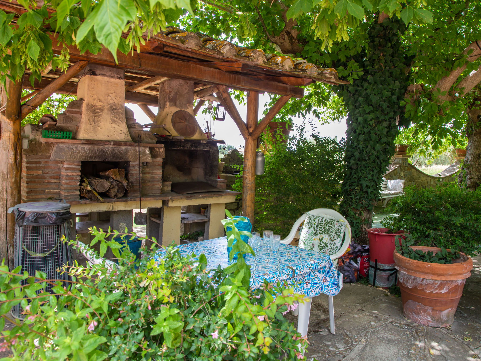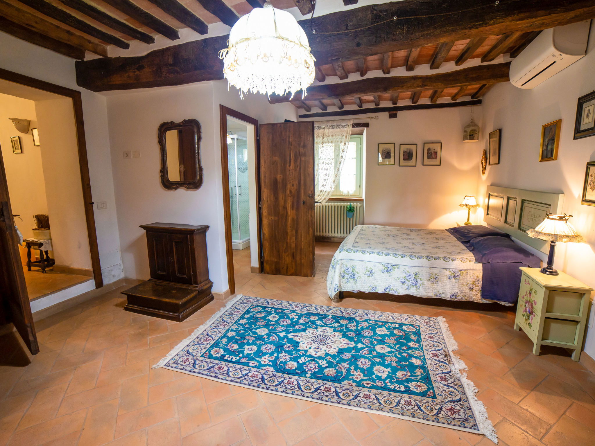 9-room house 328 m2 on 3 levels. Antique and stylish furnishings: open large living/dining room with open-hearth fireplace and TV (flat screen). 1 room with 1 bed. Walk-through room with 1 double bed, shower/bidet/WC and TV (flat screen), air conditioning. Exit to the garden. 1 double bedroom with shower/bidet/WC and TV (flat screen), air conditioning. Exit to the garden. 1 double bedroom with shower/bidet/WC and air conditioning. Large kitchenette (oven, dishwasher, toaster, microwave). Shower/bidet/WC. Upper floor: (spiral staircase), 1 double bedroom with shower/bidet/WC. (exterior staircase) living room with TV (flat screen). 1 double bedroom with TV (flat screen), air conditioning. 1 double bedroom with shower/bidet/WC and TV (flat screen), air conditioning. Kitchen (4 hot plates, mini-oven, oven) with dining table. Bath/bidet/WC. 2nd upper floor: (spiral staircase), 1 room with sloping ceilings with 2 beds and TV (flat screen), air conditioning. View of the countryside. Facilities: washing machine, hair dryer. Internet (WiFi). Maximum 1 pet/ dog allowed. IT051017C2N4ARYSWE