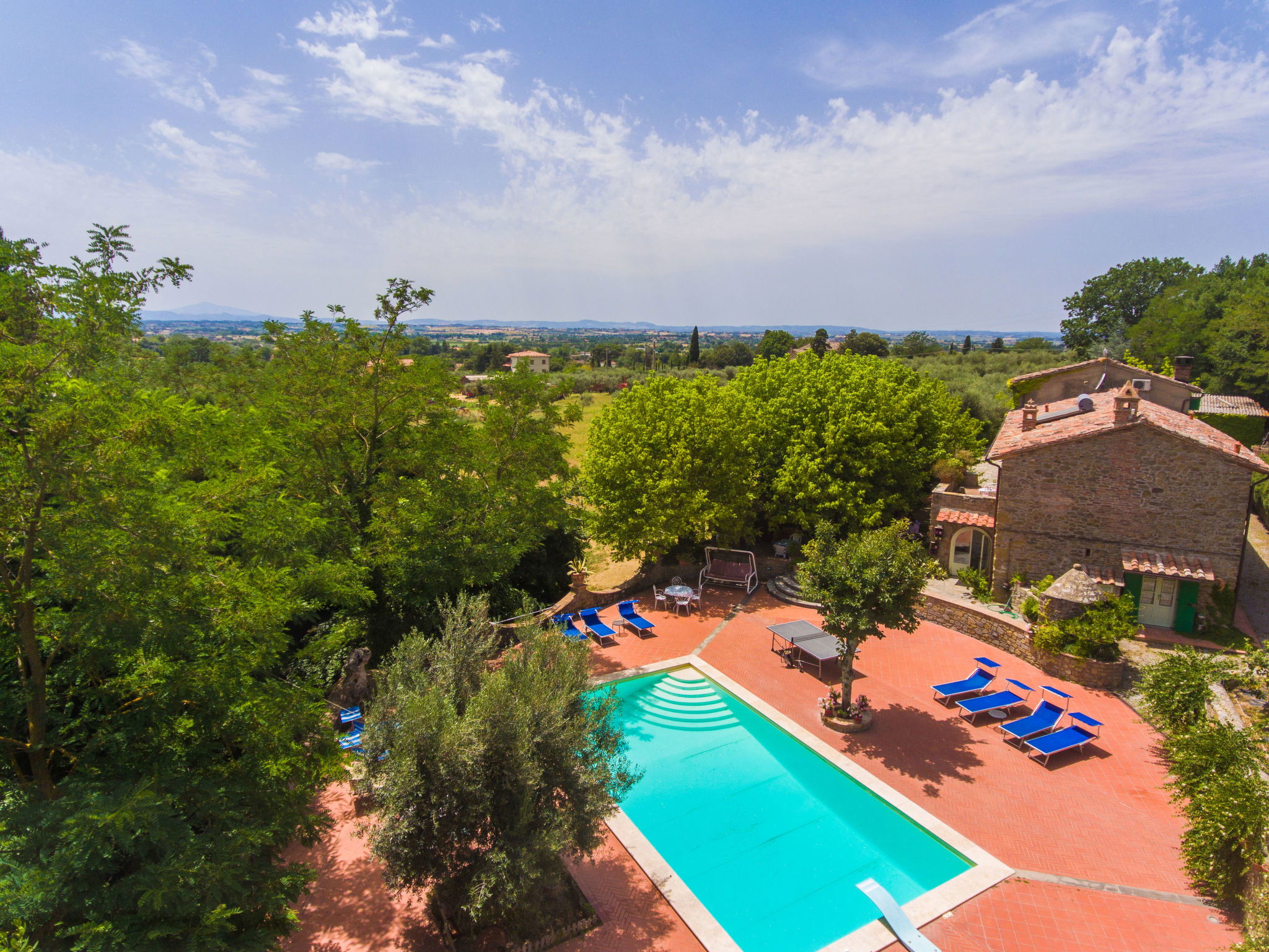 Beautiful, cosy country house "Il Cherubino", detached, surrounded by fields. 3 km from the centre of Cortona, 13 km from the lake, in the countryside. Private: garden 1'000 m2 (not fenced), swimming pool (6 x 12 m, depth 140 - 200 cm, seasonal availability: 01.May. - 30.Oct.). Outdoor shower, table tennis, garden furniture, barbecue, fireplace. Cook on request (extra). Motor access (100 m via unmade road). Parking on the premises. Grocery 3 km, supermarket 3 km, restaurant 2 km, bus stop 1 km, railway station "Camucia" 3 km, thermal baths "Rapolano Terme" 46 km, bathing lake "Trasimeno" 13 km. Nearby attractions: Castiglion Fiorentino 14 km, Castiglione Del Lago 16 km, Passignano Sul Trasimeno 19 km, Arezzo 26 km, Montepulciano 30 km, Pienza 46 km. Please note: car recommended. The owner does not accept any youth groups. The buildings in the pool area are neither inhabited nor accessible by customers or owners.
