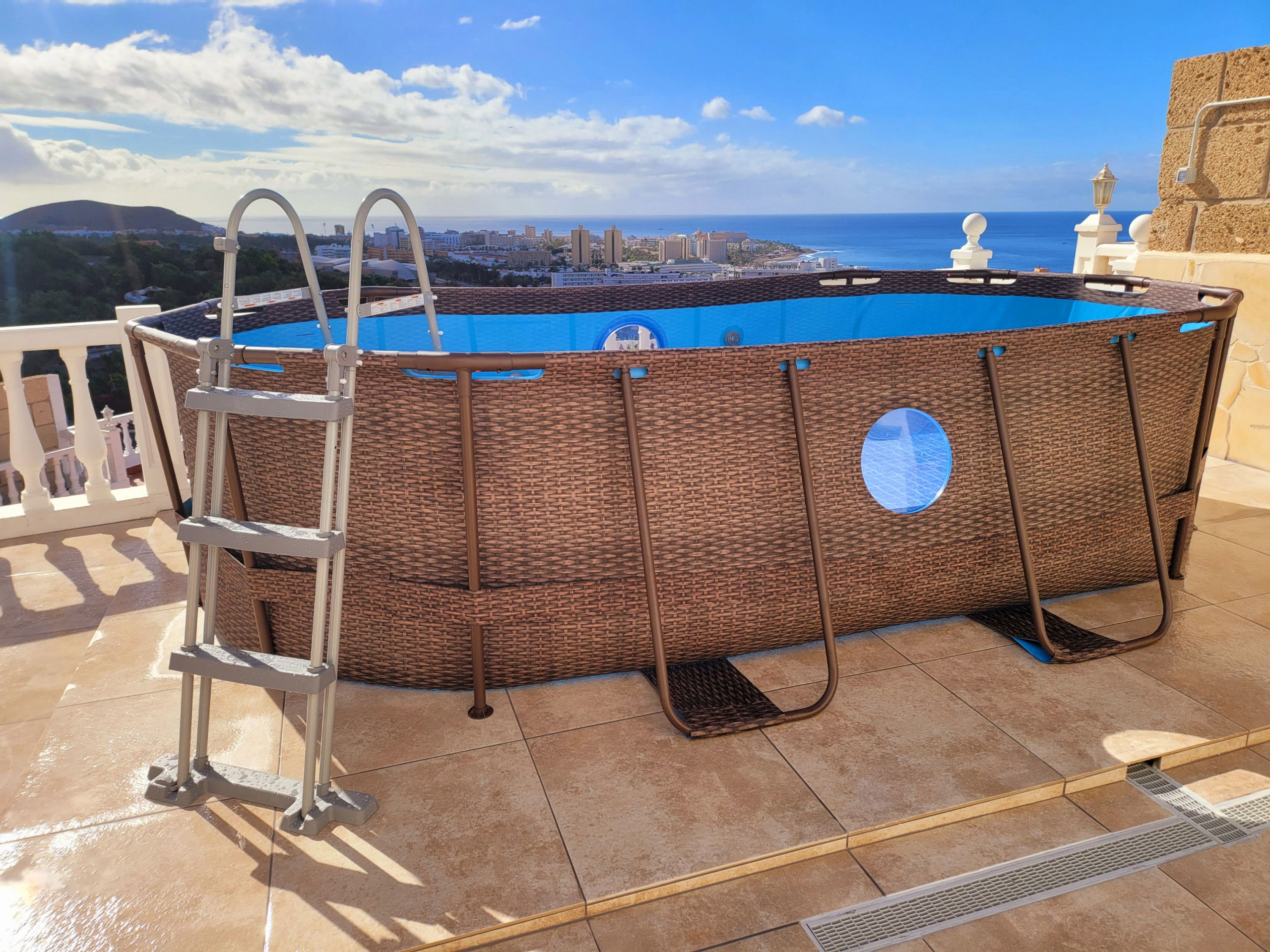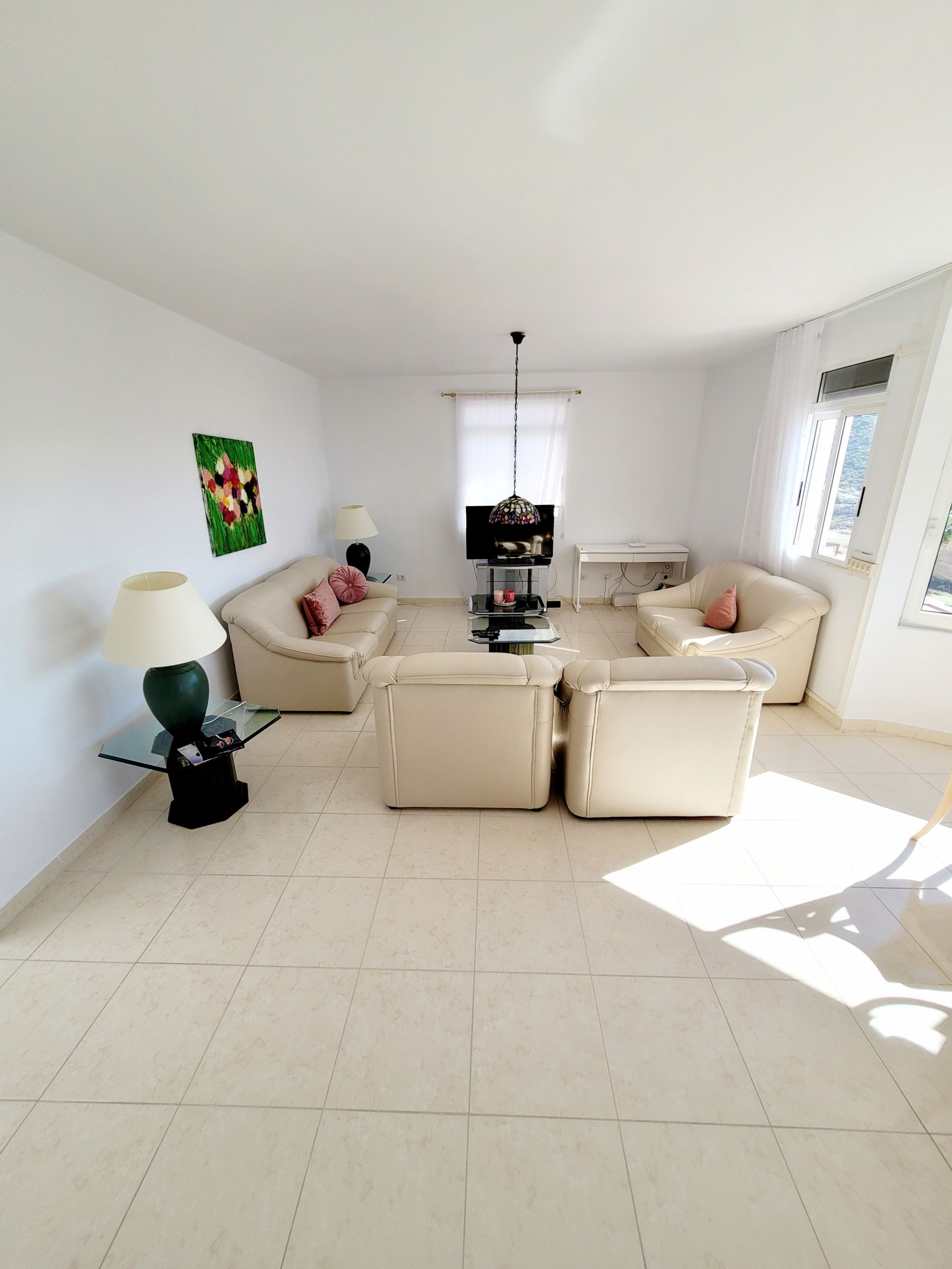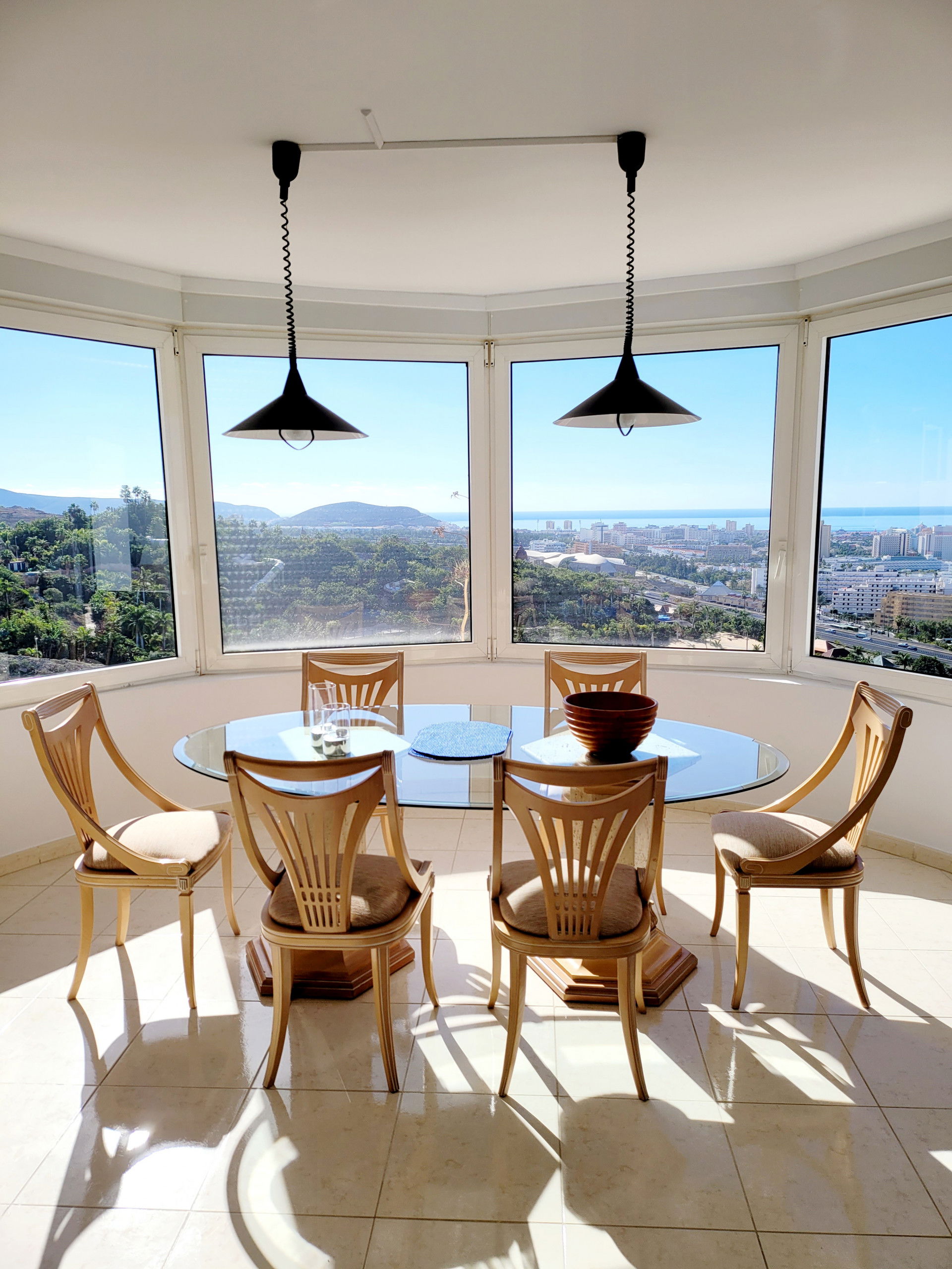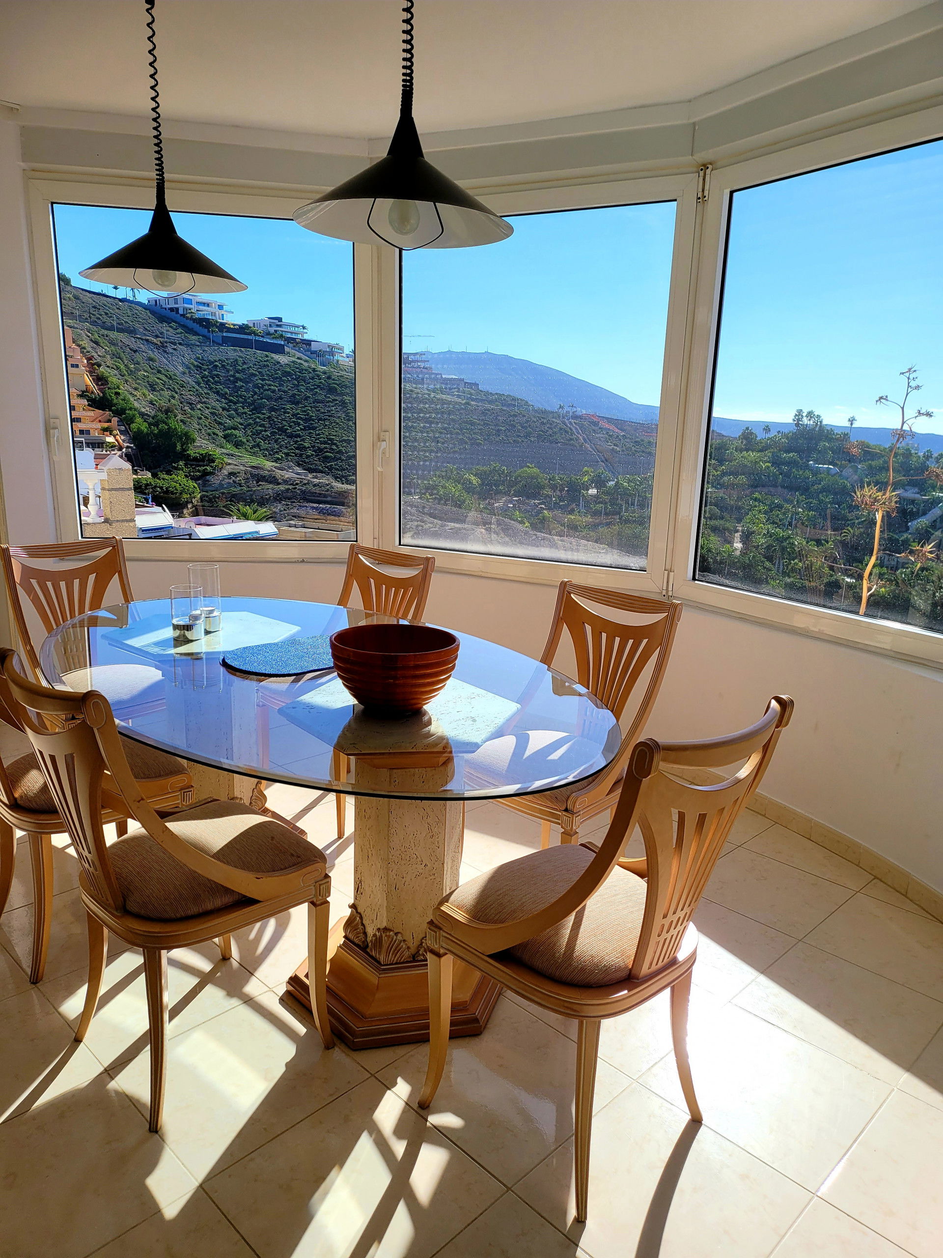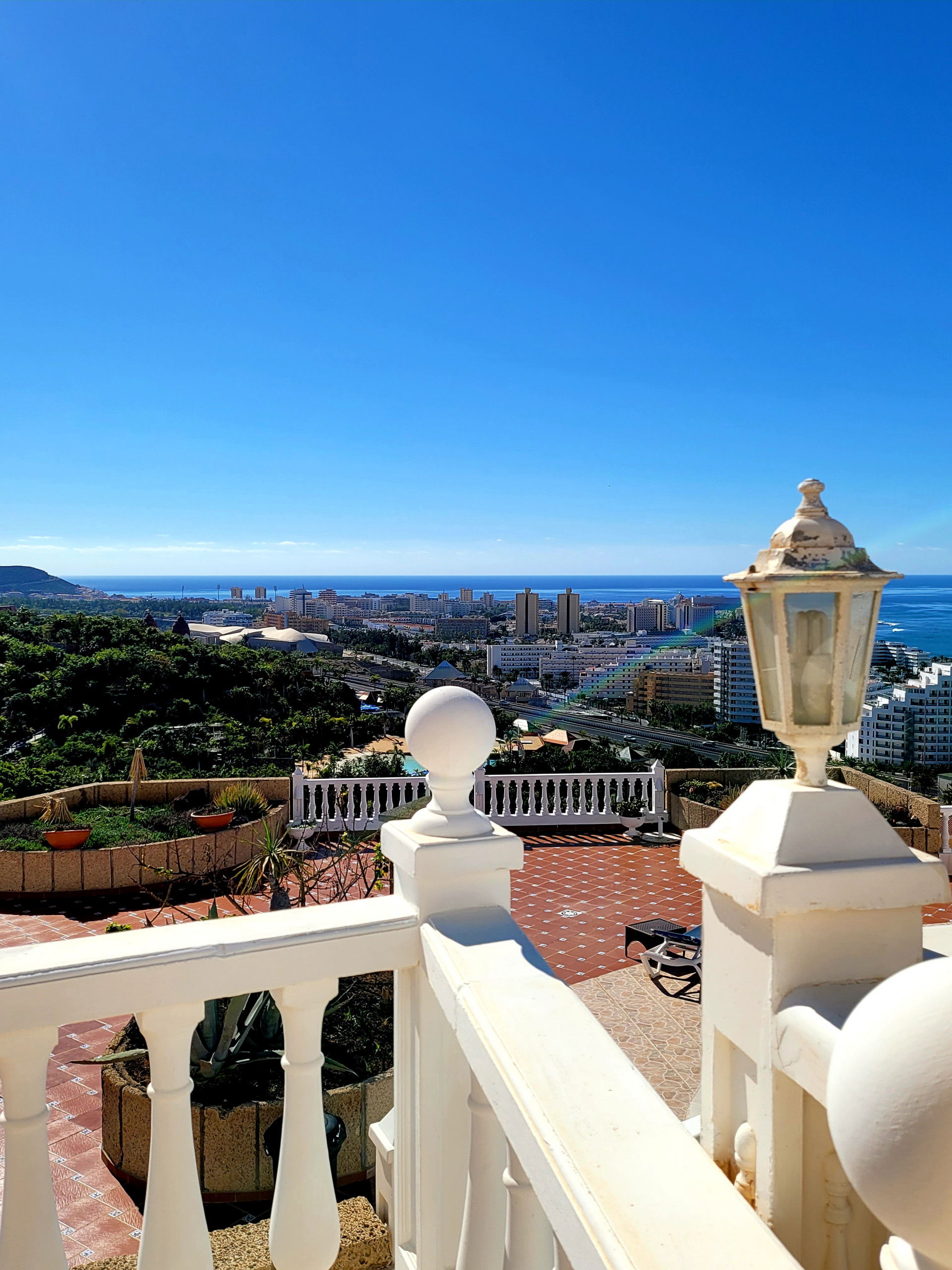 We present a haven of peace in a central location in Costa Adeje, in the south of Tenerife. This elegant and immaculately maintained villa stands out for its exclusive location in the hills of San Eugenio, within the prestigious Residencial El Musgo development. The holiday home has a total of three bedrooms, each with a double bed. Two of these are in the main house, whilst the third bedroom is situated in a separate apartment. This offers greater privacy and features its own outdoor kitchen and bathroom, ideal for guests or family members. The main house also offers two bathrooms, a spacious, fully equipped kitchen and a spacious living area with stunning sea views. The outdoor area is a real gem. Several terraces, a large swimming pool and stunning, unobstructed panoramic views of the Atlantic, the neighbouring islands of La Gomera and El Hierro, as well as the surrounding mountainous landscape, make this villa a special retreat. Despite its peaceful location, you’ll enjoy excellent transport links: just a few minutes’ walk from Siam Park, around 10 minutes from Siam Mall and less than 15 minutes from Tenerife’s most beautiful sandy beaches. This villa combines privacy, comfort and location at the very highest level.