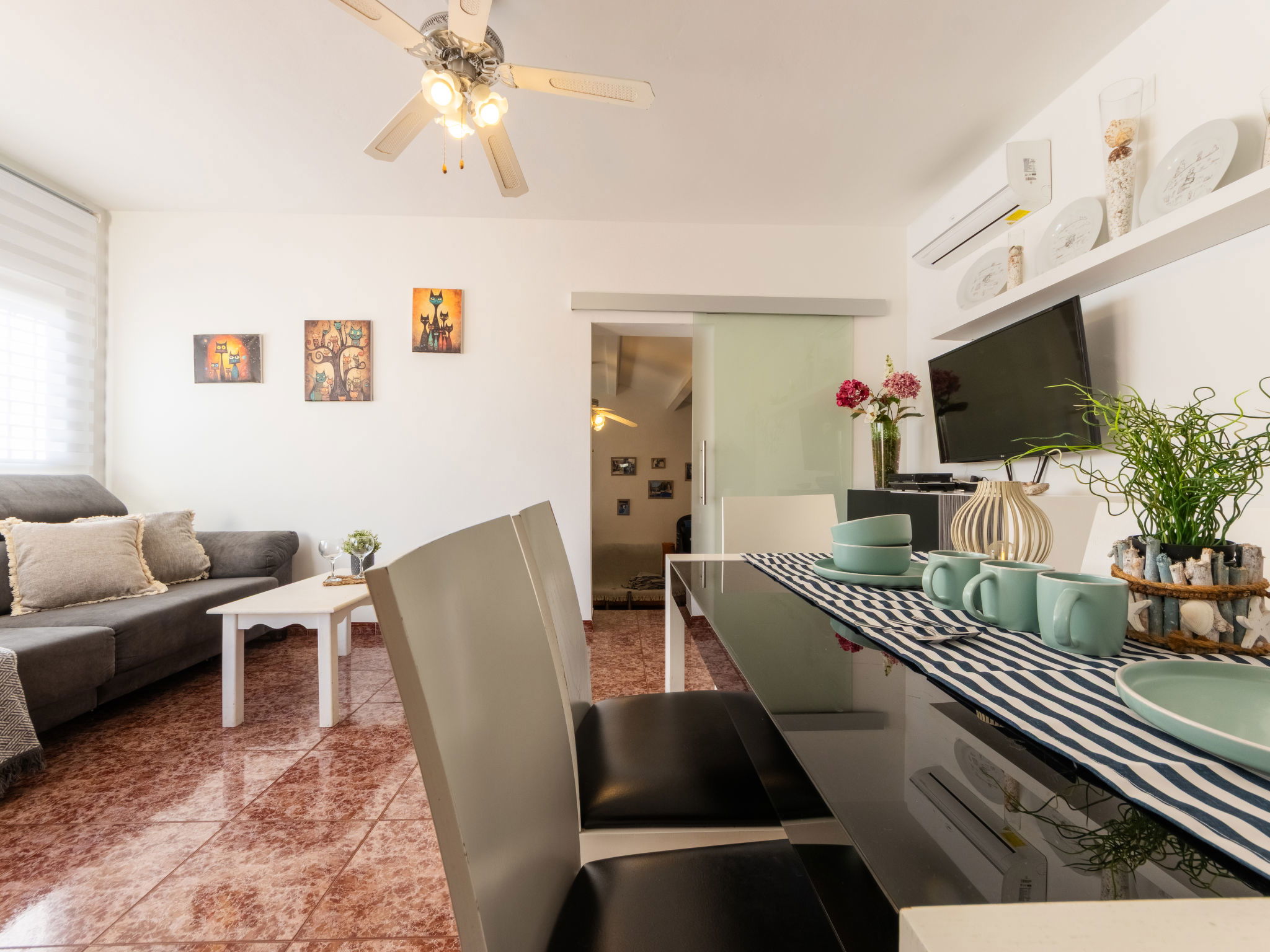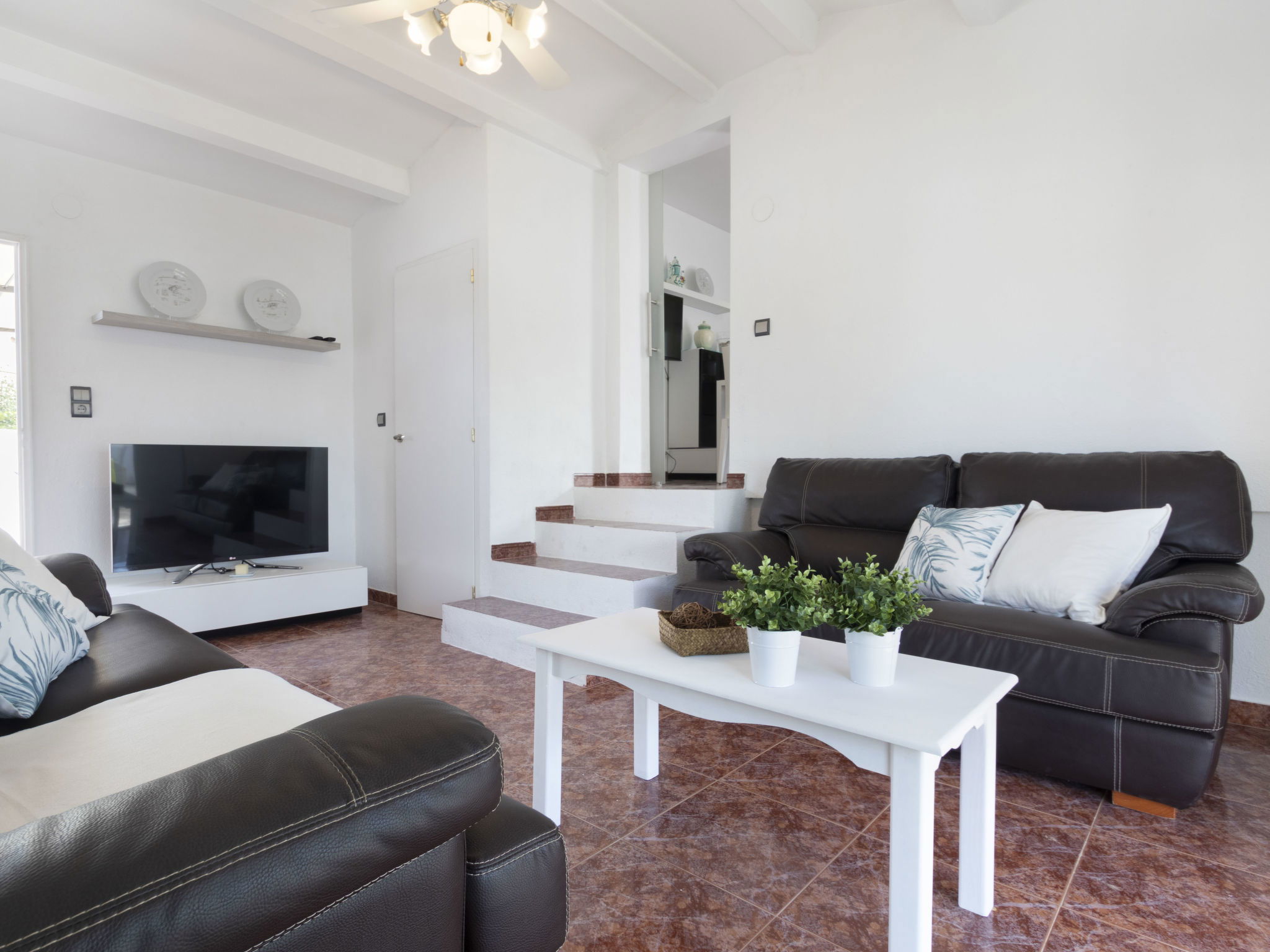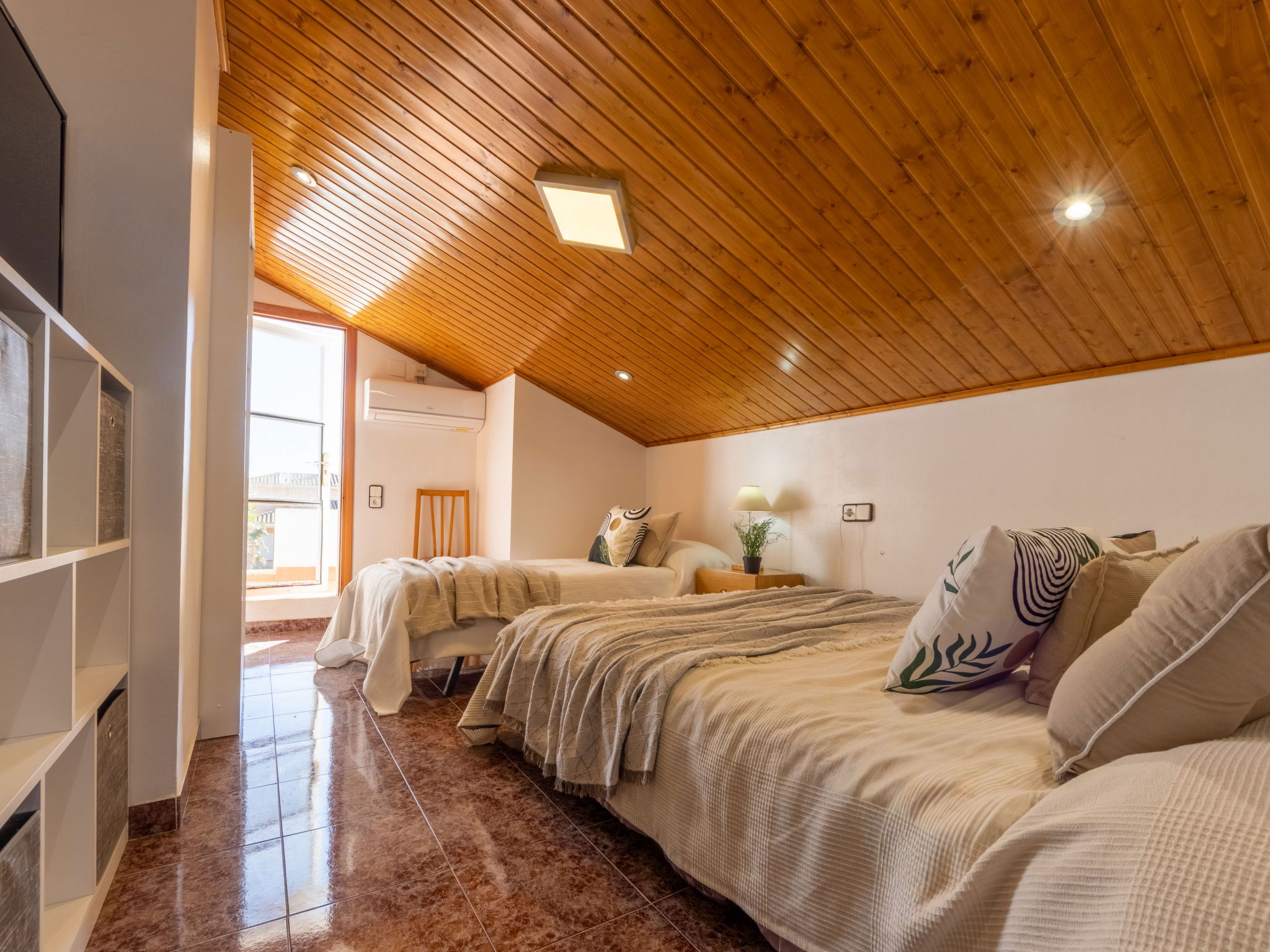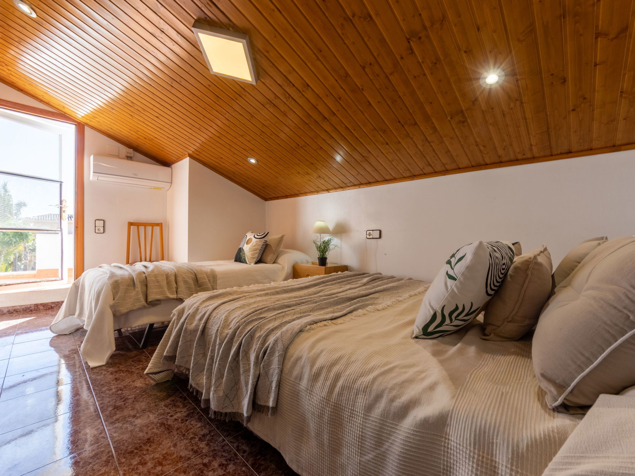 "Estrella", 6-room house 130 m2 on 2 levels. Renovated in 2020, comfortable and cosy furnishings: living/dining room with dining table, digital TV, international TV channels, air conditioning and forced-air heating. Exit pergola, to the patio, to the swimming pool. Living room with digital TV and international TV channels. Exit to the terrace, pergola, to the swimming pool. 3 double bedrooms, each room with 1 french bed (135 cm, length 190 cm). Open kitchen (4 hot plates, oven, dishwasher, toaster, kettle, microwave, freezer, electric coffee machine). Shower/WC, hip bath/bidet/WC. Air-conditioning, forced-air heating. Heating not available in all rooms. Upper floor: (exterior staircase), 1 double bedroom with sloping ceilings with 1 bed (90 cm, length 190 cm), 1 french bed (135 cm, length 190 cm), shower/WC, digital TV, air conditioning and forced-air heating. Exit to the terrace. Patio. Terrace furniture, barbecue, deck chairs. Side panoramic view of lagoon. Facilities: washing machine, iron, mosquito net, hair dryer. Internet (WiFi, free). Parking (2 cars) at the house. Please note: suitable for families one double bedroom is outside the apartment. Maximum 2 pets/ dogs allowed. HUTTE-002421 // Reg. Nr.: ESFCTU0000430190002671100000000000000000HUTTE-0024218