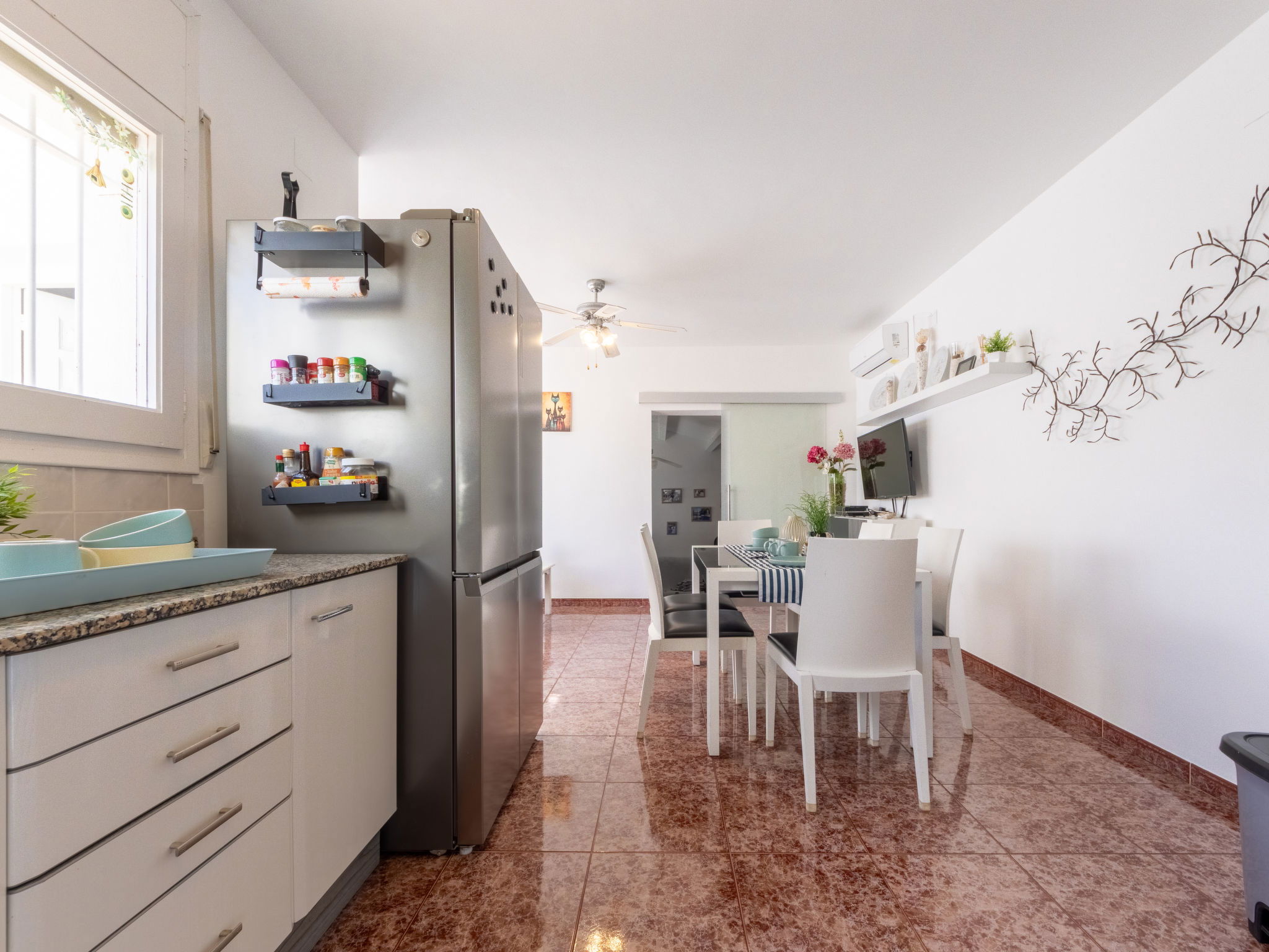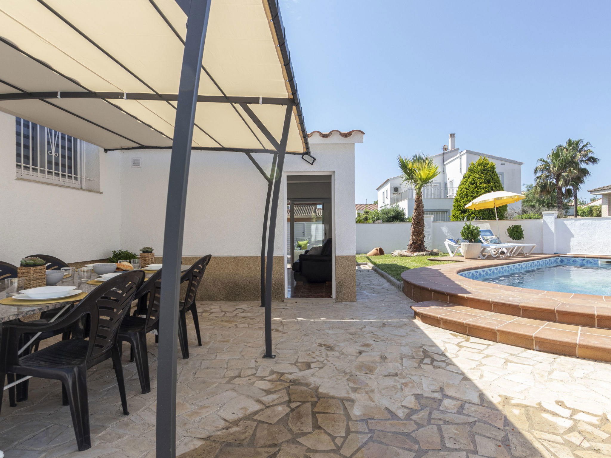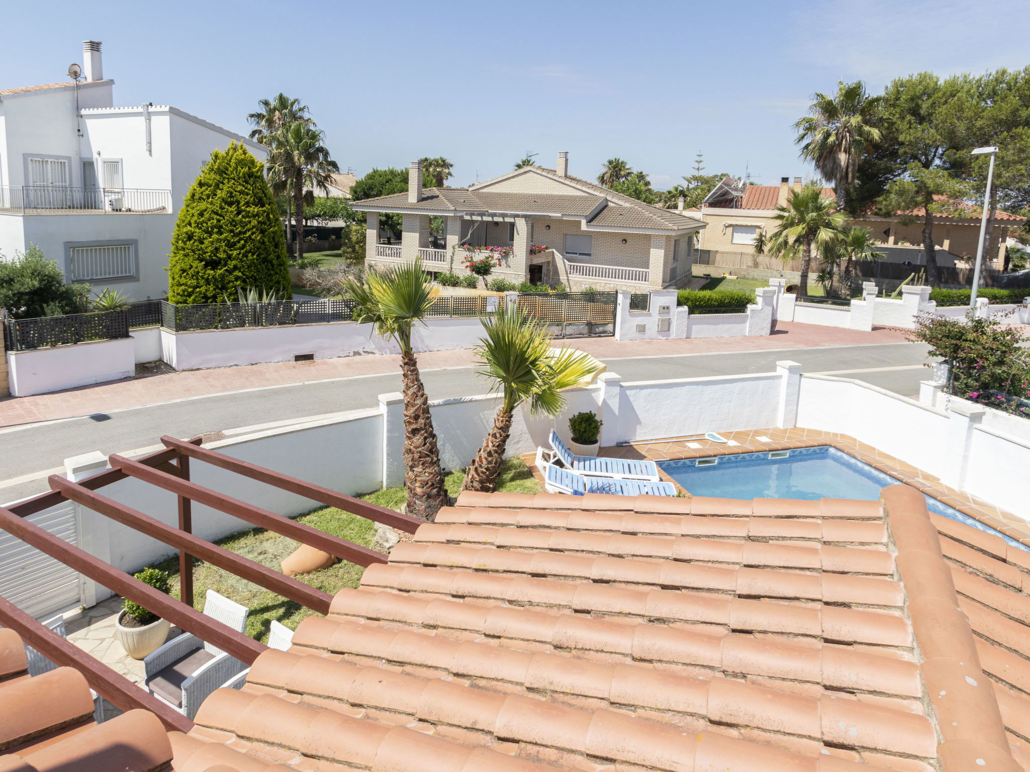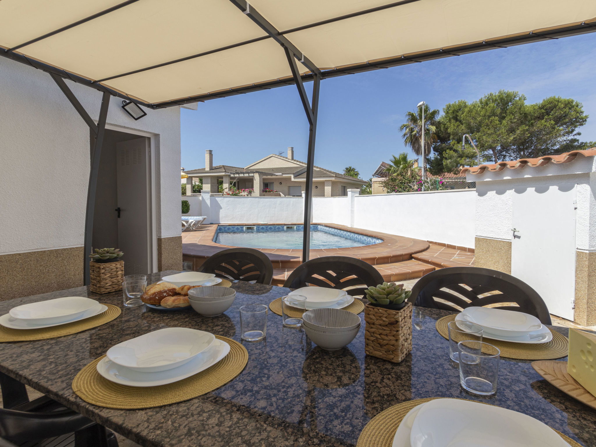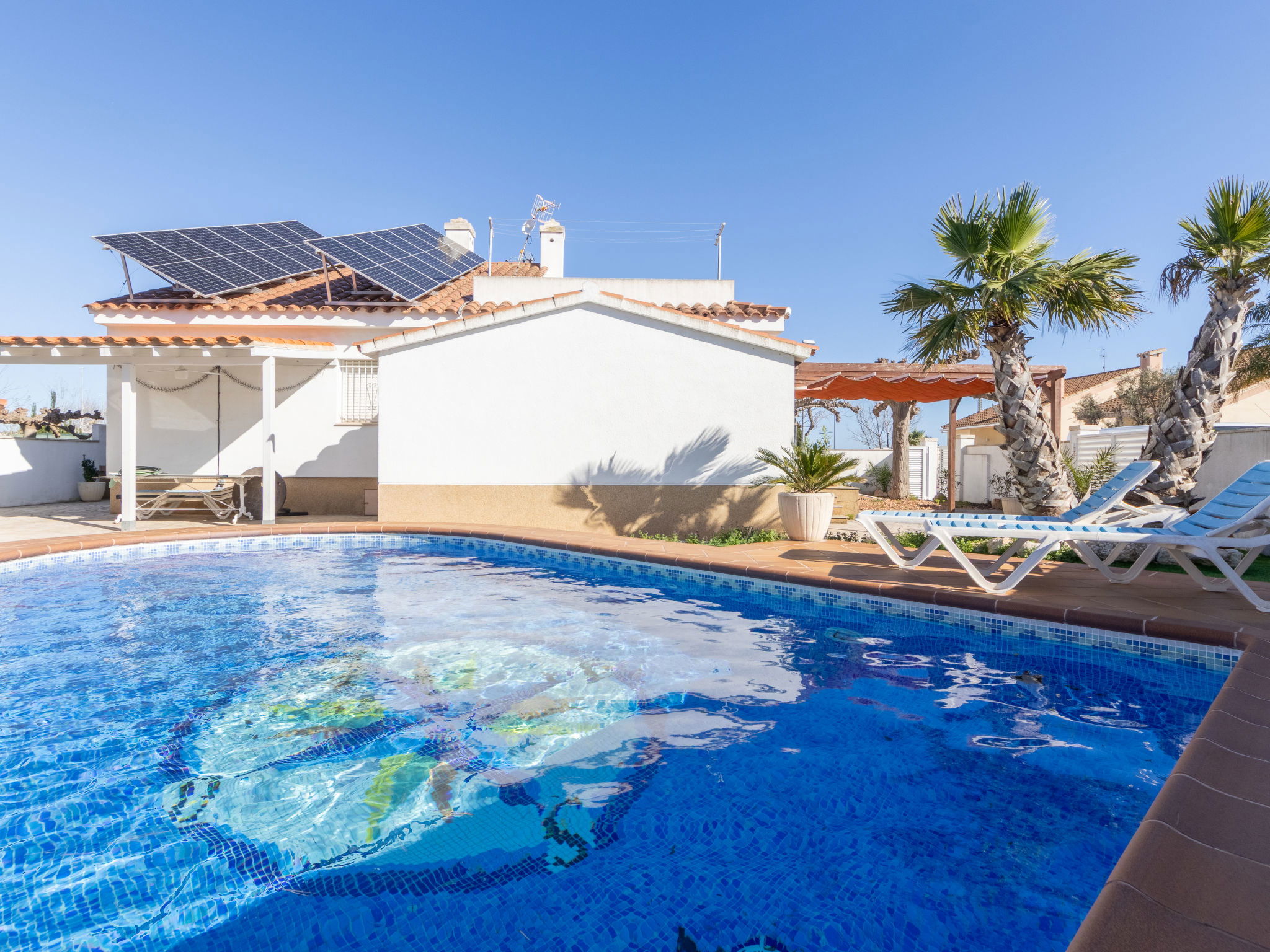 Riumar 11 km from Deltebre: Large, cosy, comfortable house "Estrella", 2 storeys, renovated in 2020. In the district Riumar Delta del Ebro, in a quiet, sunny position residential area (villas), 100 m from the sea, 100 m from the beach. Private: property (fenced), swimming pool angular (8 x 4 m, depth 100 - 170 cm, seasonal availability: 01.Apr. - 30.Nov.) with internal staircase. Outdoor shower, hot tub, patio, pergola, garden furniture, barbecue. In the house: WiFi, air conditioning, washing machine. Parking (for 2 cars) at the house. Shop, supermarket, restaurant, bar, bakery 100 m, 5 minute walk to the centre, bus stop "Riumar" 300 m, railway station "Aldea- Amposta" 25 km, sandy beach "Riumar" 100 m. Sports harbour 1 km, golf course (18 hole) 15 km, cycle lane 50 m. Nearby attractions: Parque natural Delta del Ebro 10 m, Port Aventura 65 km, Parque Acuatico 65 km, Barcelona 190 km, Tortosa 35 km. Hiking paths: Parque natural Puerto Tortosa Beseit 25 km, GR 92 15 km. Please note: car recommended. Suitable for families. Groups of teenagers on request only.