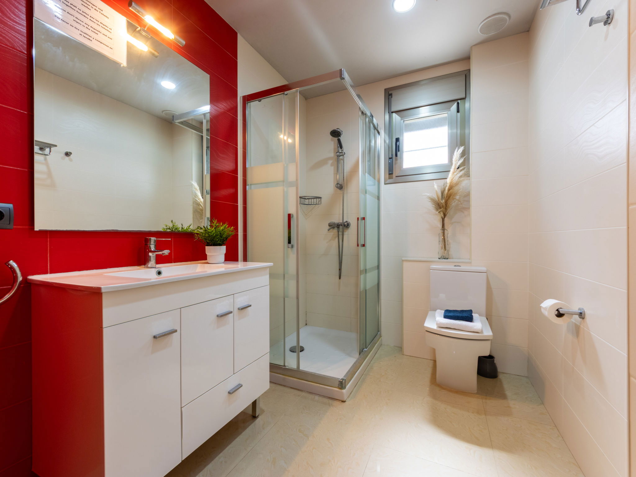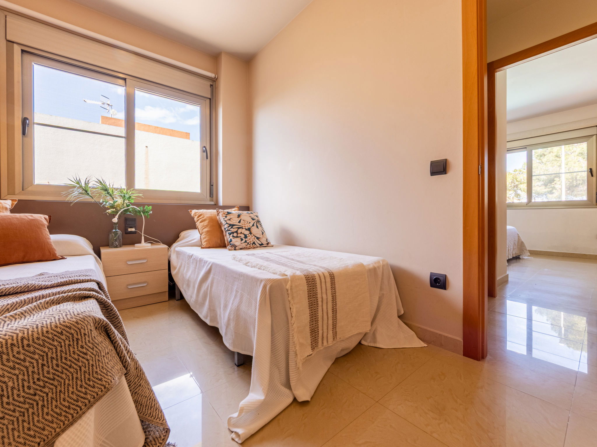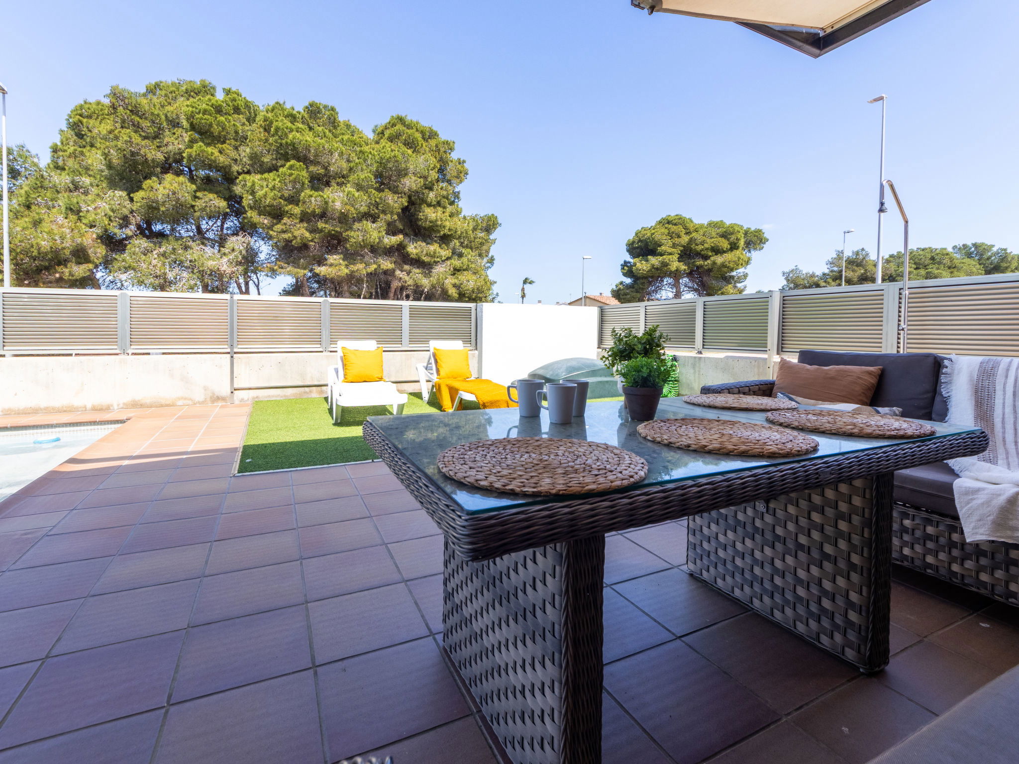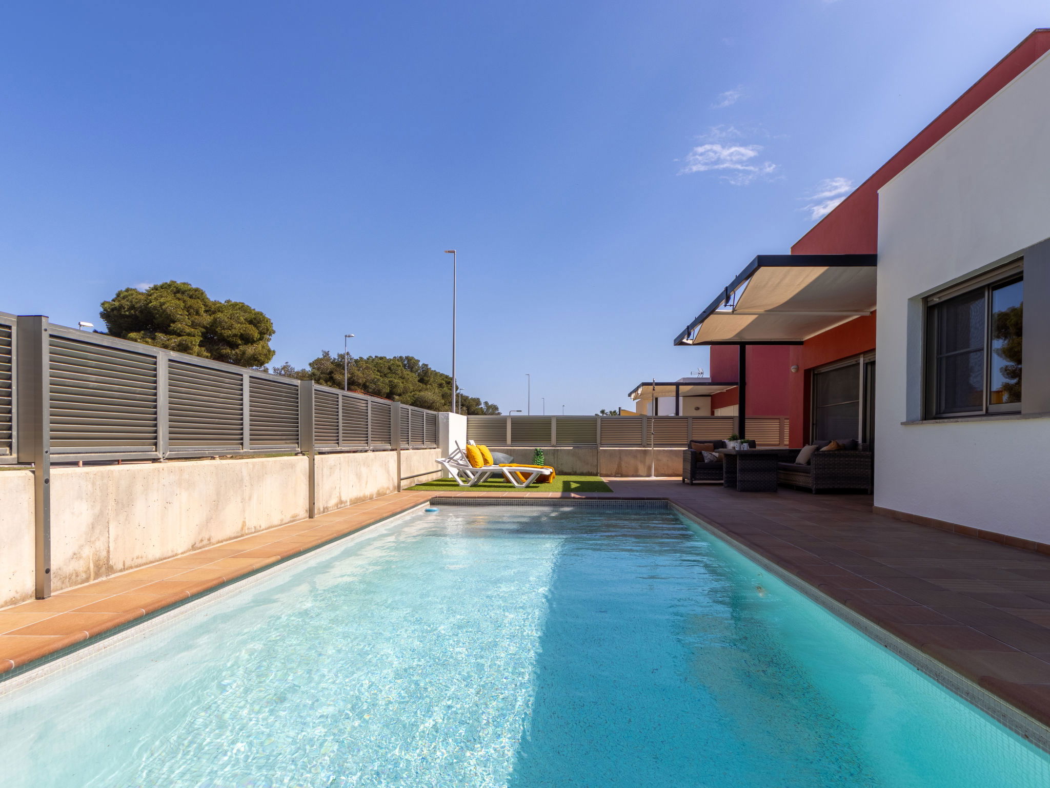 Riumar 10 km from Deltebre: Modern, cosy house "Grobro 1". In a quiet, sunny position, 700 m from the sea, 700 m from the beach. Private: property (fenced), swimming pool angular (8 x 3 m, depth 160 cm, seasonal availability: 01.Apr. - 30.Nov.) with internal staircase. Outdoor shower, pergola, terrace, garden furniture, barbecue. In the house: WiFi, air conditioning, washing machine. Parking on the premises. Supermarket 500 m, restaurant, bar 300 m, bakery 600 m, bus stop "Riumar" 400 m, railway station "Aldea- Amposta" 25 km, sandy beach "Riumar" 700 m. Nearby attractions: Parc Natural del Delta 800 m, Tortosa 35 km, Playa el Trabucador 29 km, Barcelona 190 km, Port Aventura 70 km. Hiking paths: Ports Tortosa Beseit 52 km, GR 92 20 km. Please note: car recommended. Groups of teenagers on request only.