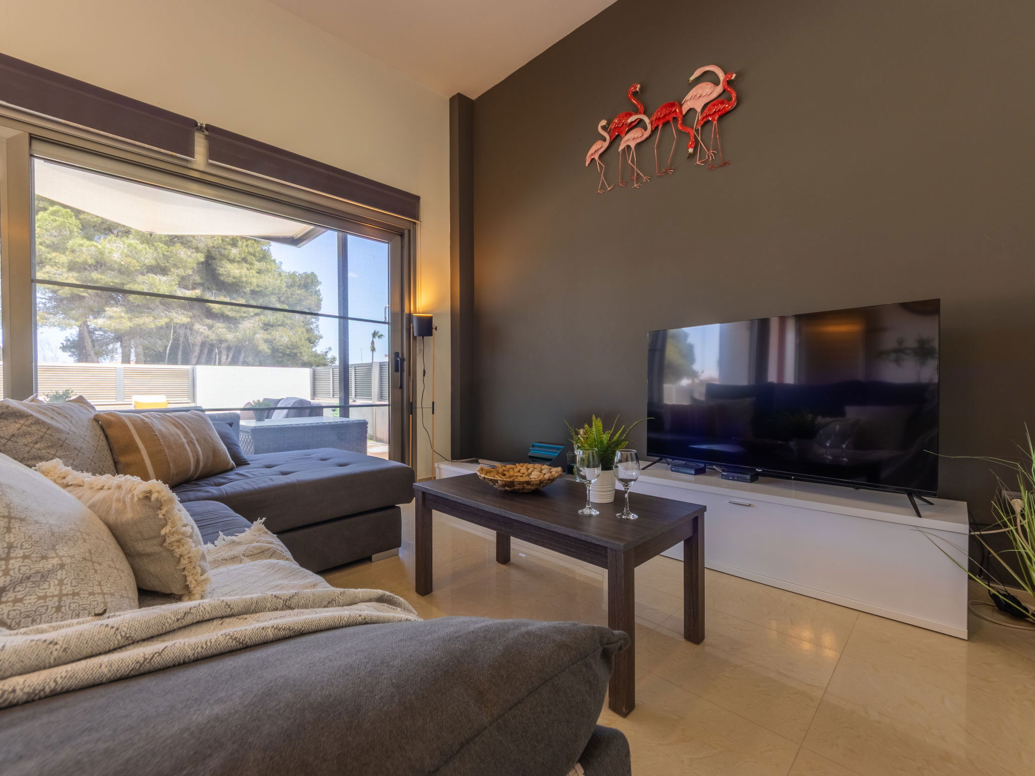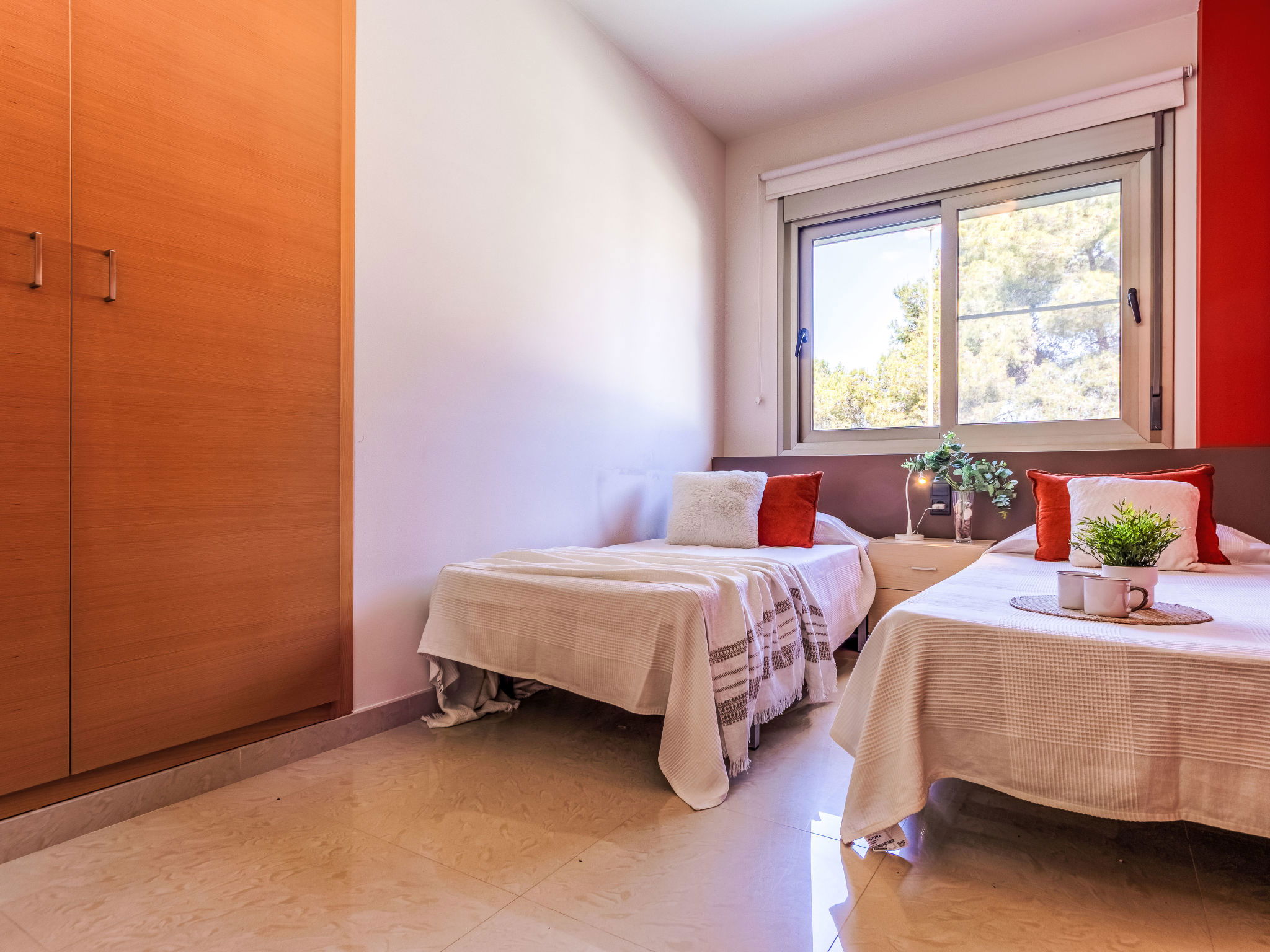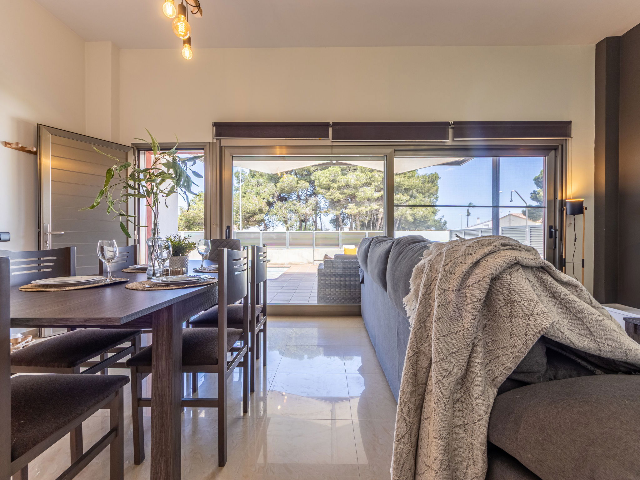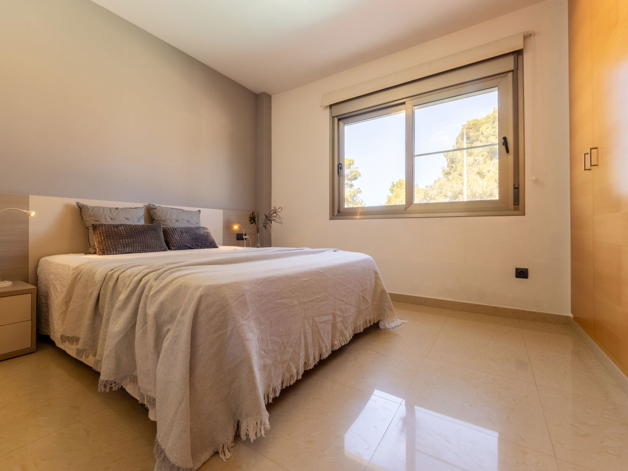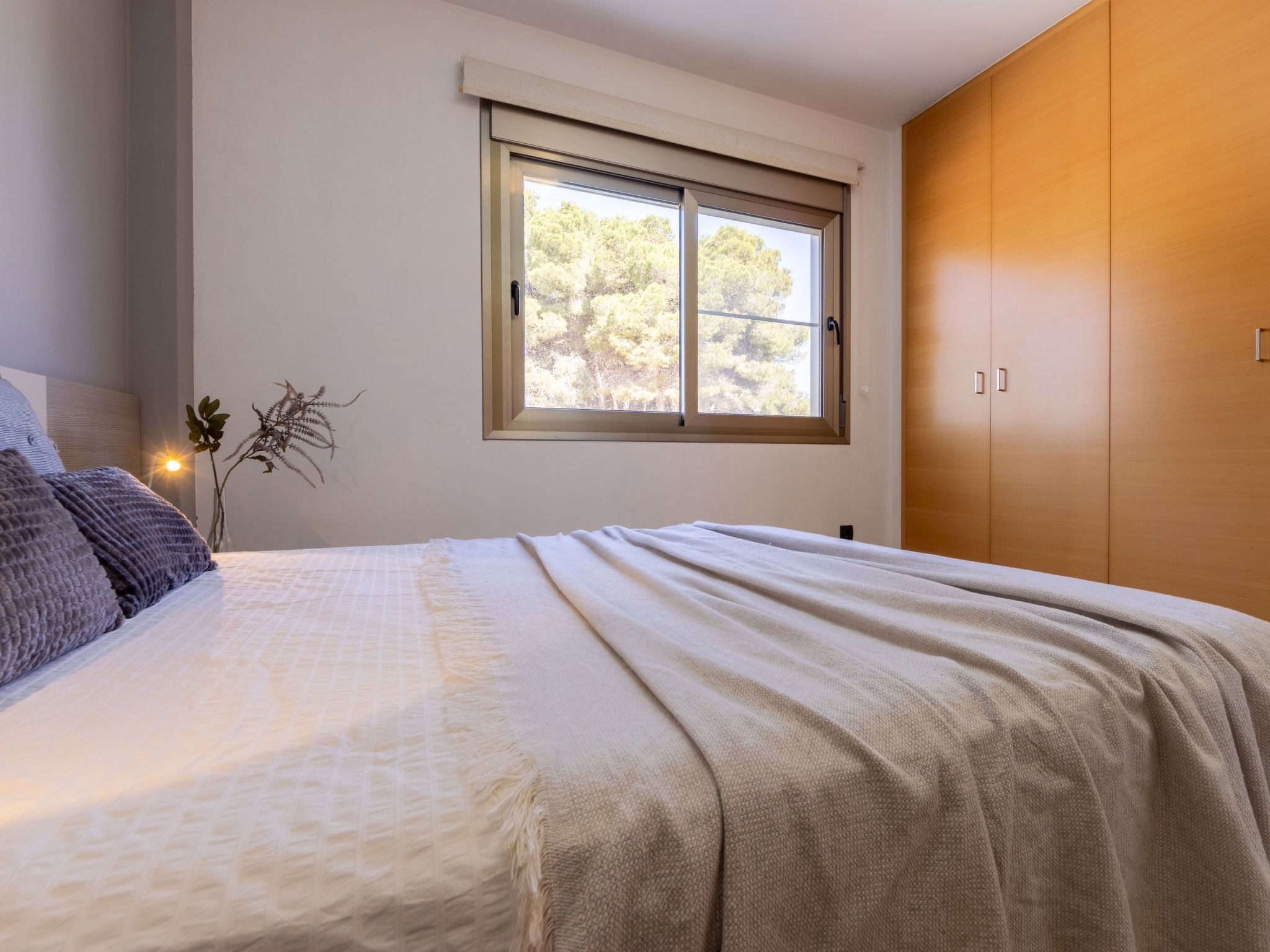"Grobro 1", 4-room house 98 m2, lower ground floor. Spacious and bright, modern and cosy furnishings: living/dining room with dining table, digital TV, air conditioning and forced-air heating. Exit to the terrace, to the swimming pool. 1 double bedroom with 1 french bed (135 cm, length 190 cm), shower/WC. 1 double bedroom with 2 beds (90 cm, length 190 cm). 1 double bedroom with 2 beds (90 cm, length 190 cm). Open kitchen (oven, dishwasher, 3 ceramic glass hob hotplates, toaster, kettle, microwave, freezer, electric coffee machine) with bar. Shower/WC. Air-conditioning, forced-air heating. Terrace furniture, barbecue, deck chairs, covered balcony. View of the swimming pool. Facilities: washing machine, iron, hair dryer. Internet (WiFi, free). Parking (fenced). Suitable for families. Maximum 2 pets/ dogs allowed. HUTTE-000706-31 // Reg. Nr.: ESFCTU0000430190006972900000000000000HUTTE-000706-313