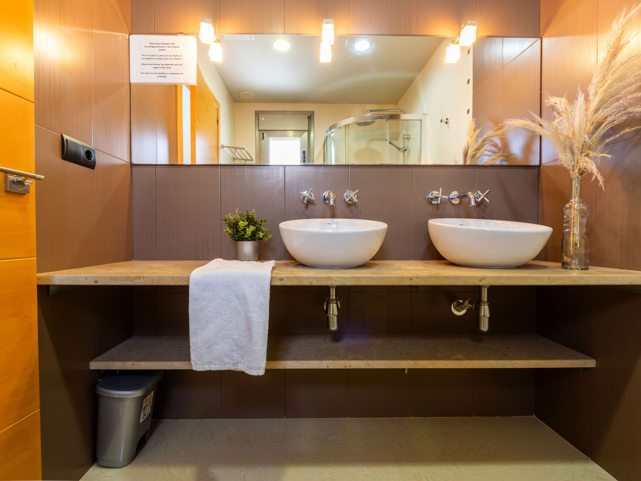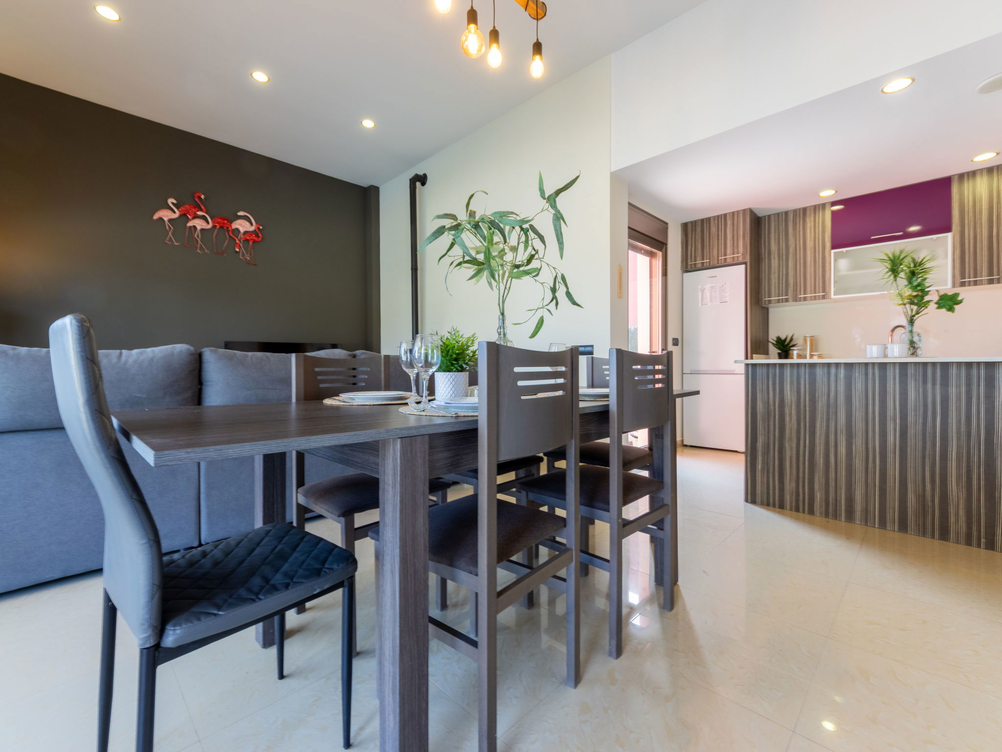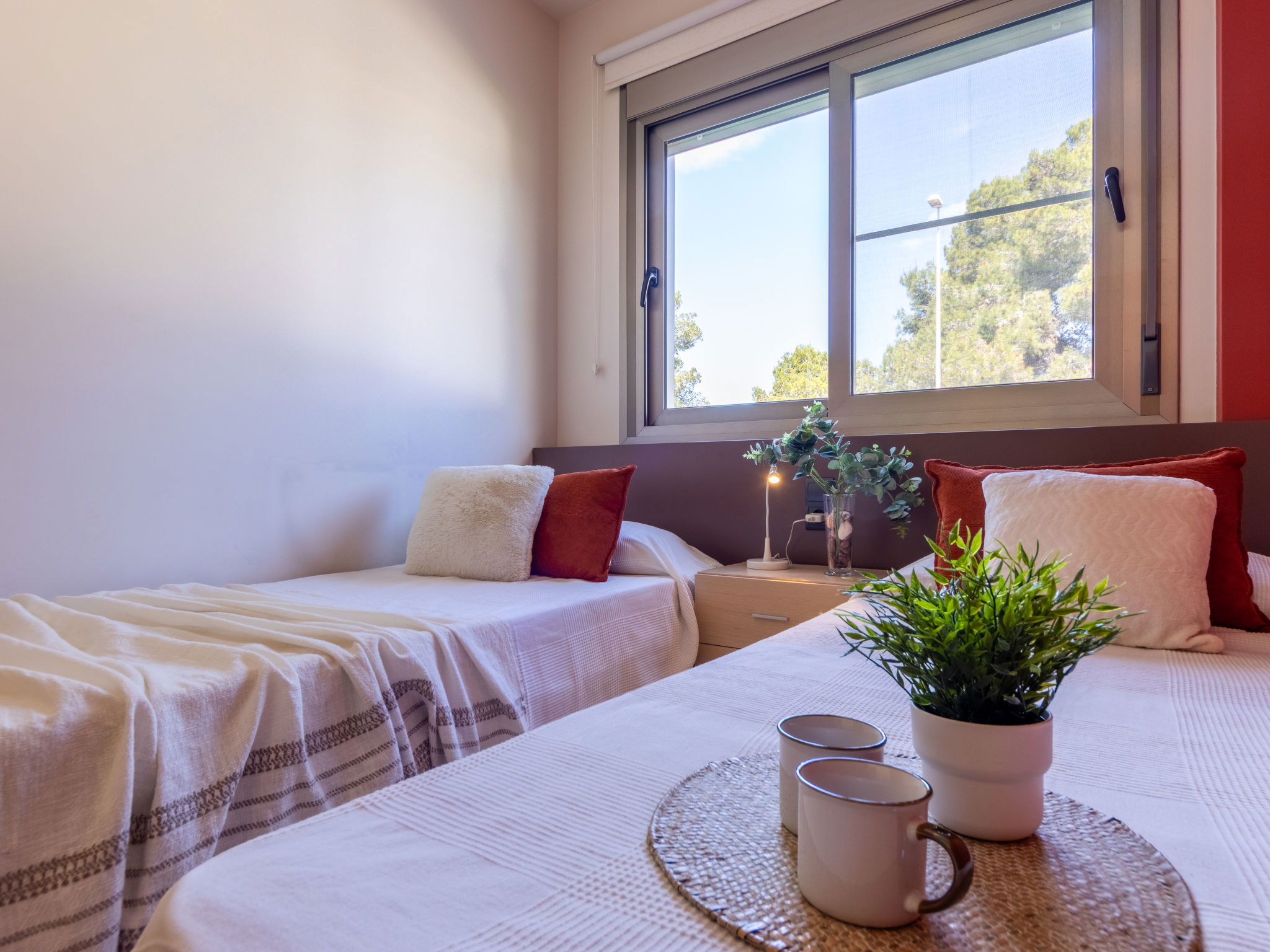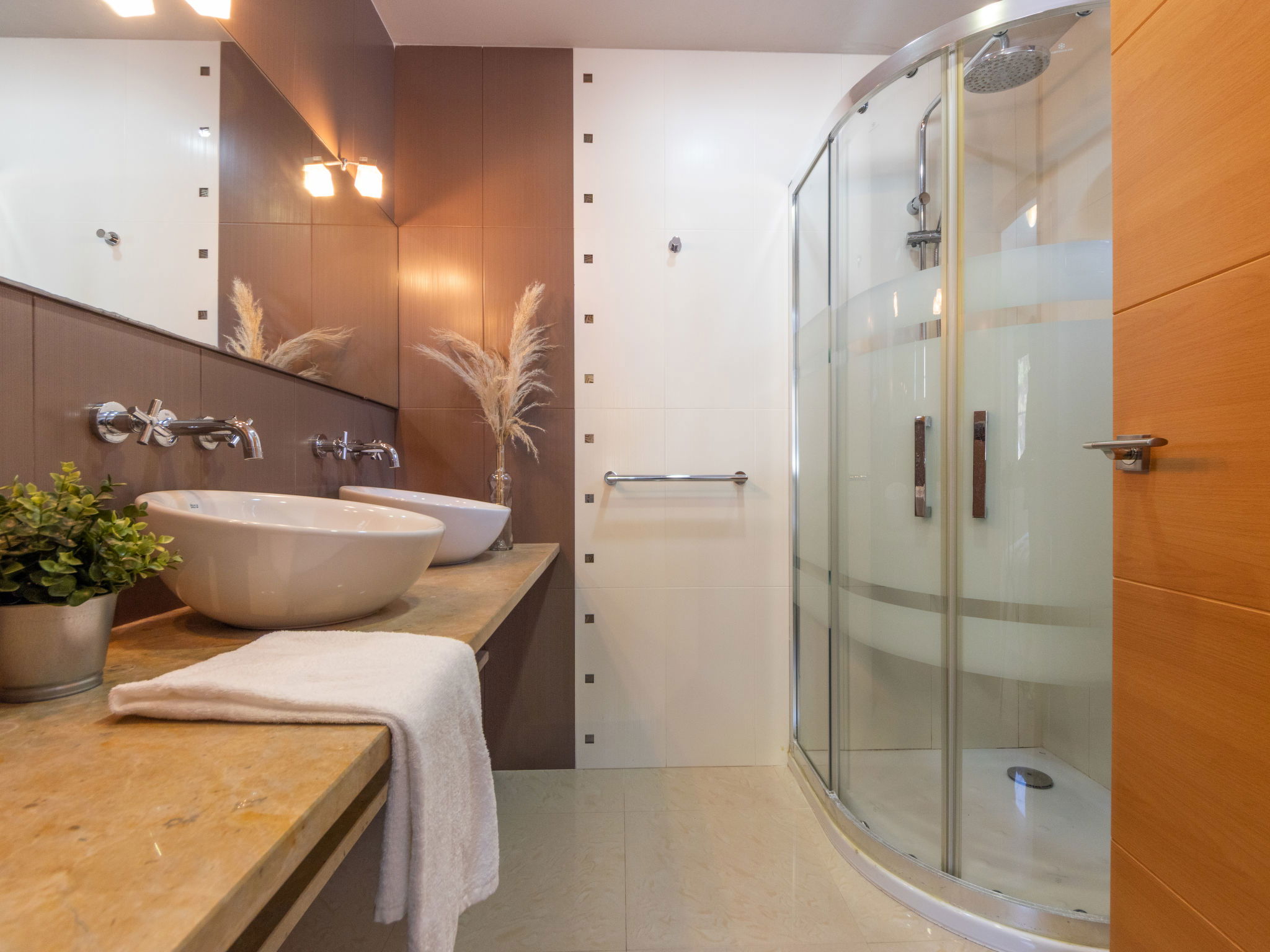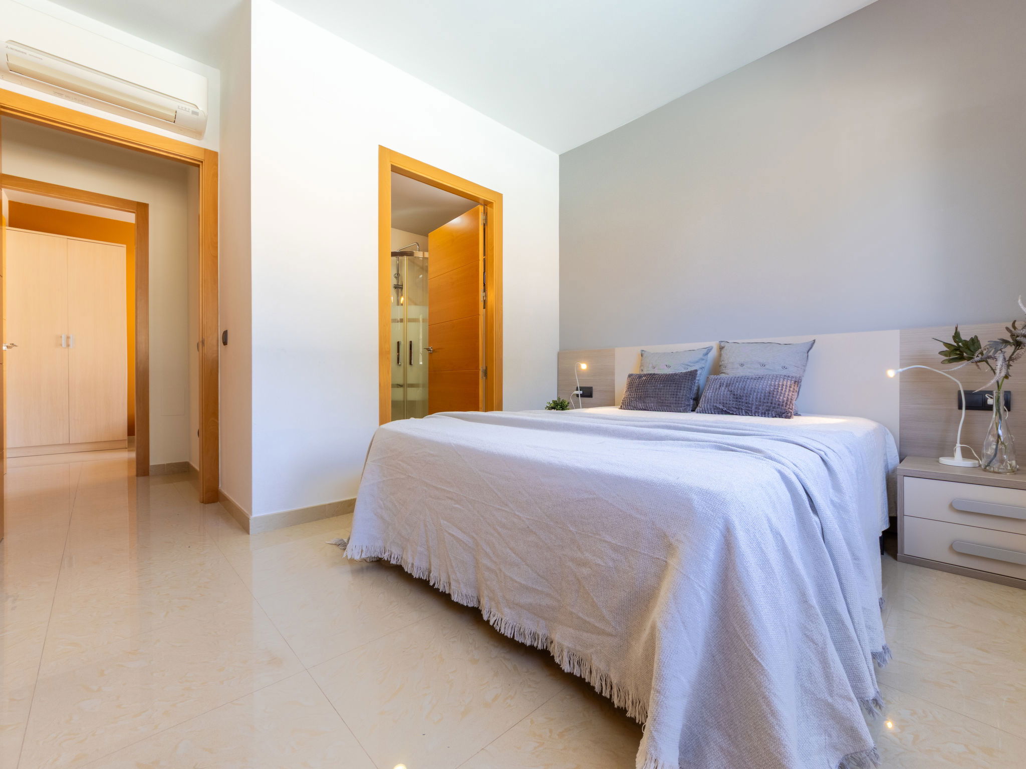 "Grobro 1", 4-room house 98 m2, lower ground floor. Spacious and bright, modern and cosy furnishings: living/dining room with dining table, digital TV, air conditioning and forced-air heating. Exit to the terrace, to the swimming pool. 1 double bedroom with 1 french bed (135 cm, length 190 cm), shower/WC. 1 double bedroom with 2 beds (90 cm, length 190 cm). 1 double bedroom with 2 beds (90 cm, length 190 cm). Open kitchen (oven, dishwasher, 3 ceramic glass hob hotplates, toaster, kettle, microwave, freezer, electric coffee machine) with bar. Shower/WC. Air-conditioning, forced-air heating. Terrace furniture, barbecue, deck chairs, covered balcony. View of the swimming pool. Facilities: washing machine, iron, hair dryer. Internet (WiFi, free). Parking (fenced). Suitable for families. Maximum 2 pets/ dogs allowed. HUTTE-000706-31 // Reg. Nr.: ESFCTU0000430190006972900000000000000HUTTE-000706-313