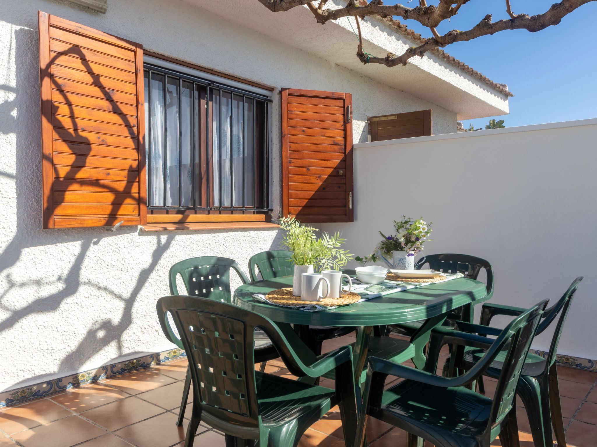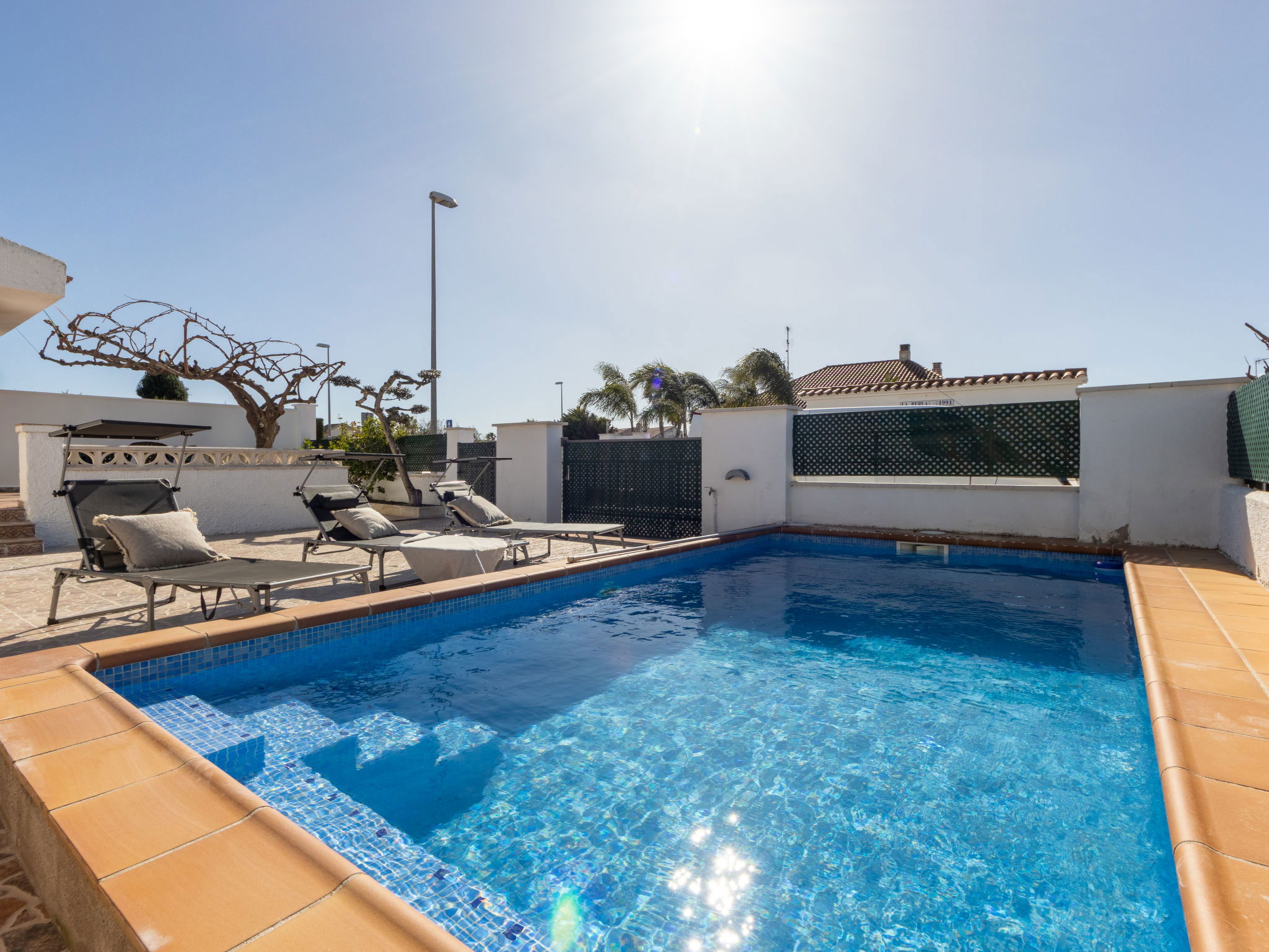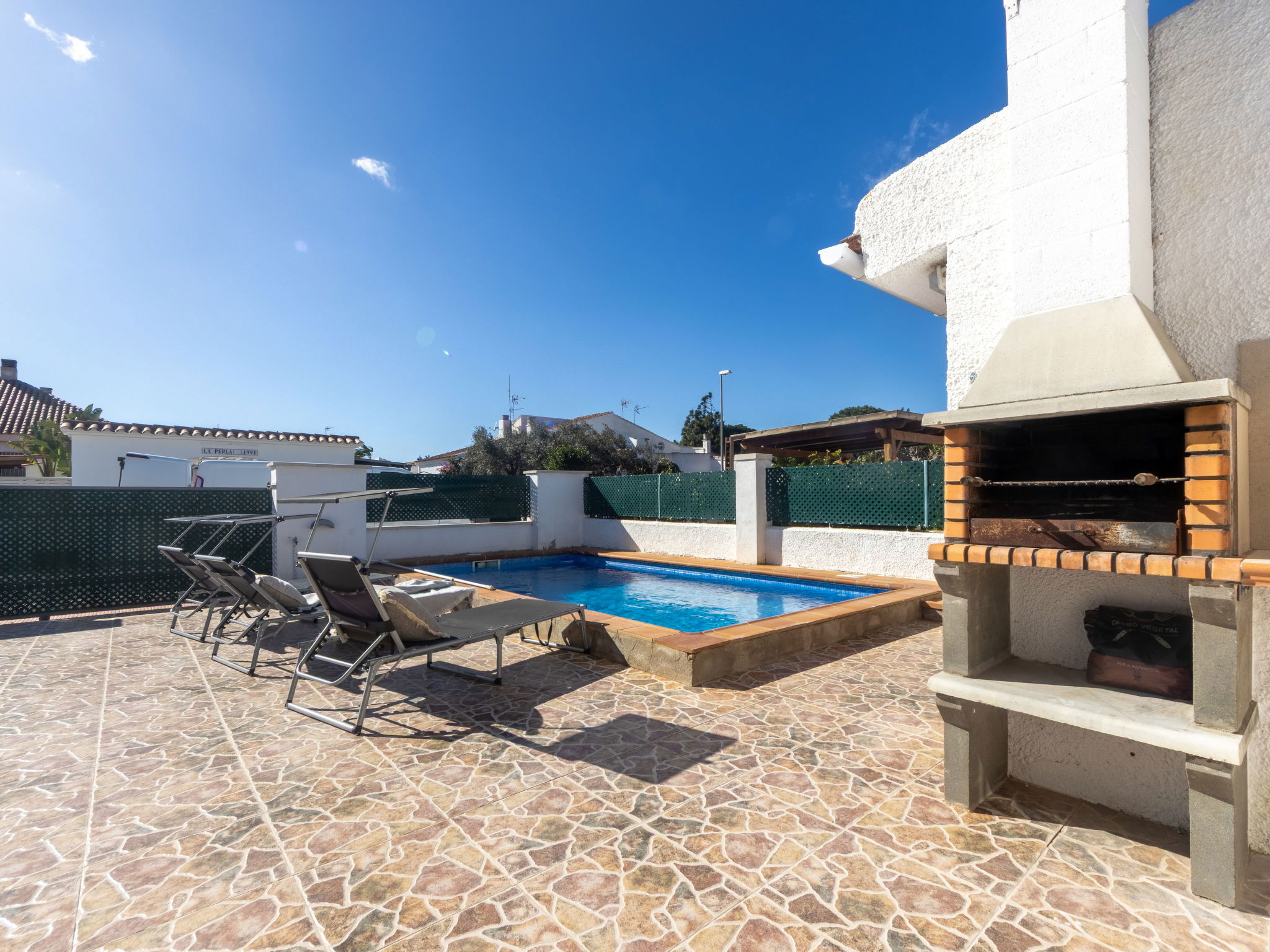 Riumar 10 km from Deltebre: Cosy, comfortable house "Falco". In a quiet, sunny position, 500 m from the sea, 500 m from the beach. Private: property (fenced), swimming pool angular (5 x 3 m, depth 160 cm, seasonal availability: 01.Apr. - 31.Nov.) with internal staircase. Outdoor shower, pergola, terrace, garden furniture, barbecue. In the house: WiFi, air conditioning, washing machine. Parking at the house. Supermarket 500 m, restaurant, bar 300 m, bakery 600 m, bus stop "Riumar" 650 m, railway station "Aldea- Amposta" 25 km, sandy beach "Riumar" 500 m. Sports harbour 1 km. Nearby attractions: Port Aventura 75 km, Tortosa 35 km, Playa el Trabucador 29 km, Barcelona 190 km. Hiking paths: Parque natural Puerto Tortosa Beseit 52 km, GR 92 15 km. Please note: car recommended. Suitable for families. Groups of teenagers on request only.