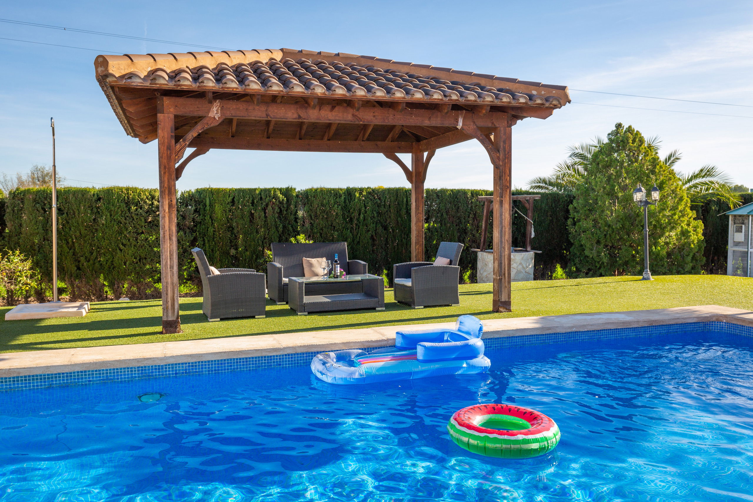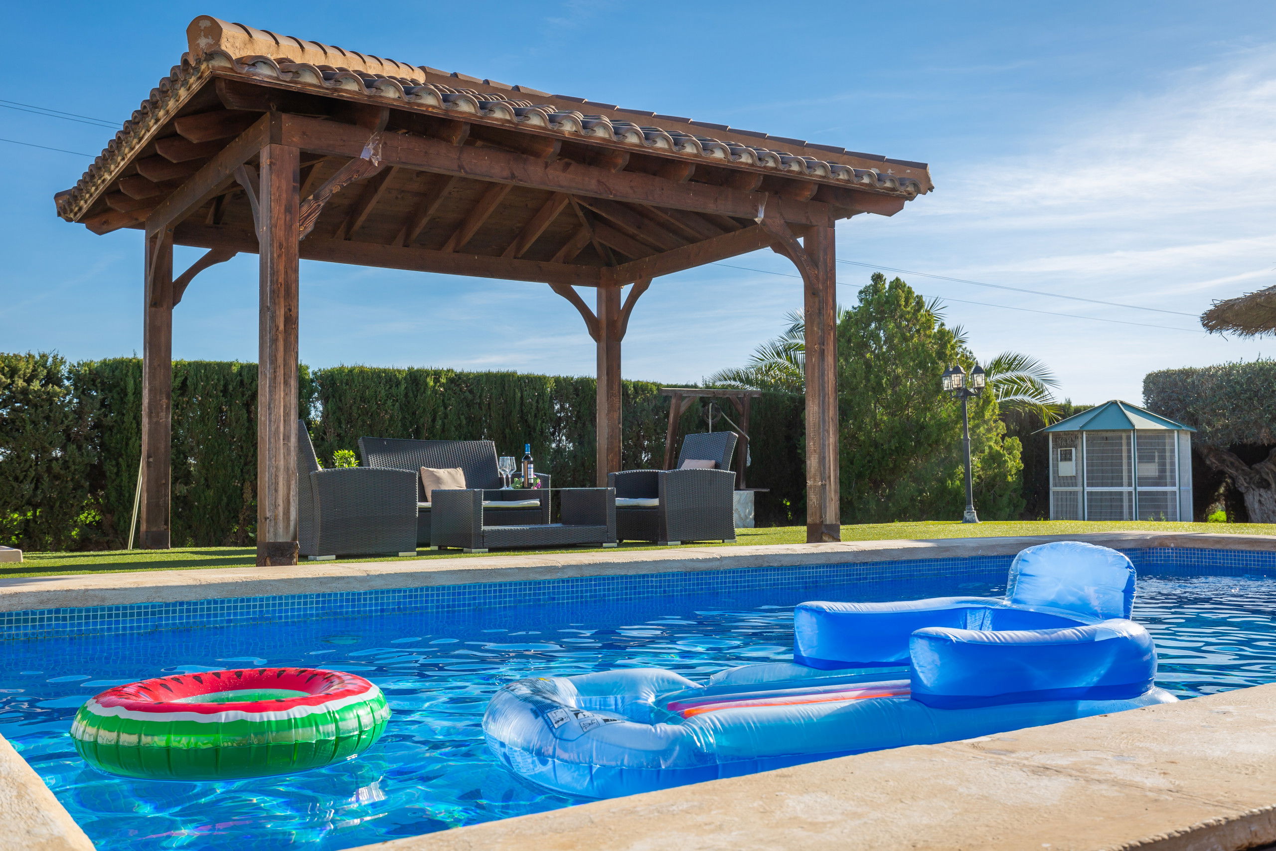 Comfortable apartment of 100 m² and newly built, overlooking the private garden with pool and barbecue, garden furniture, fenced plot, 250 m² of terrace, barbecue, fireplace, iron, internet access (Wi-Fi), hairdryer, sauna, private pool, open-air parking in the same building, 1 fan, 1 TV, satellite TV (Languages: Spanish, English, German, Dutch, French, Russian, Swedish, Norwegian).