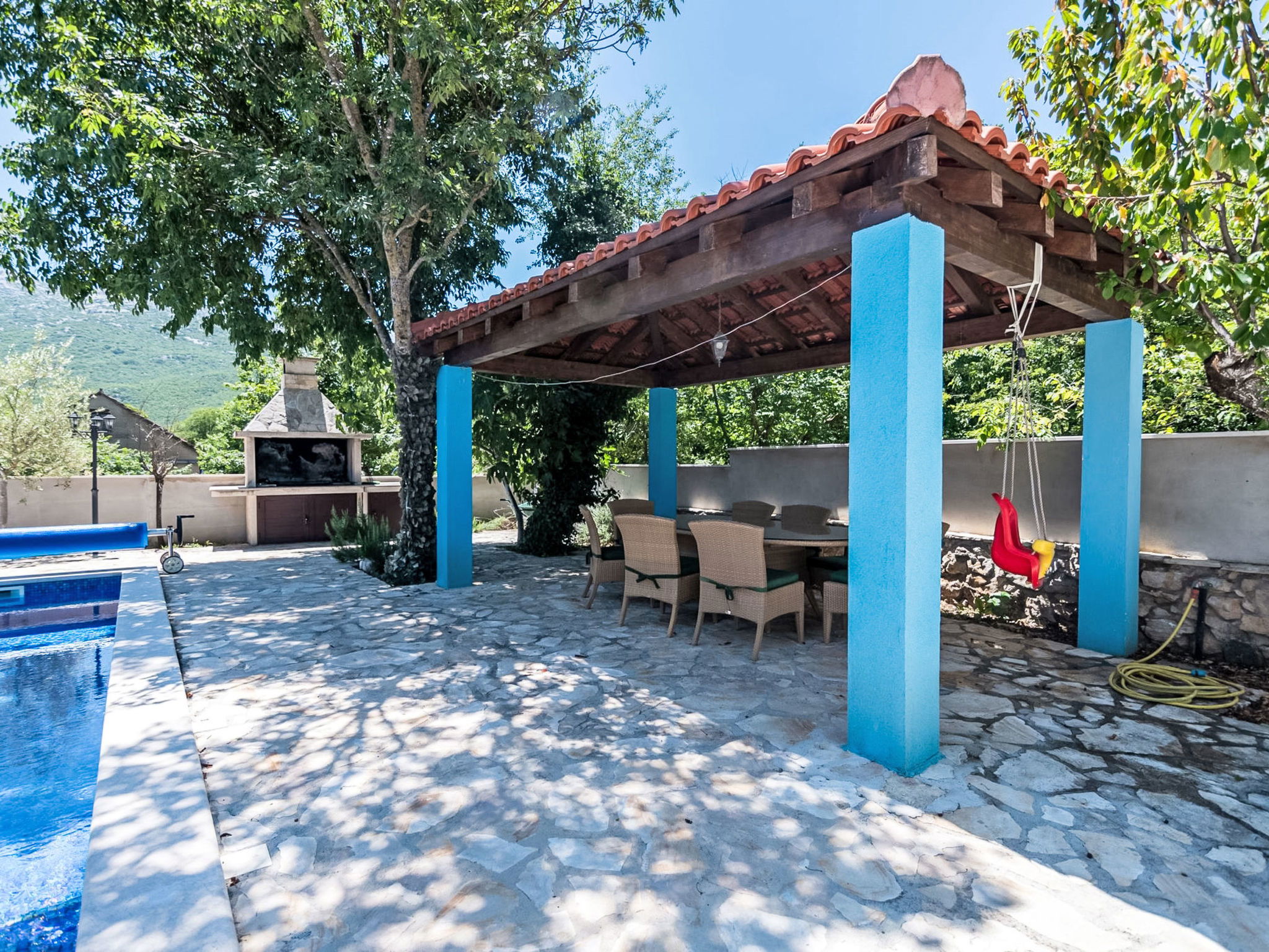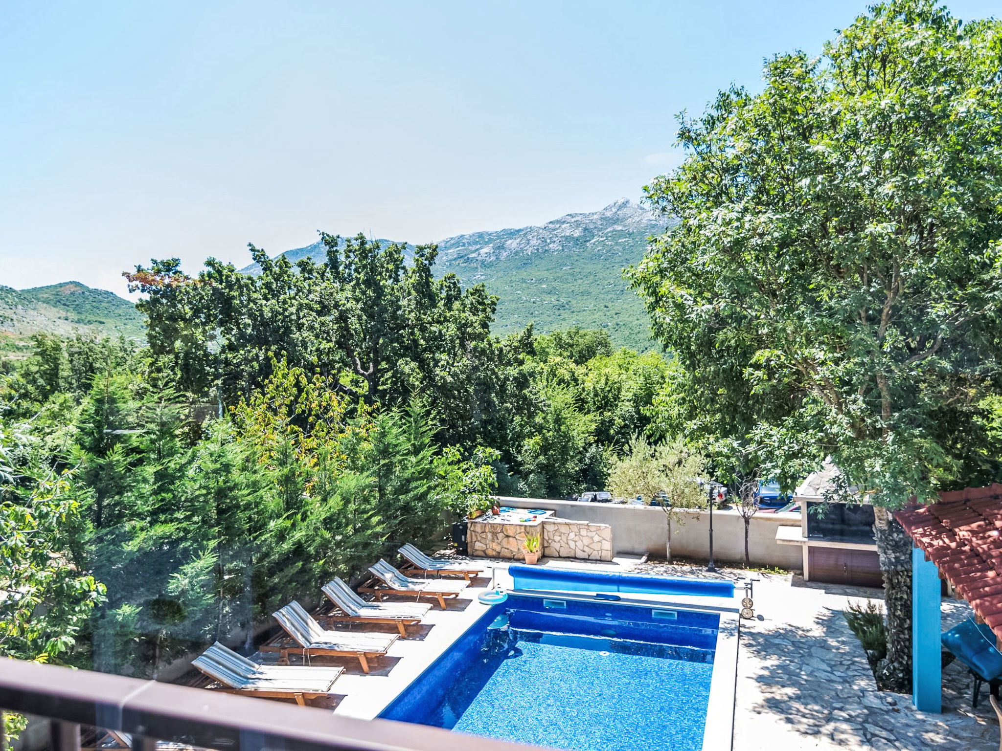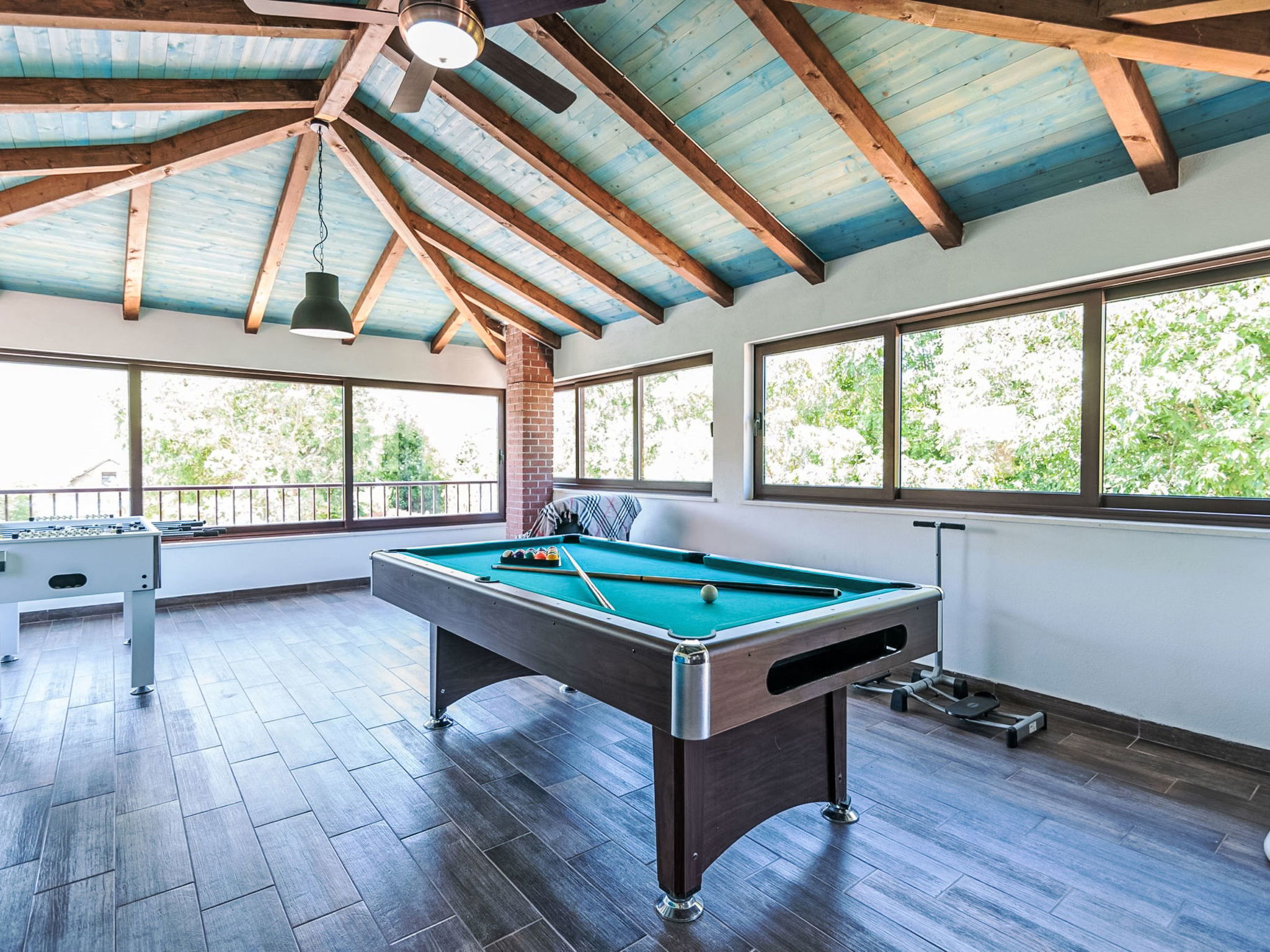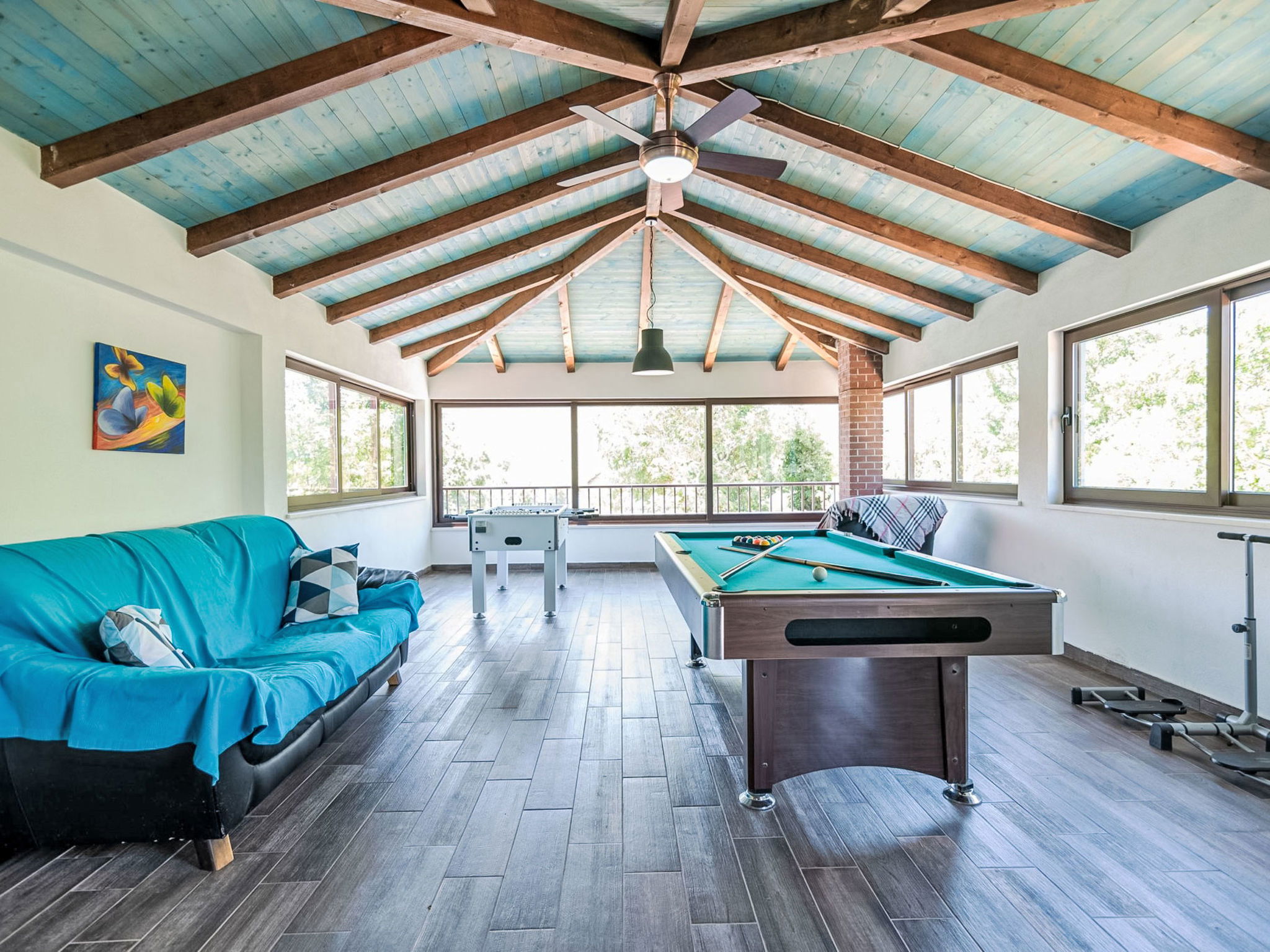 Single-family house "Lino", 2 storeys. 20 km from the centre of Split, in a secluded, quiet, sunny position, 18 km from the sea, 18 km from the beach. Private: property 600 m2, swimming pool angular (8 x 4 m, depth 140 - 170 cm, seasonal availability: 01.May. - 01.Oct.) with internal staircase. Outdoor shower, hot tub, terrace (14 m2), barbecue. In the house: internet access, fitness room, table tennis, billiard table, table football, washing machine. Parking, single garage. Shop 3 km, restaurant 600 m, bus stop 200 m, pebble beach 18 km, rocky beach 18 km.