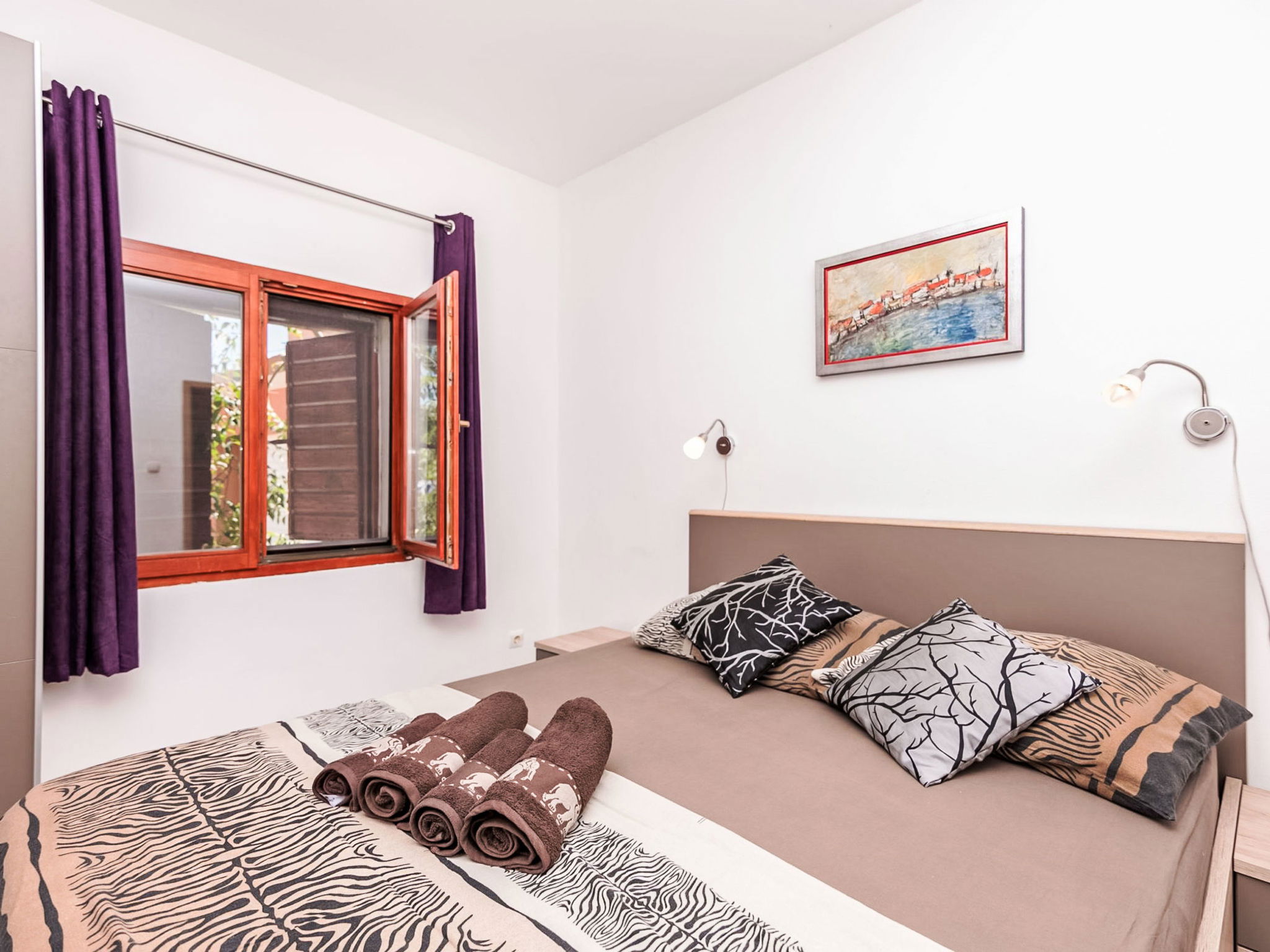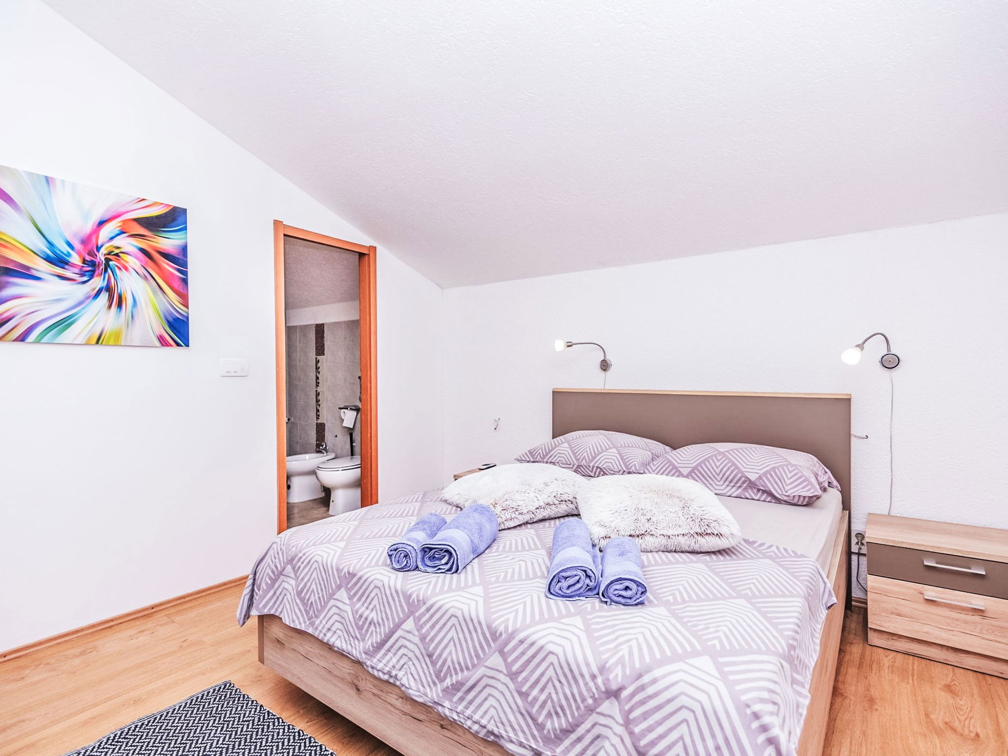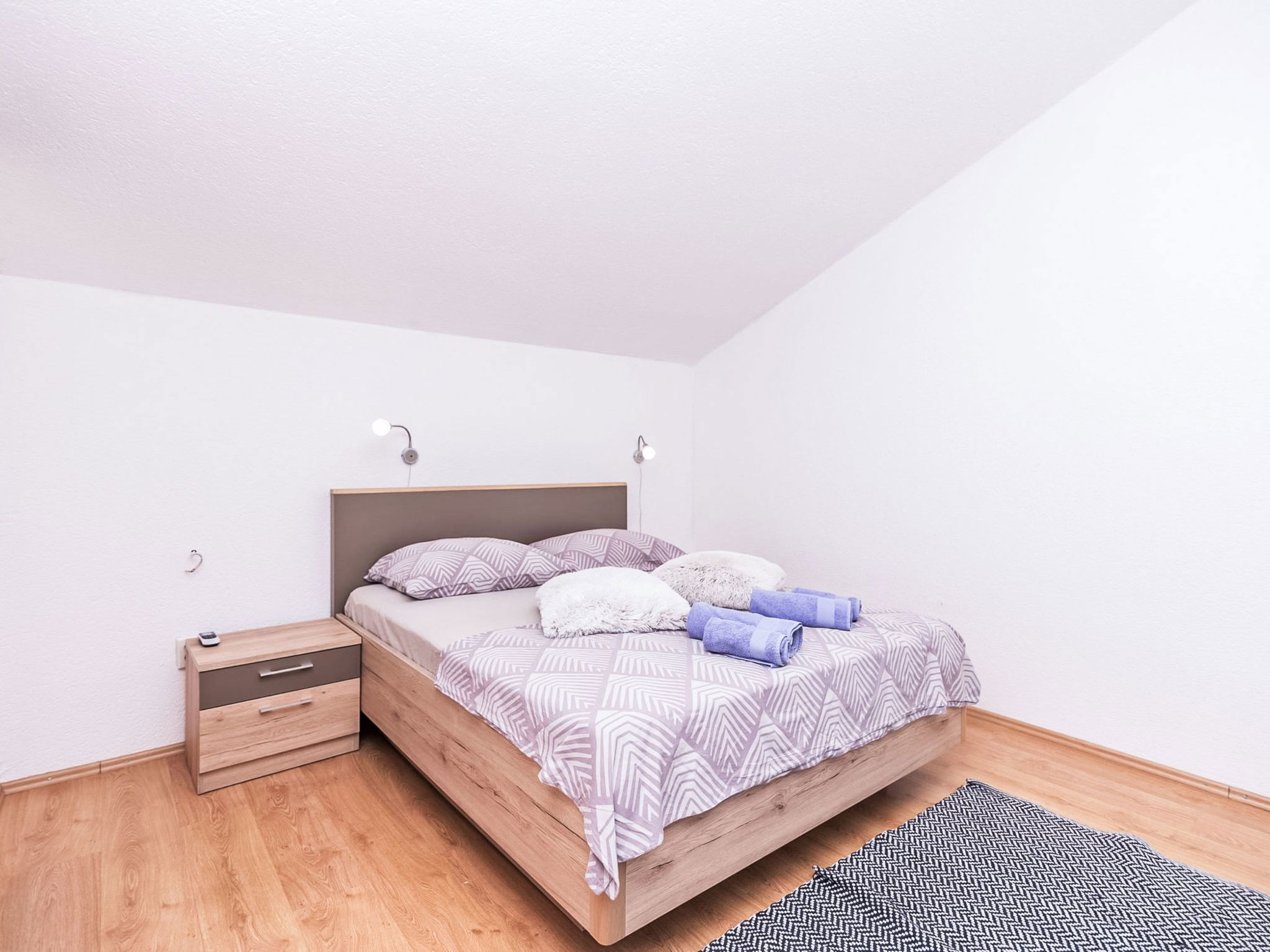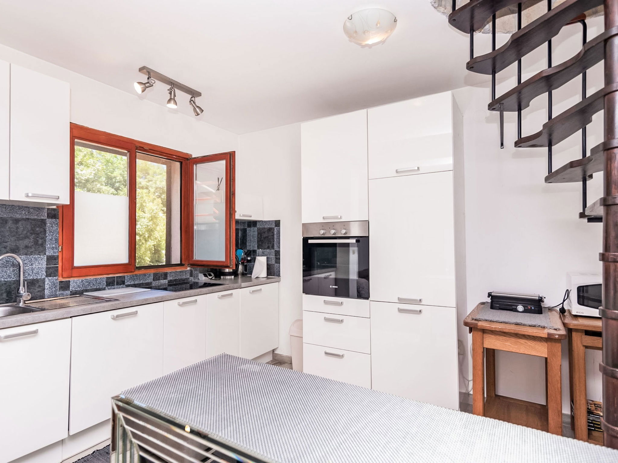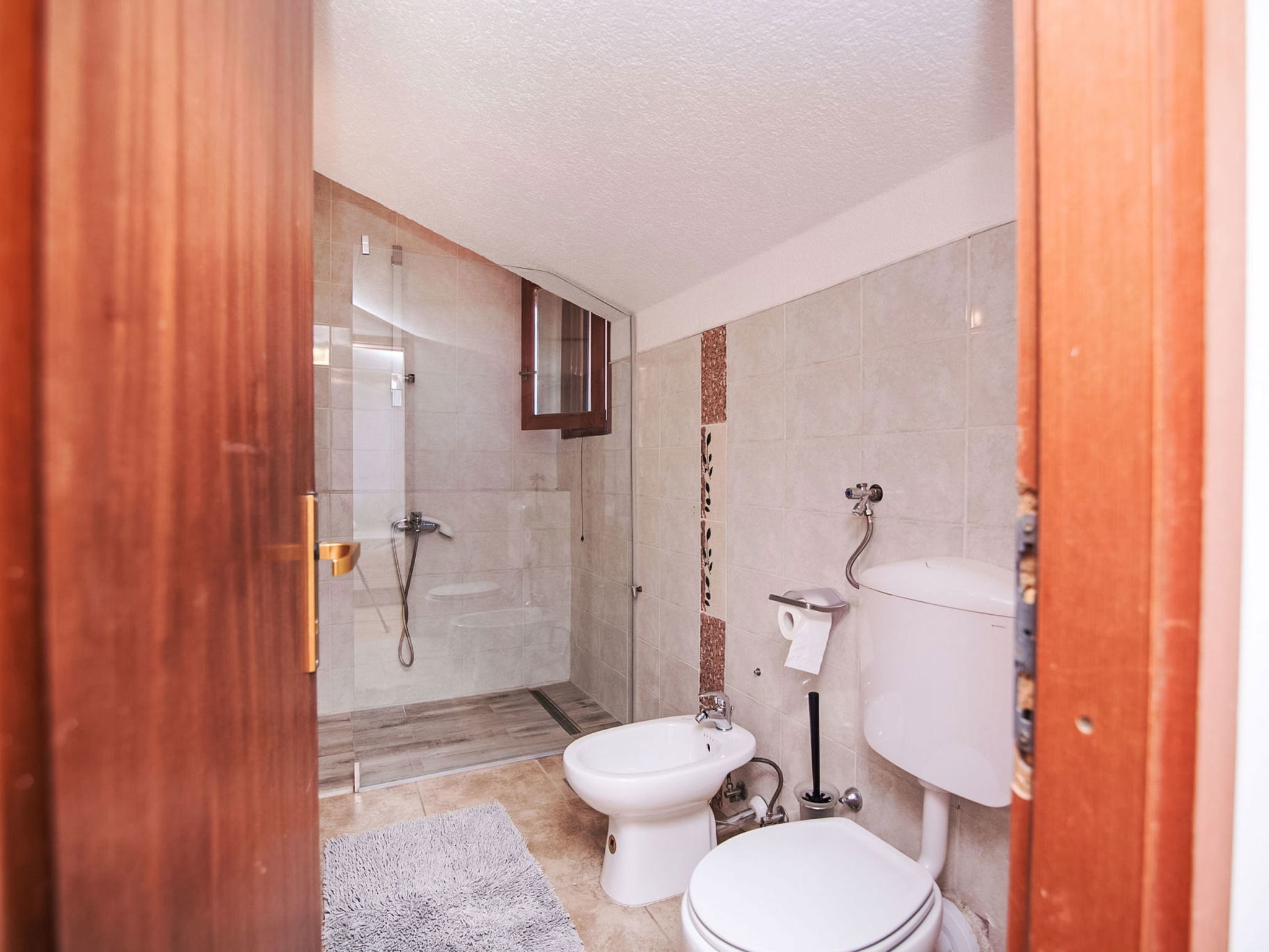 5-room apartment 250 m2. Living/dining room with satellite TV (flat screen). Exit to the terrace. 1 room with 1 french bed (160 cm, length 200 cm), shower/WC. 1 room with 2 beds (90 cm, length 200 cm). 1 room with 2 beds (90 cm, length 200 cm), shower/WC and air conditioning. Open kitchen (oven, dishwasher, 4 ceramic glass hob hotplates, freezer). Shower/WC. No heating option. Upper floor: 1 room with 1 french bed (160 cm, length 200 cm), shower/bidet/WC and air conditioning. Terrace 17 m2, roofed. Terrace furniture, deck chairs (6). Facilities: washing machine, children's high chair, baby cot. Internet (WiFi, free). Maximum 1 pet/ dog allowed.
