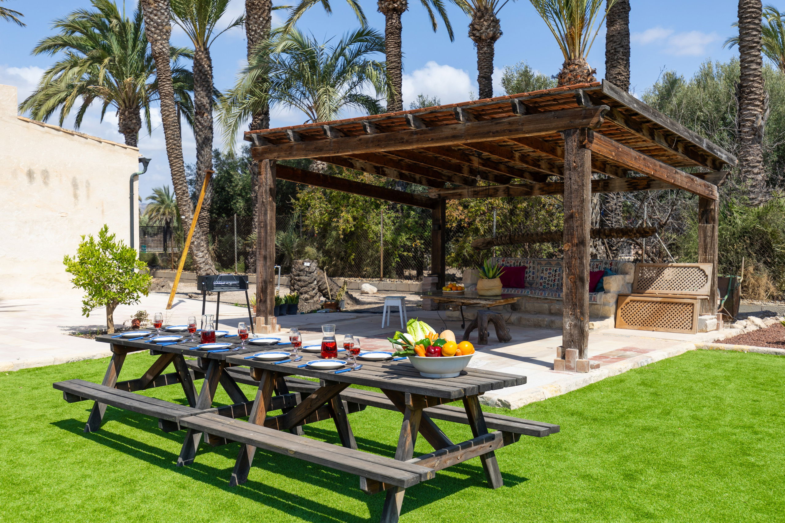 Exterior: Barbecue and outdoor dining area, ideal for enjoying outdoor meals and celebrations. Play area for children's entertainment.