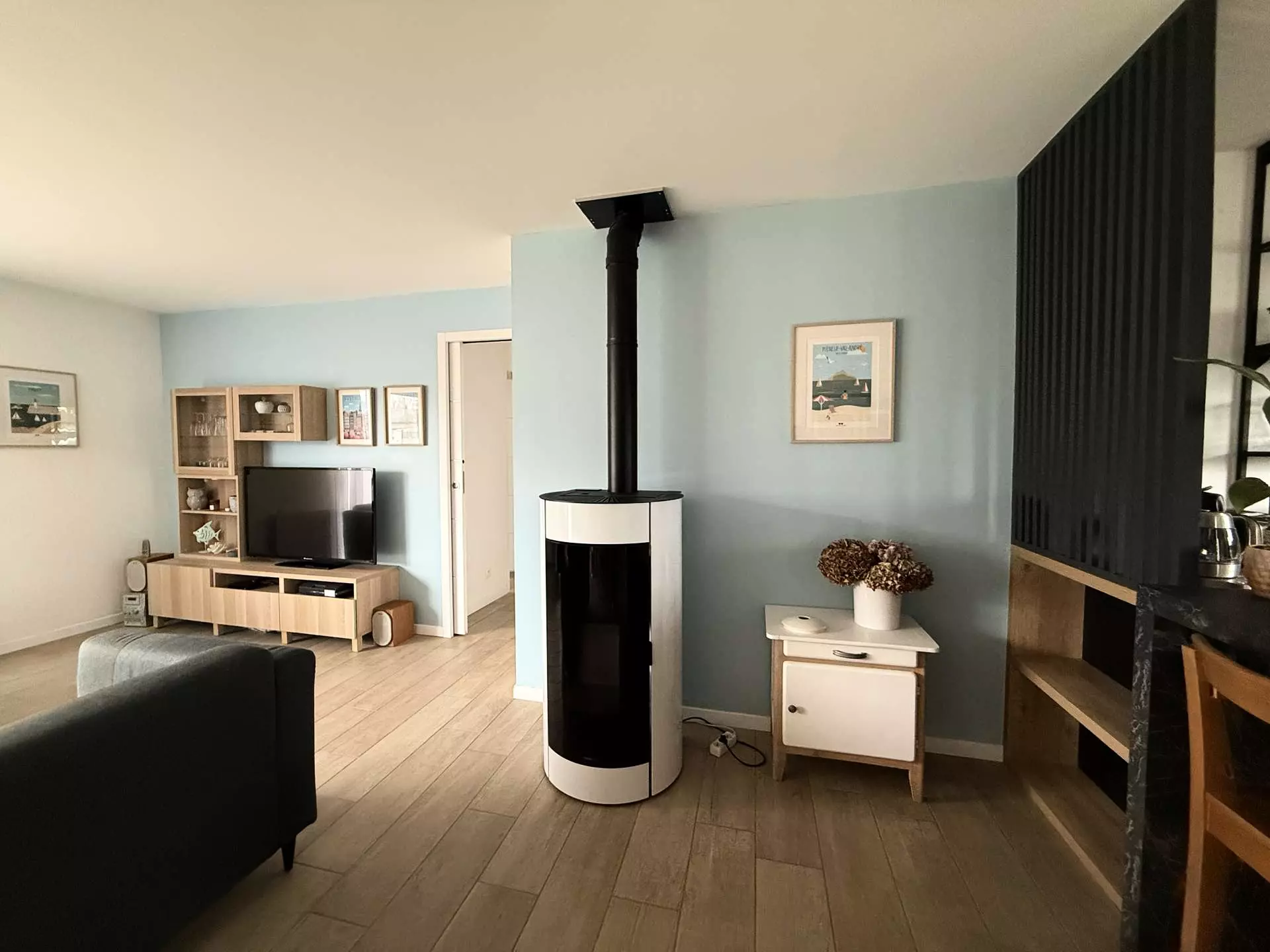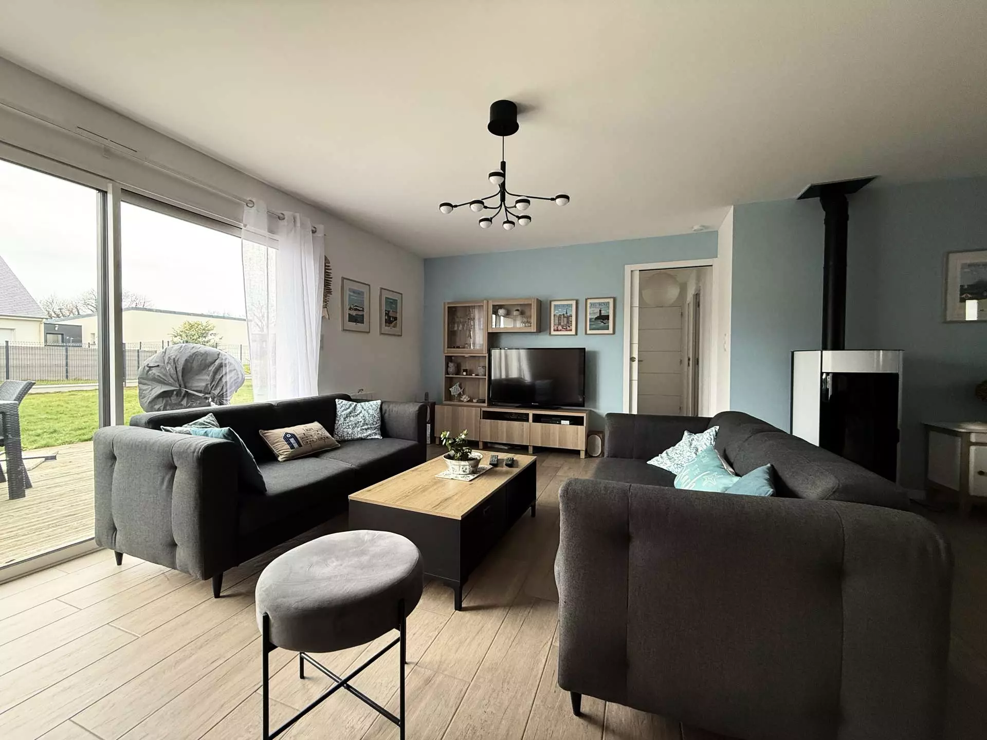 - Living room area (sofas, television), pellet stove.