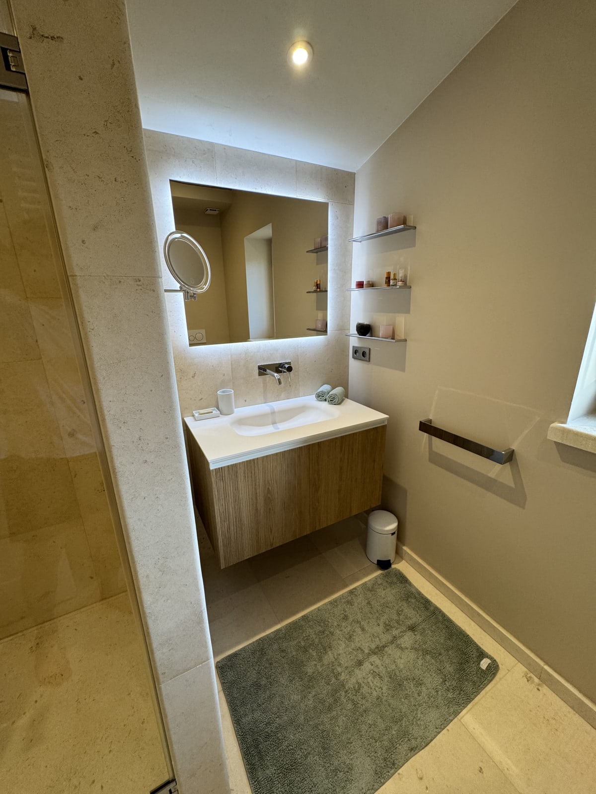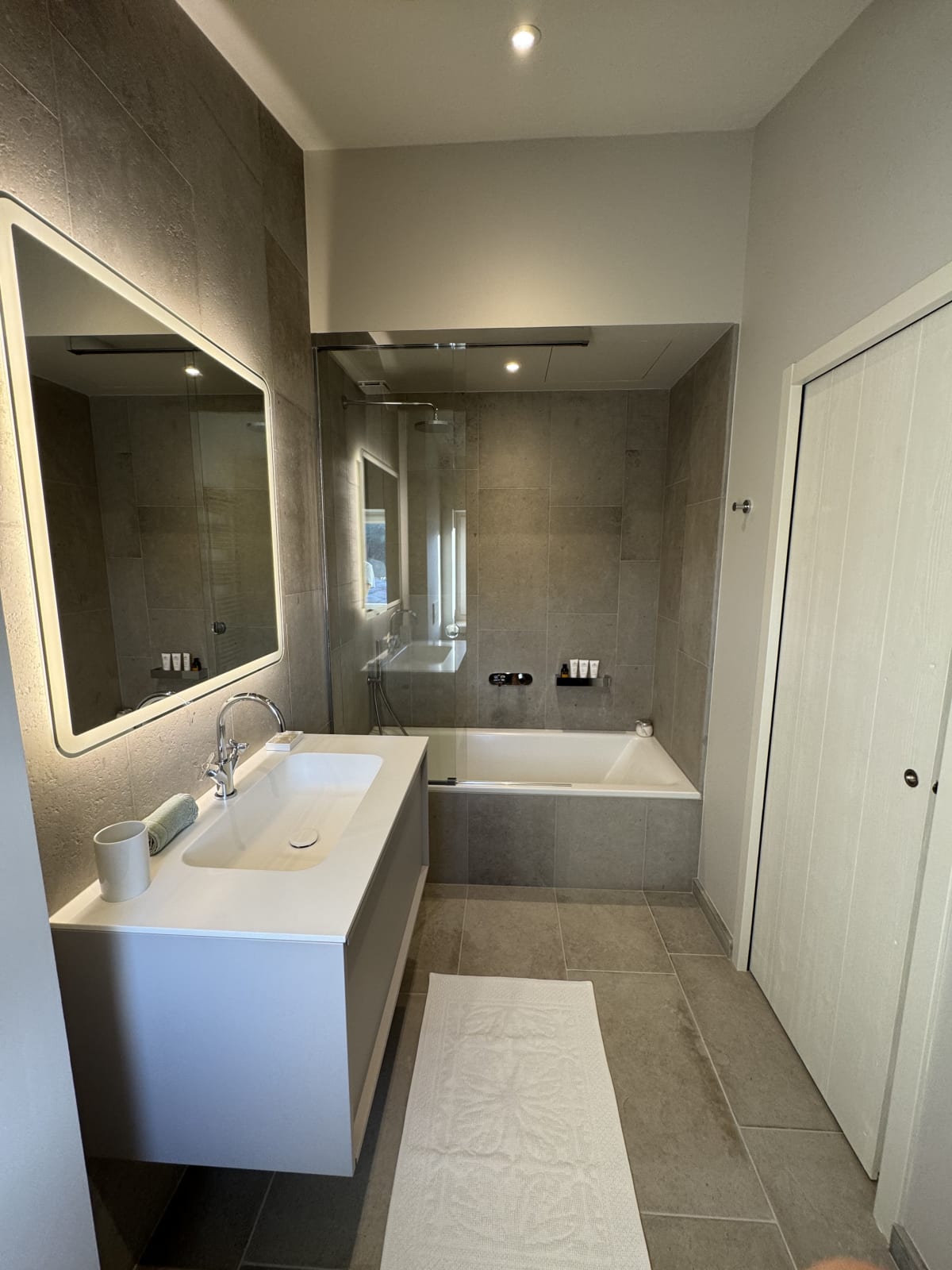 Bedroom 2: twin beds 2x90x200 cm (convertible to 180x200 cm), large closets, bathroom with sink, walk-in shower and WC. Garden view