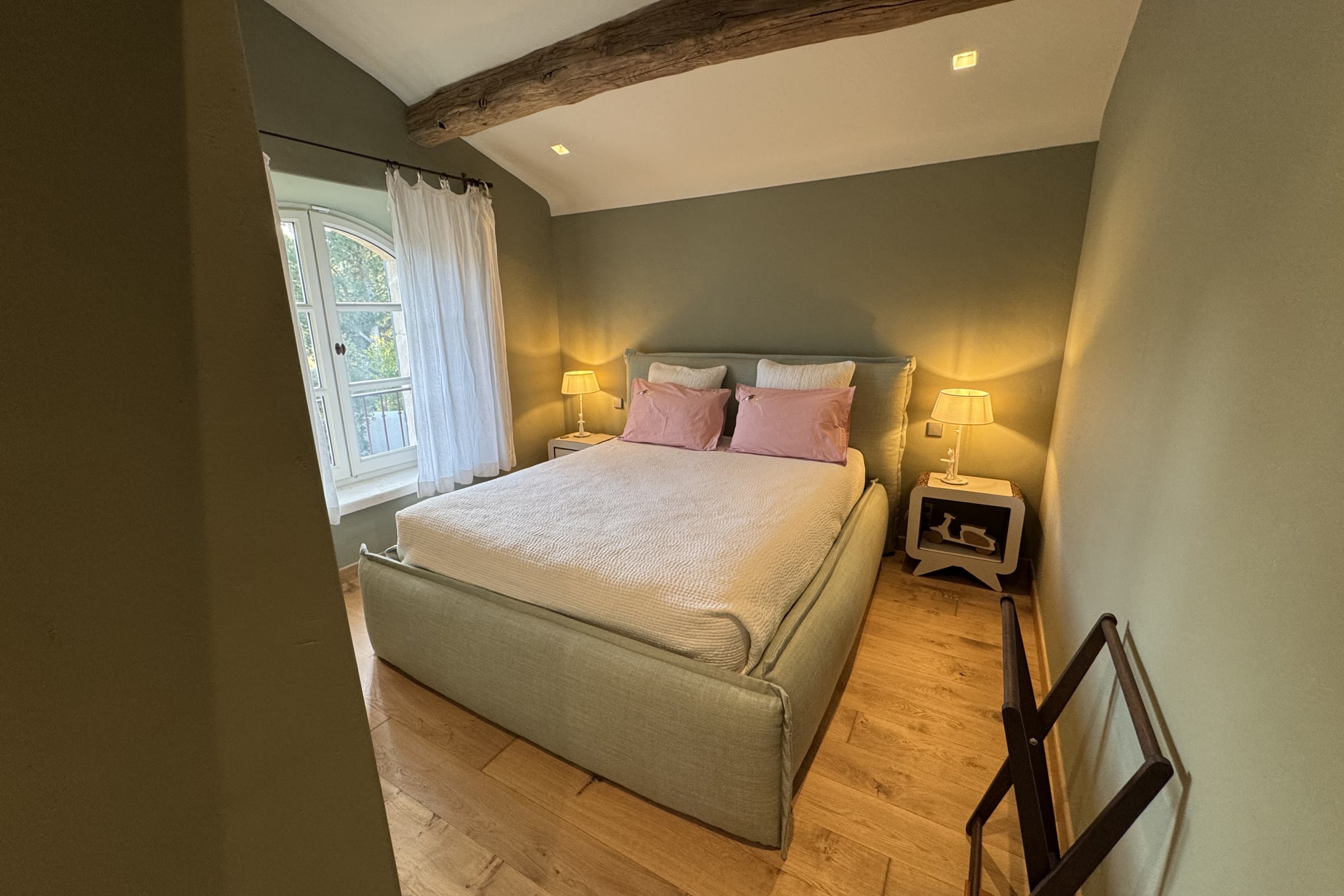 Bedroom 5: queen-size bed 160x200 cm, large closets, bathroom with sink, shower and WC. Garden view