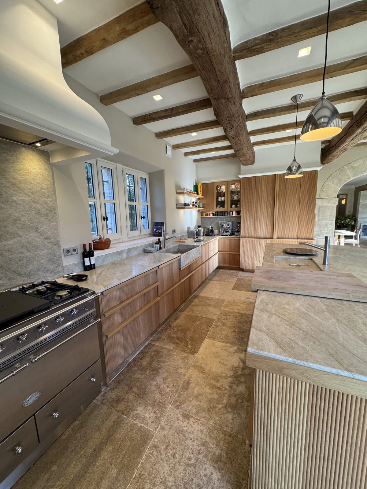 A large kitchen equipped with a magnificent 90 cm Lacanche range and high-end appliances (2 refrigerators, 2 dishwashers, combined steam/microwave oven, pod coffee maker, juicer...). Its large bay window opens onto a dining terrace overlooking the garden