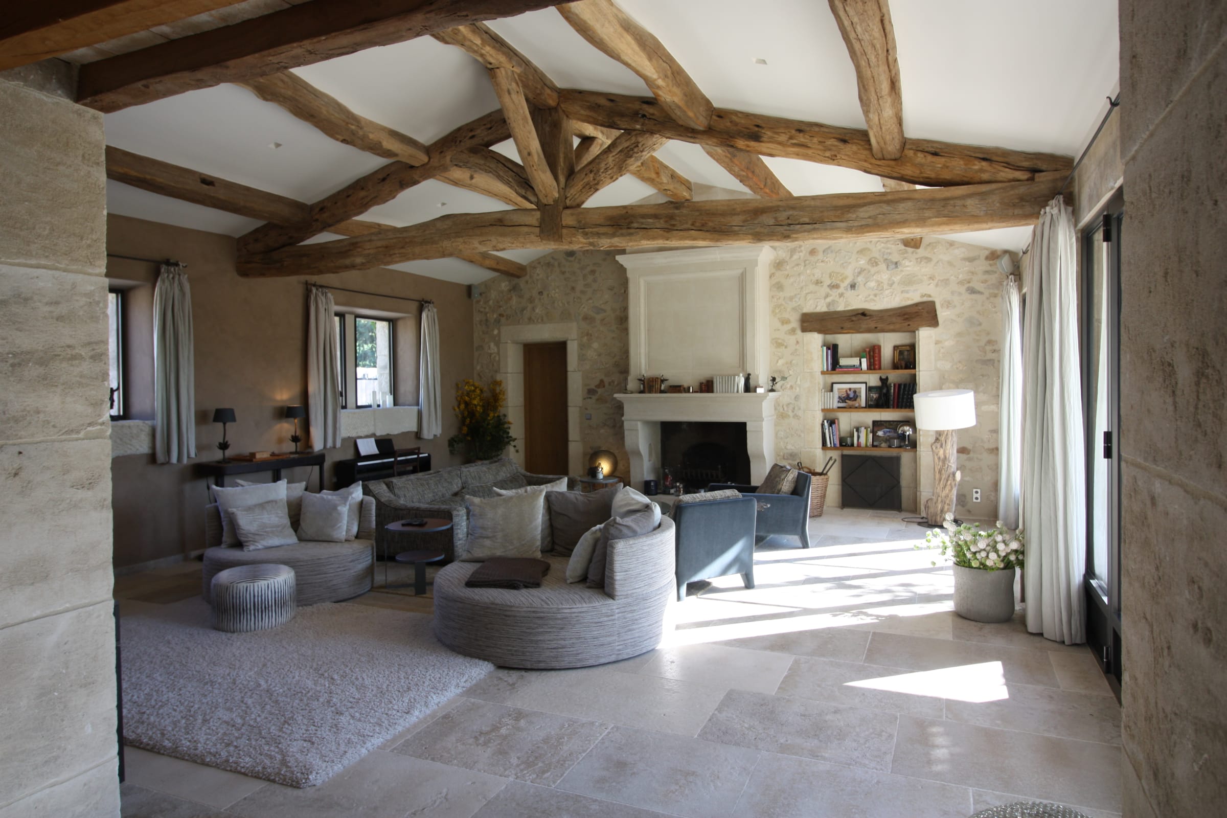 A spacious living room with a functional fireplace, opening onto a shaded terrace offering a sumptuous view of the garden and the Alpilles
