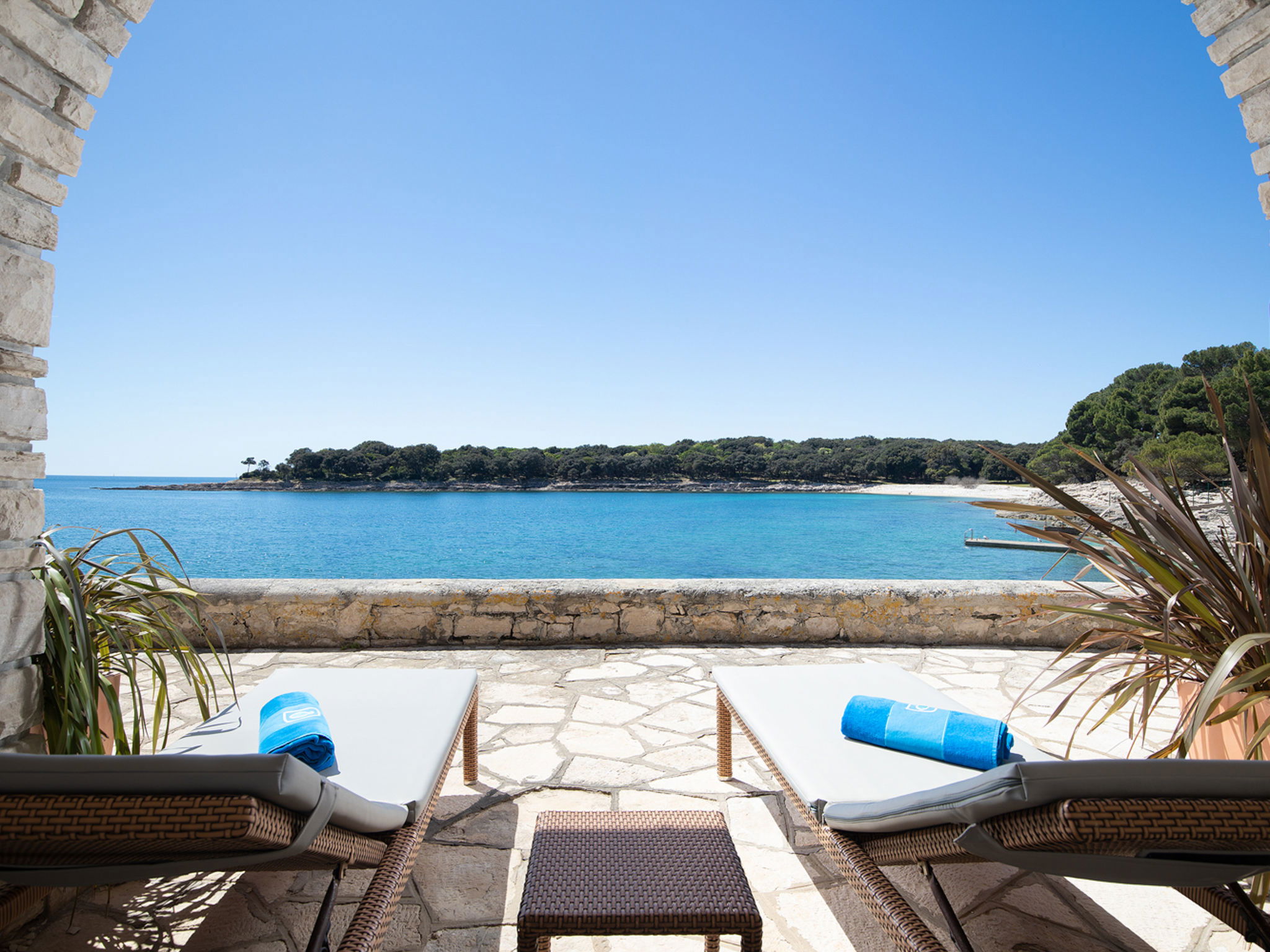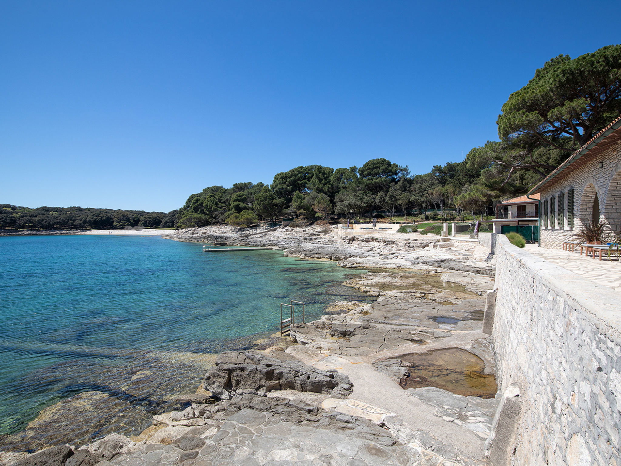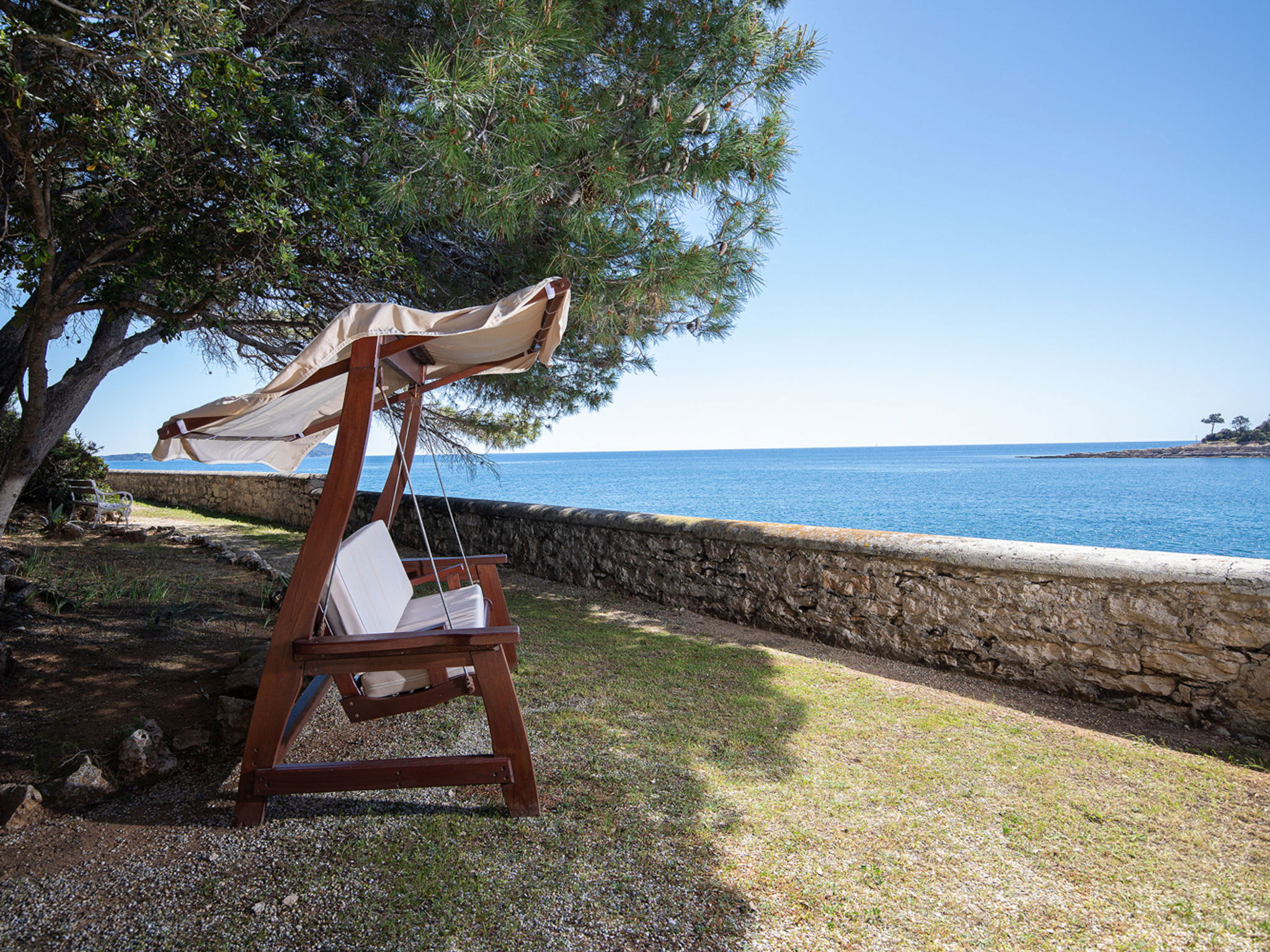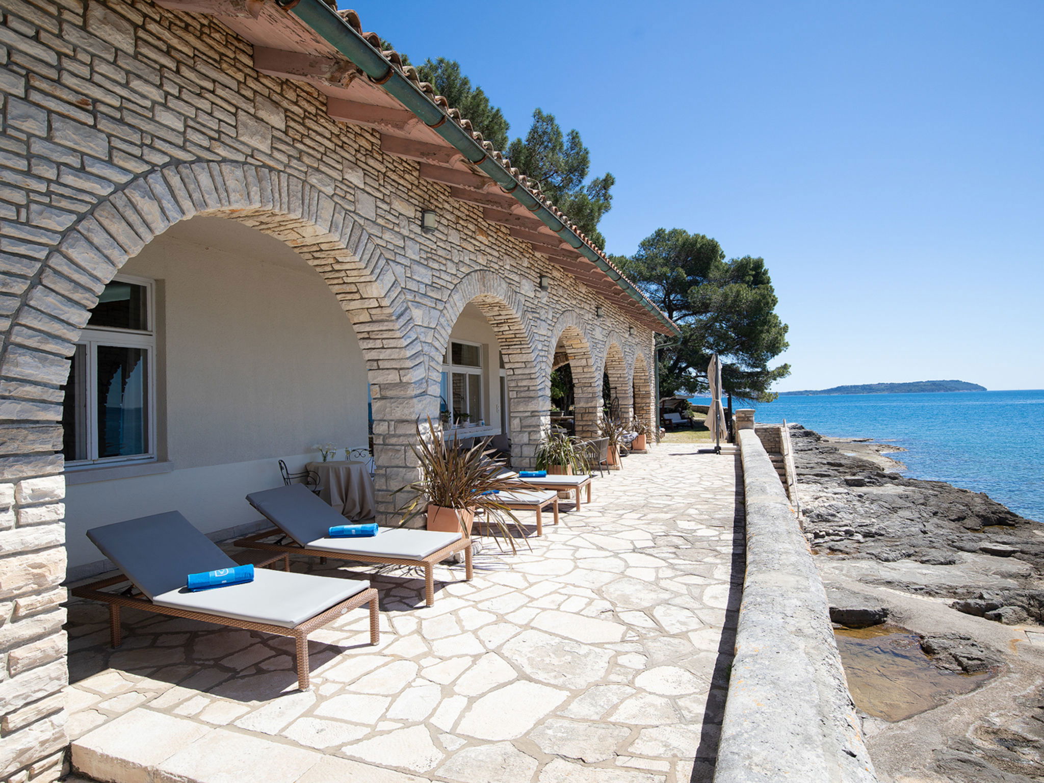 The Villa is located in the National park, The use of electric golf car and cycles is in price included. Available: speedboat for transfer from the land to the island and from the island to the land back. Villa "Primorka". 3.5 km from the centre of Fažana, 5 m from the beach, direct access to the beach. Private: property 6'222 m2 (fenced). Outdoor shower, private beach, garden furniture, barbecue. In the house: internet access. Room cleaning daily (included). Breakfast (included). Parking (for 2 cars, extra), single garage. E-charging station. Shop 3.5 km, supermarket 3.5 km, restaurant 1 km, bar 1 km, bus stop 3.5 km, pebble beach 5 m. Object suitable for 8 adults. Please note: airfield 10 km from the property.