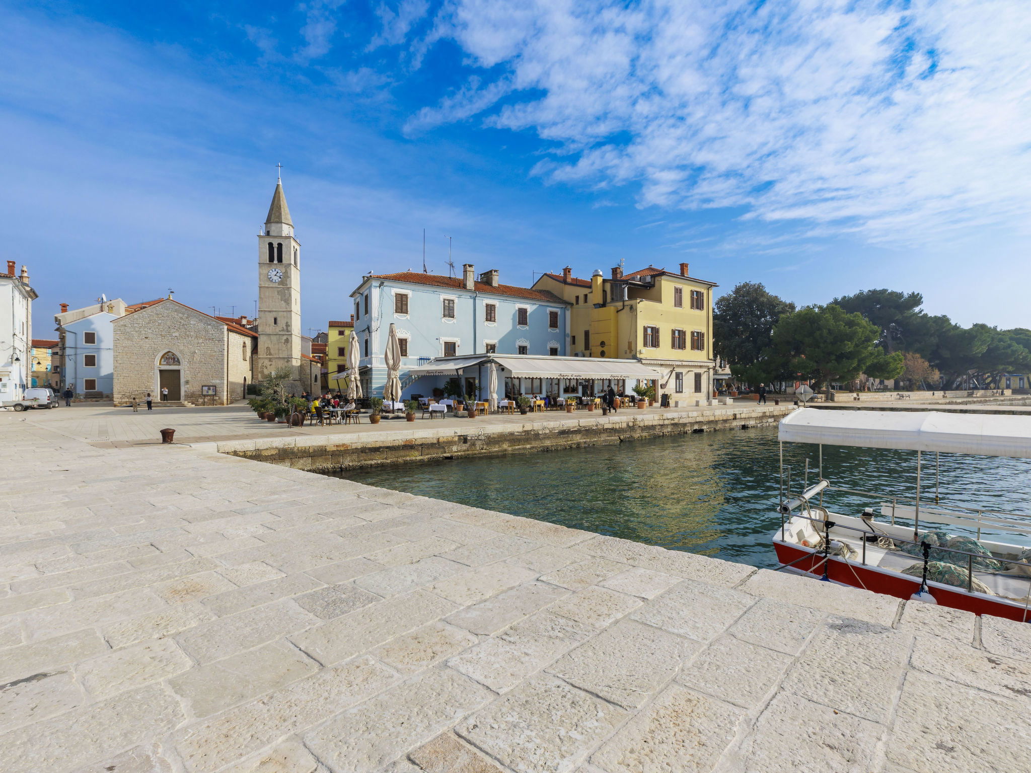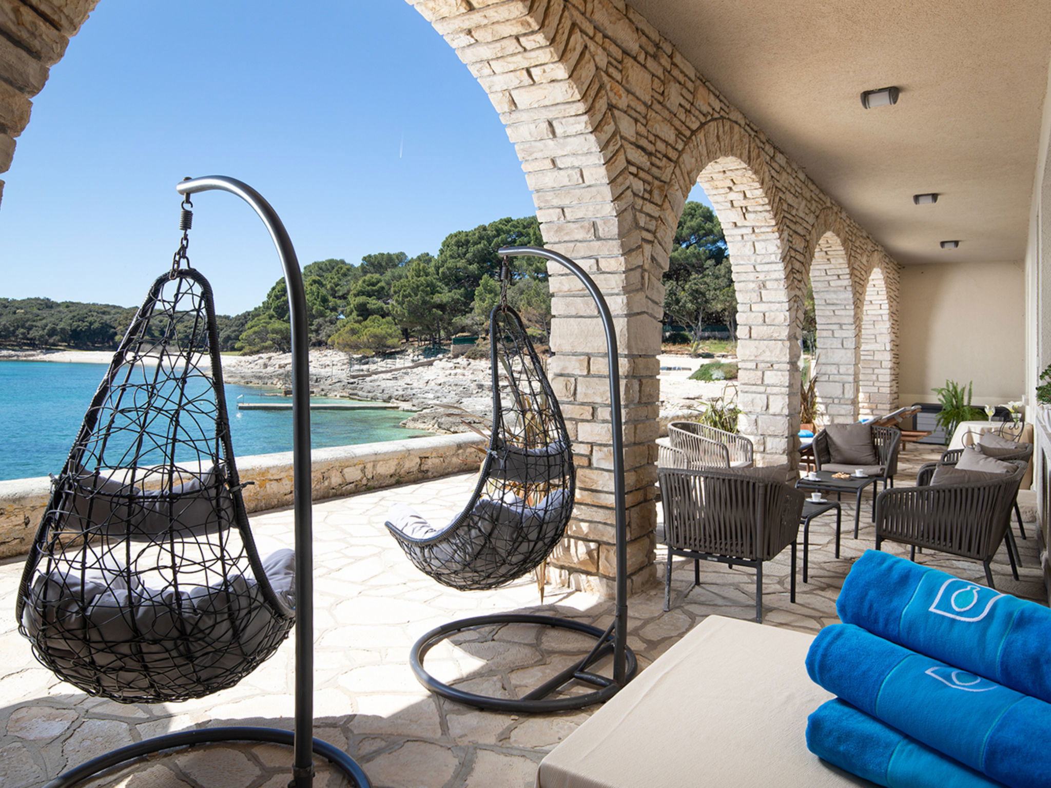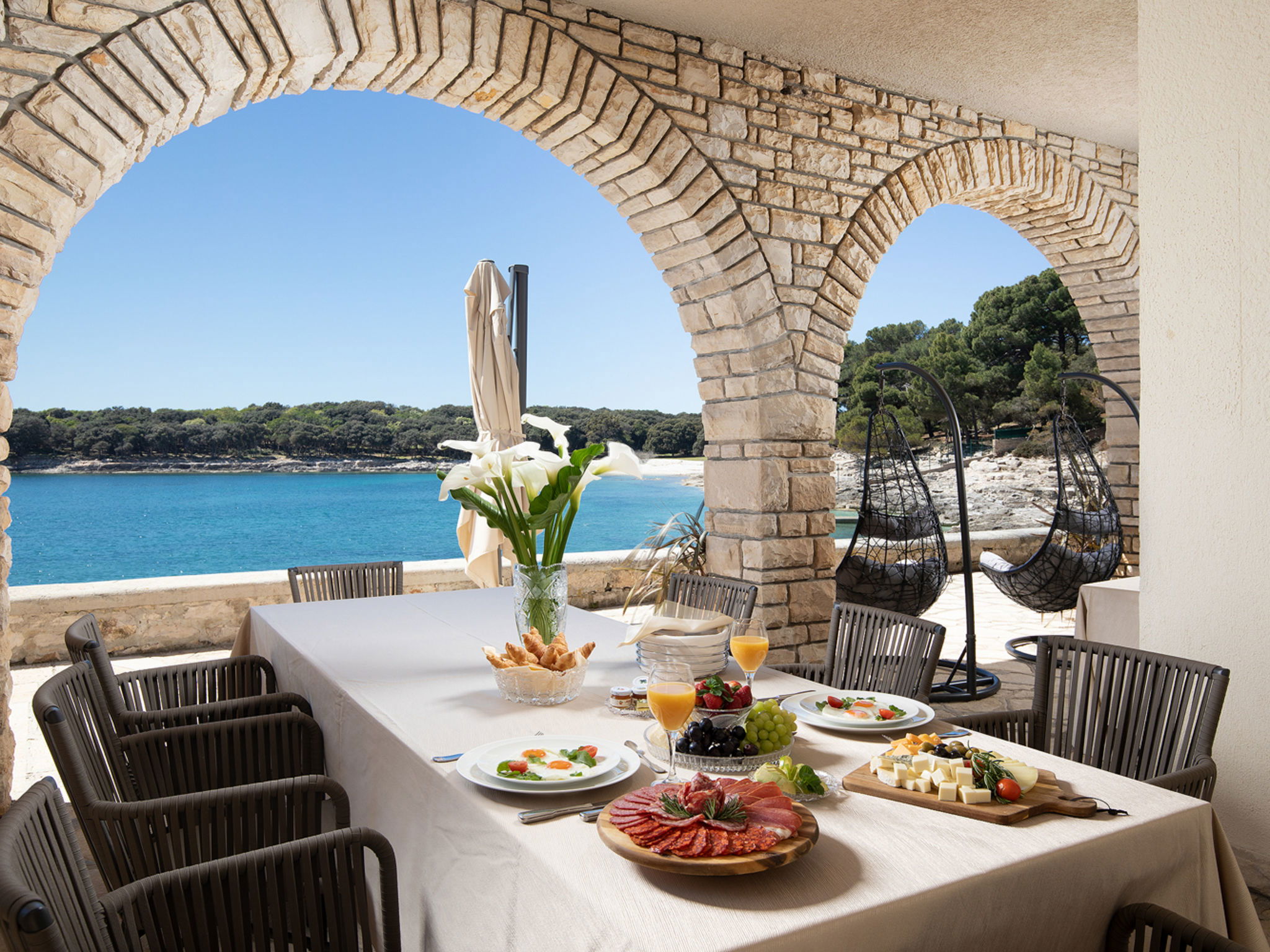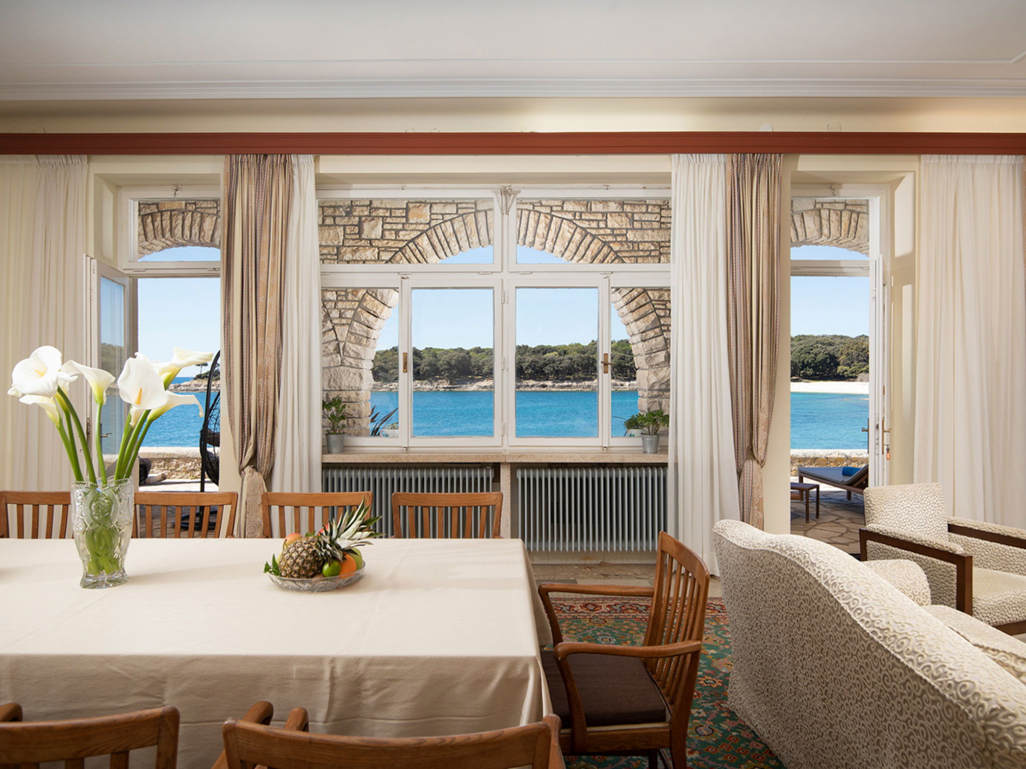 The Villa is located in the National park, The use of electric golf car and cycles is in price included. Available: speedboat for transfer from the land to the island and from the island to the land back. Villa "Primorka". 3.5 km from the centre of Fažana, 5 m from the beach, direct access to the beach. Private: property 6'222 m2 (fenced). Outdoor shower, private beach, garden furniture, barbecue. In the house: internet access. Room cleaning daily (included). Breakfast (included). Parking (for 2 cars, extra), single garage. E-charging station. Shop 3.5 km, supermarket 3.5 km, restaurant 1 km, bar 1 km, bus stop 3.5 km, pebble beach 5 m. Object suitable for 8 adults. Please note: airfield 10 km from the property.