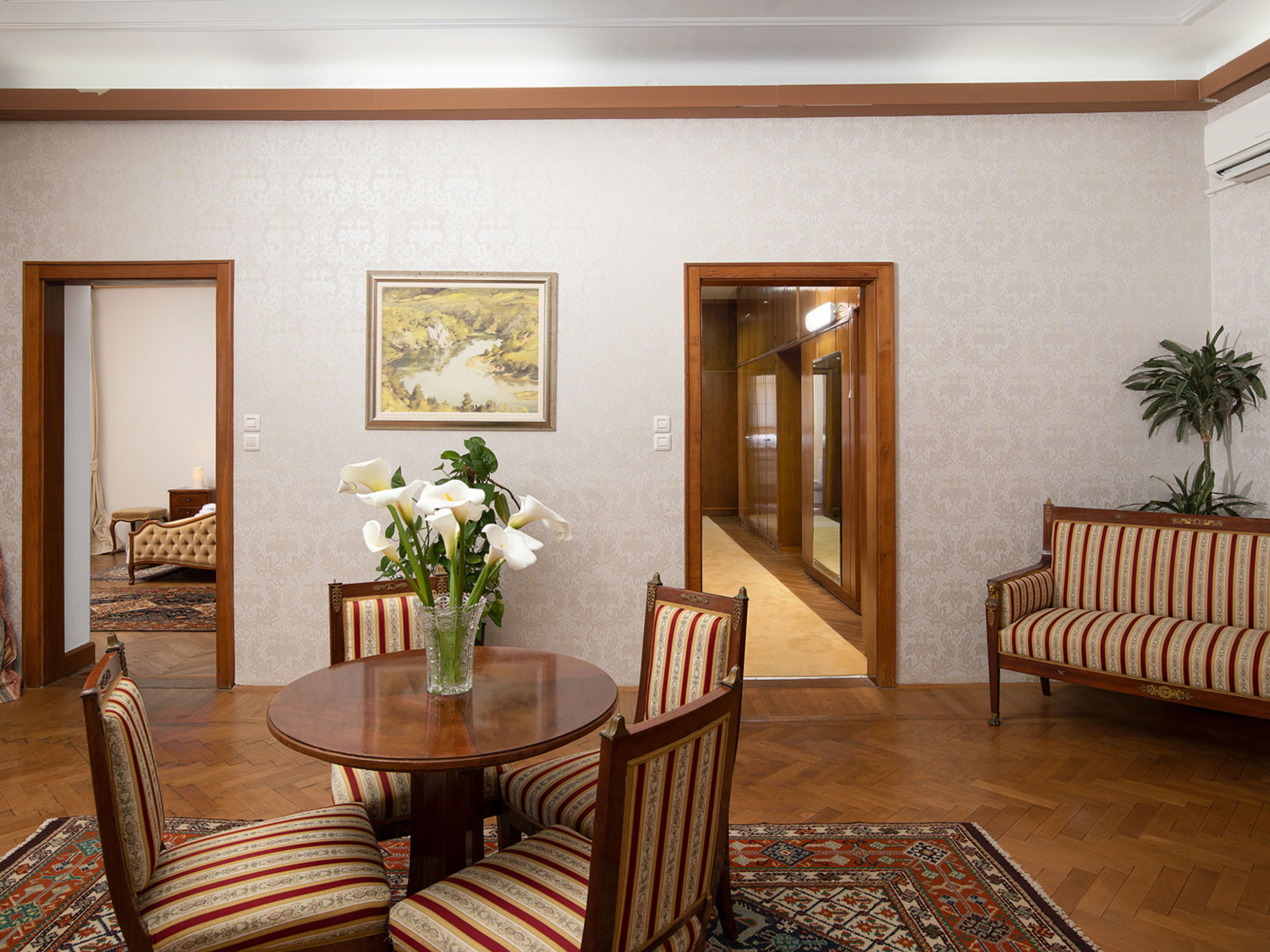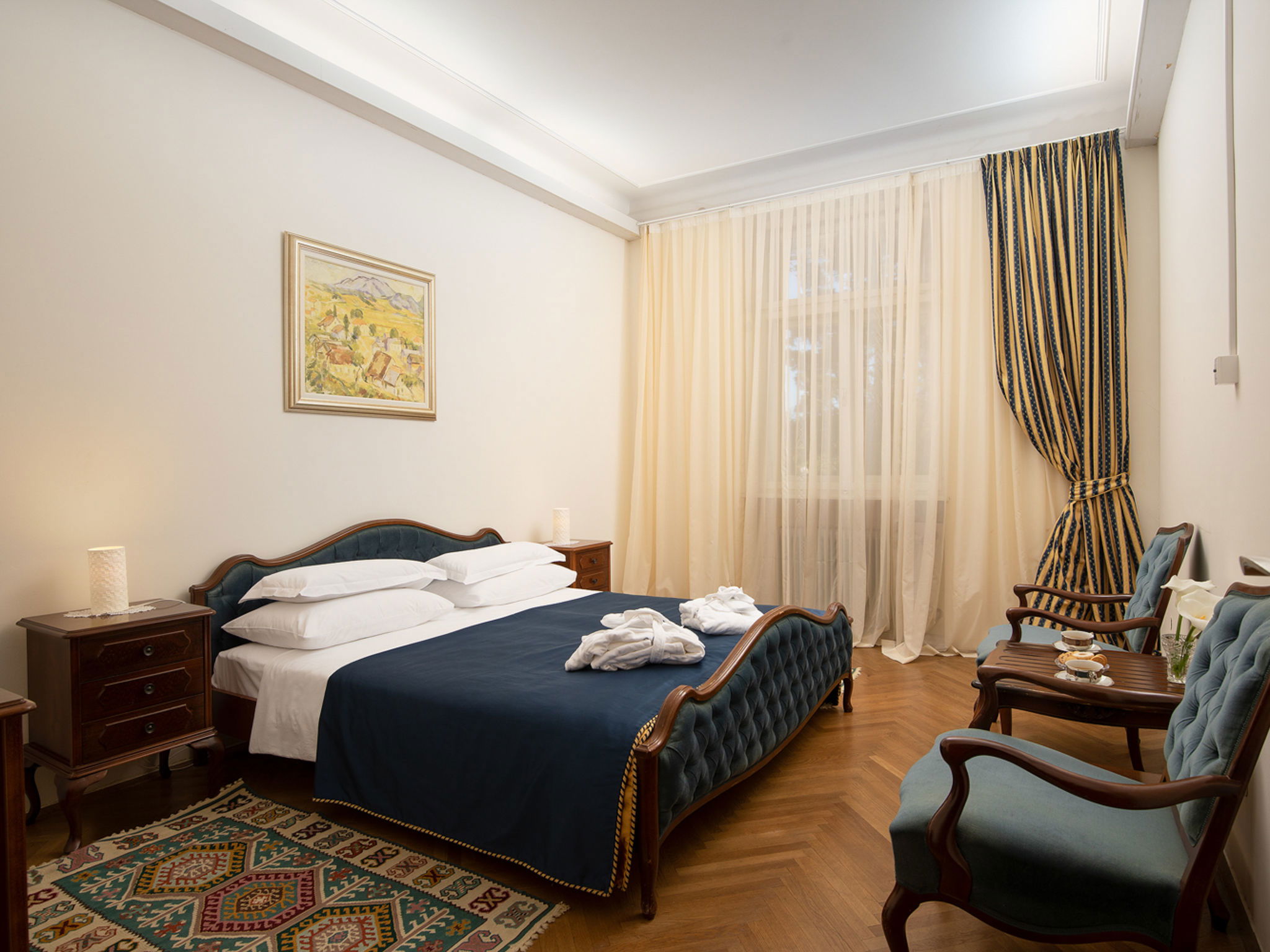 5-room villa 310 m2. Comfortable and antique furnishings: living/dining room with satellite TV (flat screen), air conditioning. Exit to the terrace. 1 room with 1 french bed (180 cm, length 200 cm), bidet, shower/WC and satellite TV (flat screen). 3 rooms, each room with 1 french bed (180 cm, length 200 cm), satellite TV (flat screen). Open kitchen (oven, dishwasher, 4 ceramic glass hob hotplates, microwave, freezer, electric coffee machine). Bath/WC. Terrace 50 m2, roofed. Terrace furniture, barbecue, deck chairs. Beautiful view of the sea. Facilities: Internet (WiFi, free). Please note: maximum 1 pet/ dog allowed. Fire extinguisher.