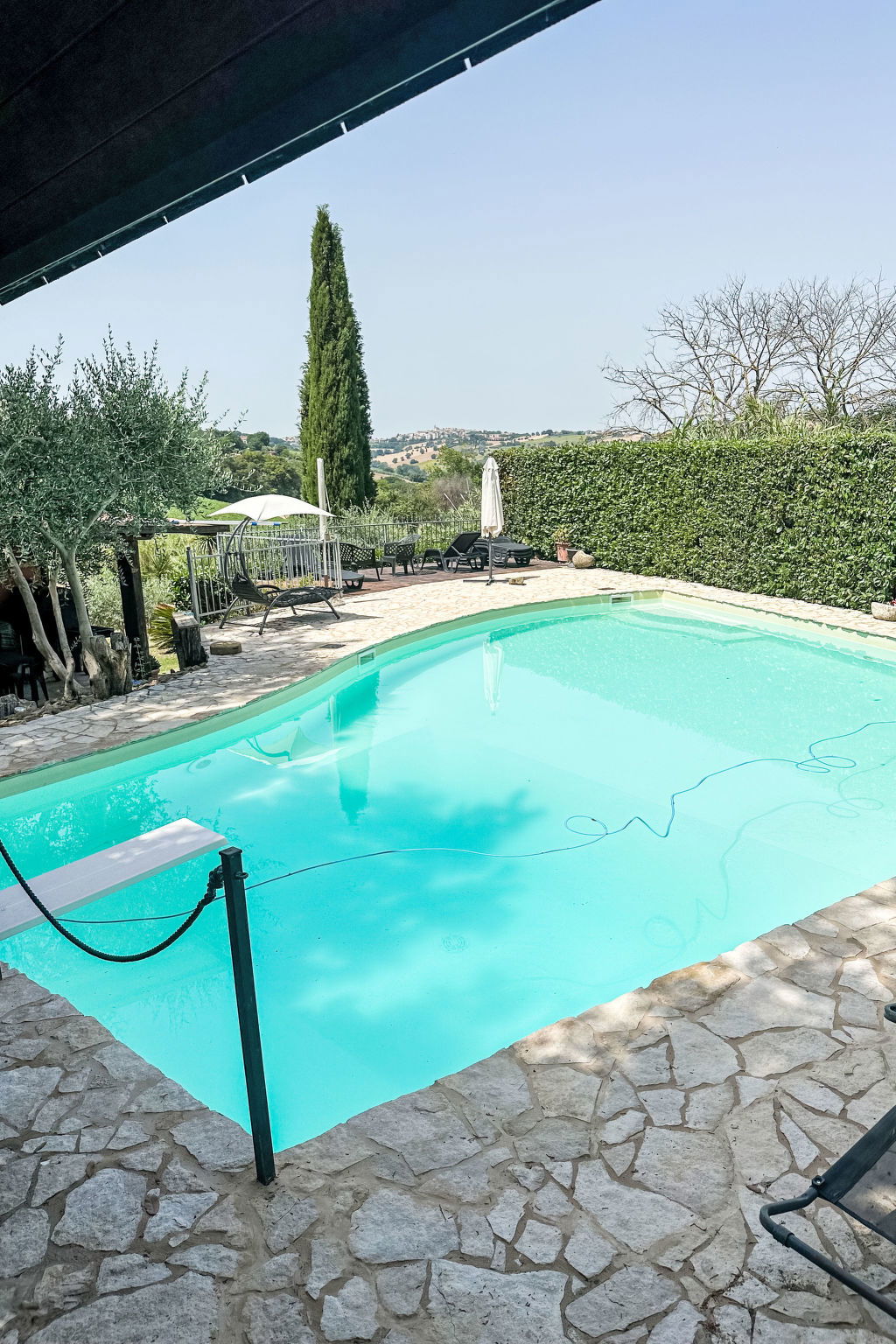 Large, beautiful farmhouse "Martin", built in 2008, renovated, surrounded by meadows and fields. Outside the resort Montegranaro, 15 km from the sea. Private: property 600 m2 (fenced), well-kept garden 400 m2, swimming pool (10 x 6 m, depth 140 - 240 cm, seasonal availability: 01.Apr. - 15.Oct.) with internal staircase. Unconventional pool shape. WC in the pool area, paddling pool, outdoor shower, pool house, terrace, garden furniture, barbecue, parking (for 5 cars) on the premises. Bus stop 700 m, sandy beach "Civitanova Marche" 8 km pebble beach "Civitanova Marche" 8 km. The owner does not accept any youth groups.
