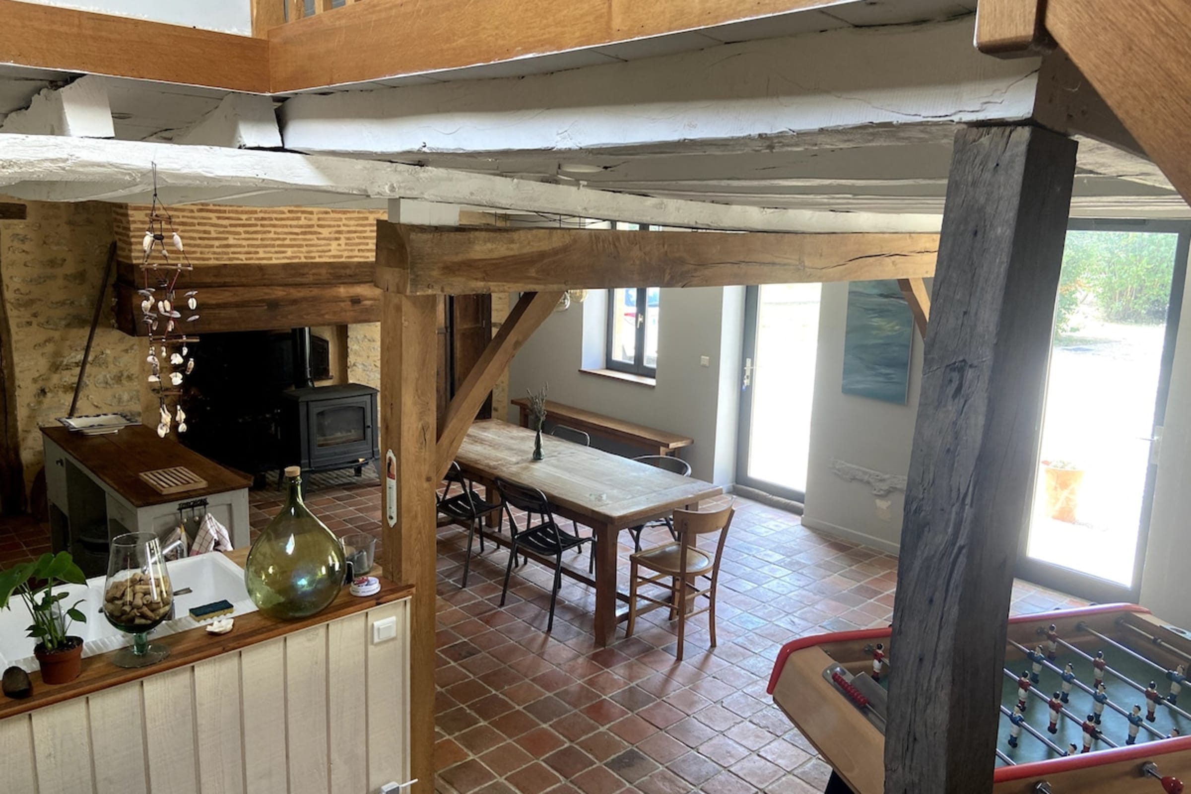 - A spacious and convivial living area combining kitchen and dining room, with a wood-burning stove for cozy moments 🔥