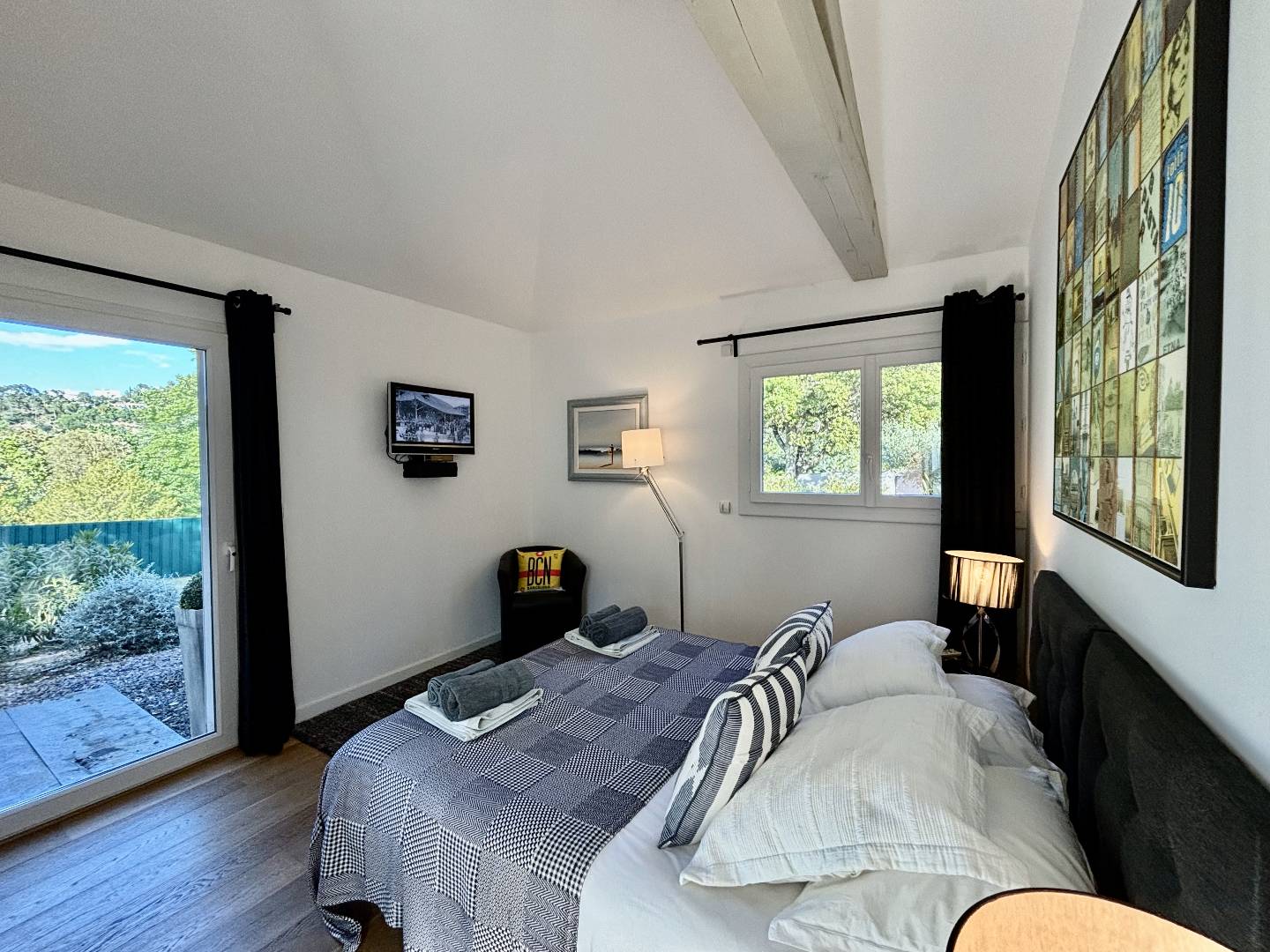 Bedroom 2: 160 cm double bed, walk-in wardrobe, en-suite full bathroom, direct access to the pool.