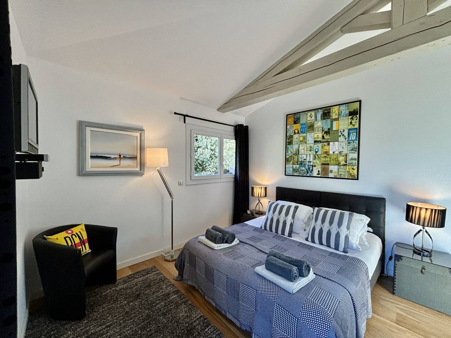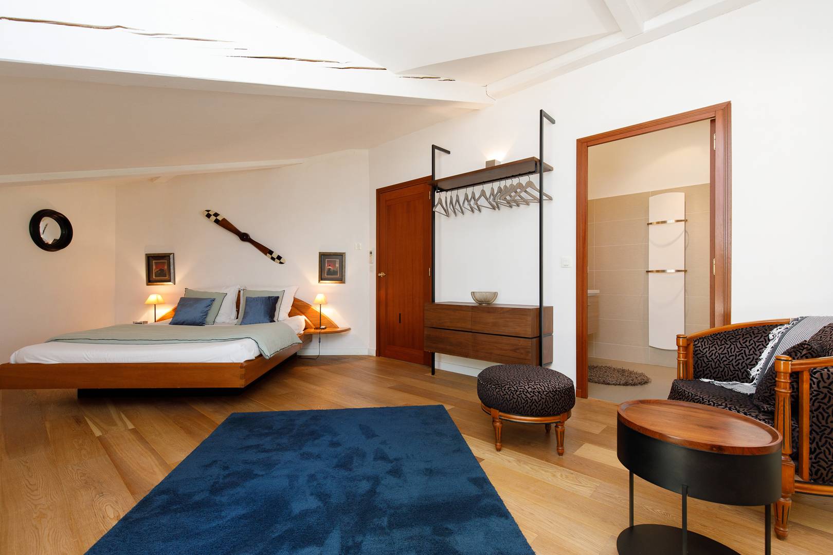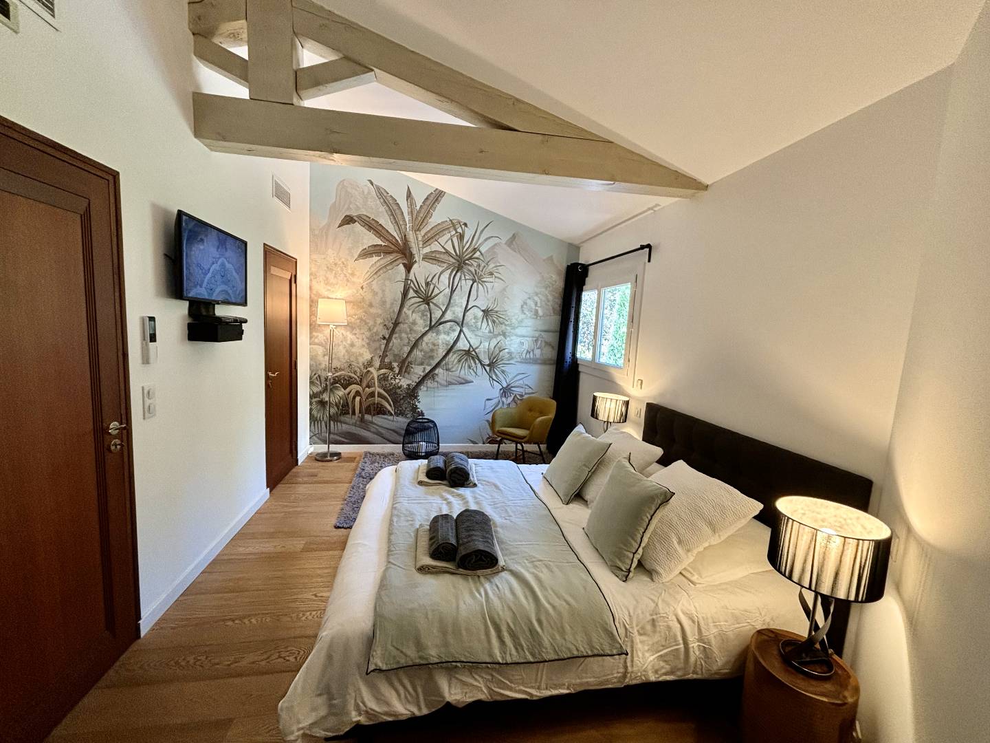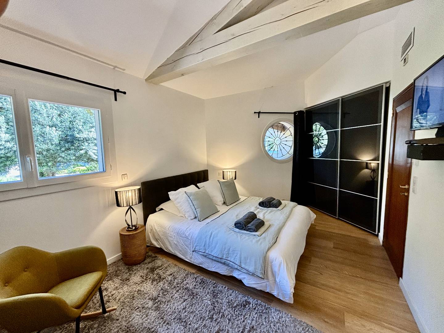 Master Bedroom: King-size bed (180 cm), walk-in wardrobe, en-suite shower room with double shower and WC, direct access to the pool.