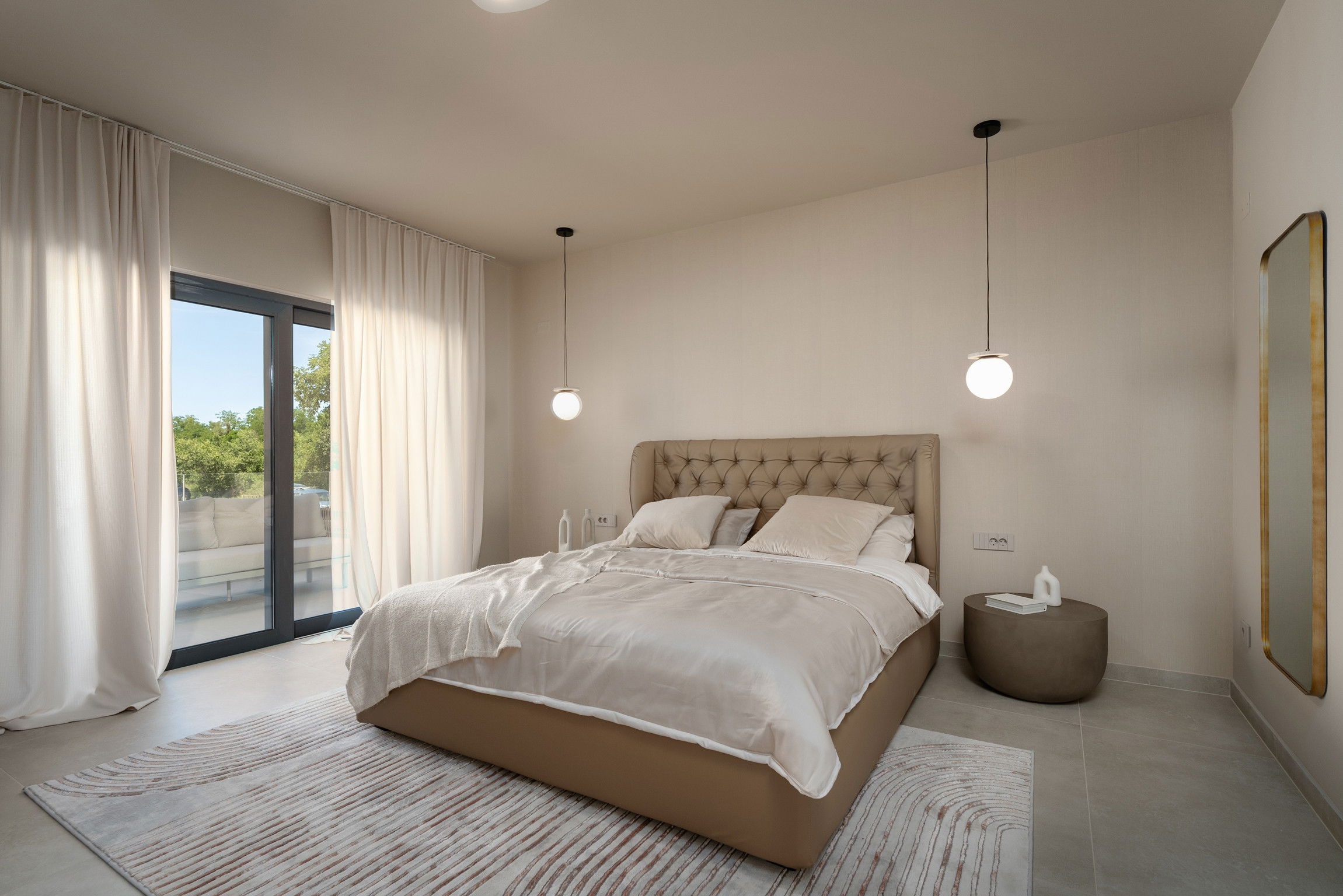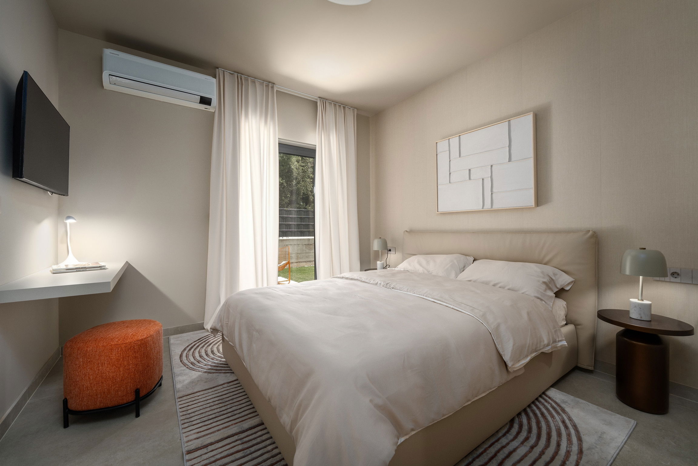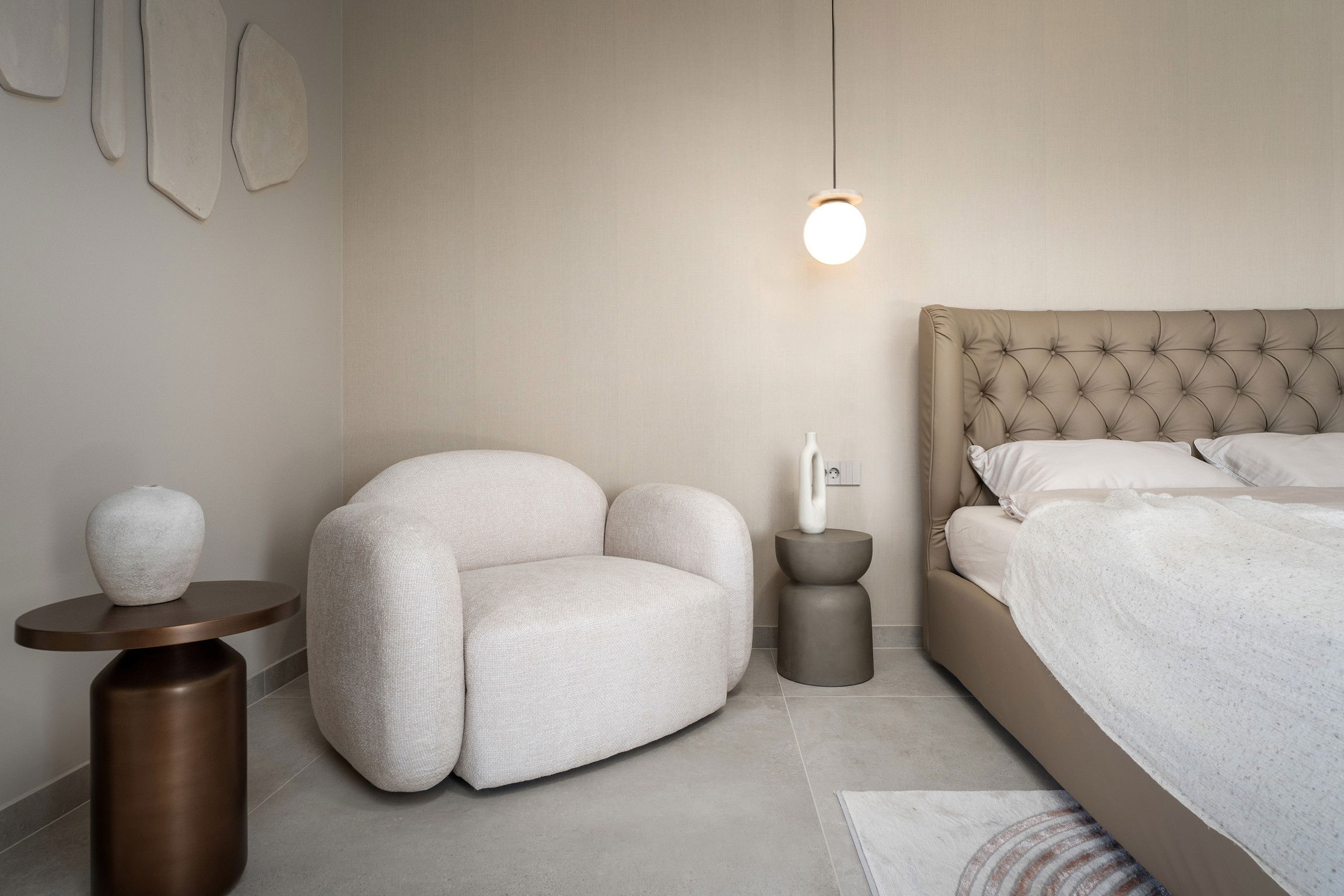 The heart of the villa opens onto a stunning 1000m2 outdoor area with a private 36 sq meter swimming pool and a relaxing jacuzzi, perfect for soaking up the sun during the day or unwinding under the stars in the evening. Comfortable loungers and outdoor seating create an inviting space for both relaxation and social gatherings. An outdoor kitchen ensures families can stay together even while preparing meals.