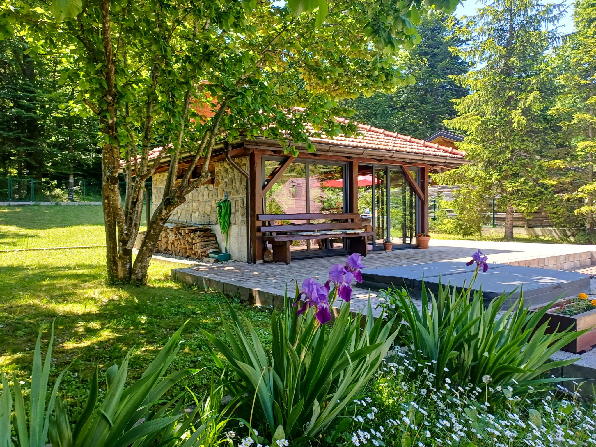 Beautiful, cosy single-family house "Chalet Relax", 2 storeys, detached, surrounded by trees and meadows. In the hamlet Vrelo 5 km from the centre of Fužine, 550 m from the lake, 25 km from the beach, in a cul-de-sac. Private: property 1'500 m2 (fenced), well-kept garden with flowers and trees. Terrace (20 m2), garden furniture, barbecue. In the house: internet access, WiFi, sauna, hot tub, air conditioning, washing machine. Parking (for 2 cars) at the house on the premises. Shop 3.5 km, restaurant 3.5 km, bus stop "Fužine" 3.5 km, railway station "Fužine" 4 km, shingle beach "Kraljevica" 25 km, bathing lake "Lepenica" 550 m. Nearby attractions: Cave Vrelo 500 m, Lake Bajer 3.5 km. Please note: airfield 35 km from the property.