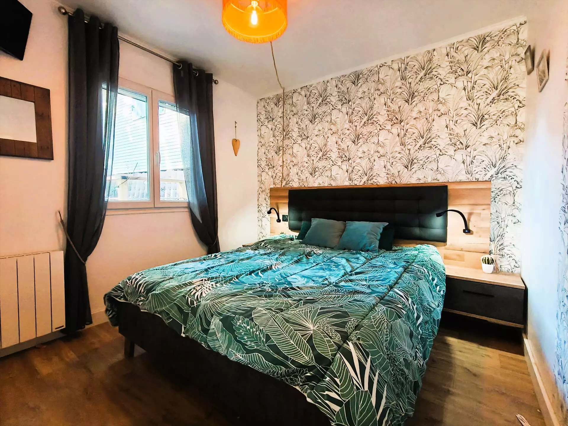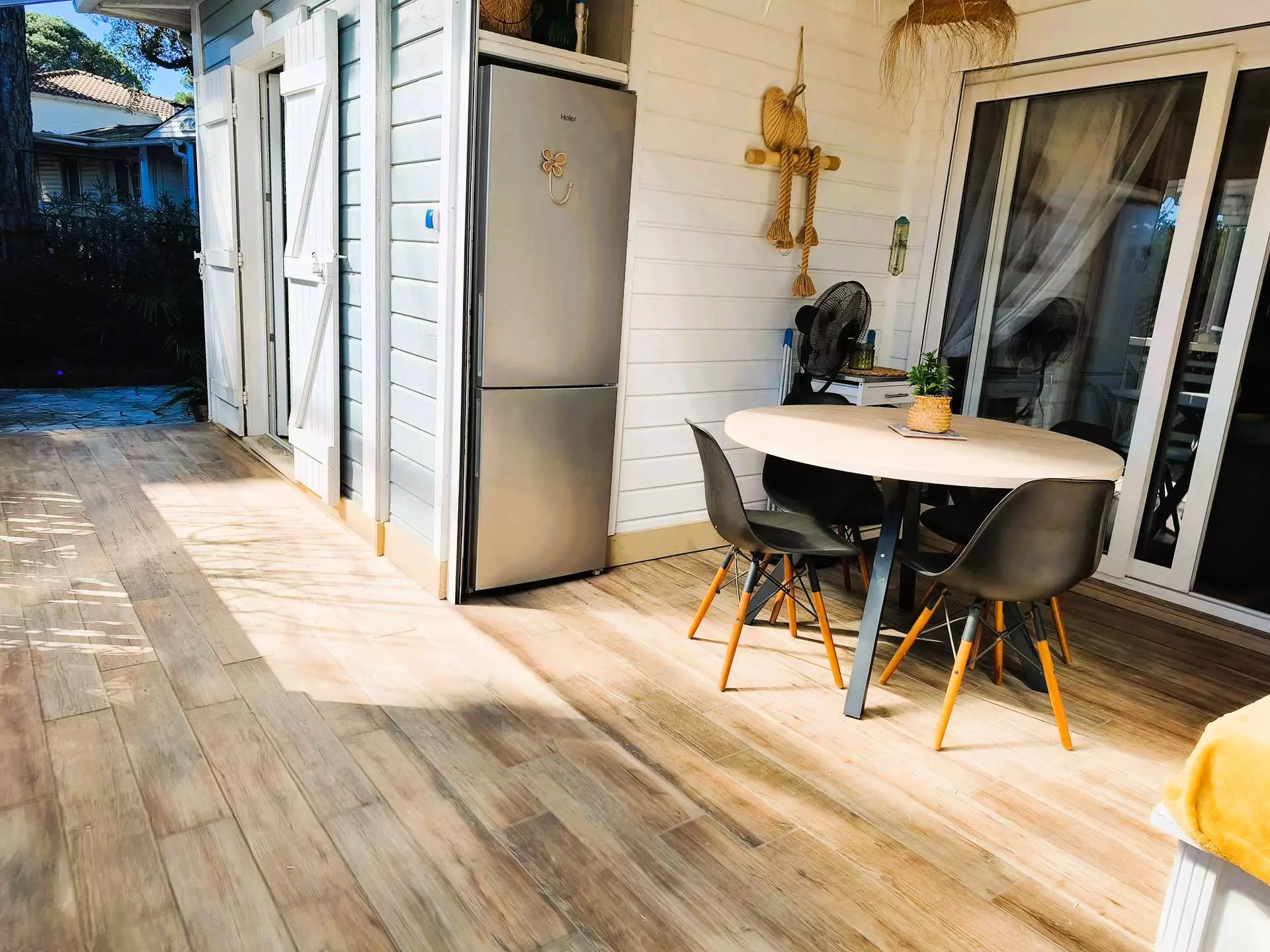 This chalet of approximately 50 m2 has a beautiful equipped kitchen with a pantry opening onto the living room and a dining area, a pleasant 15m² terrace, and 2 bedrooms, one with a double bed (160), and one with a single bed bunked over a double bed (140). You will have a bathroom with WC.