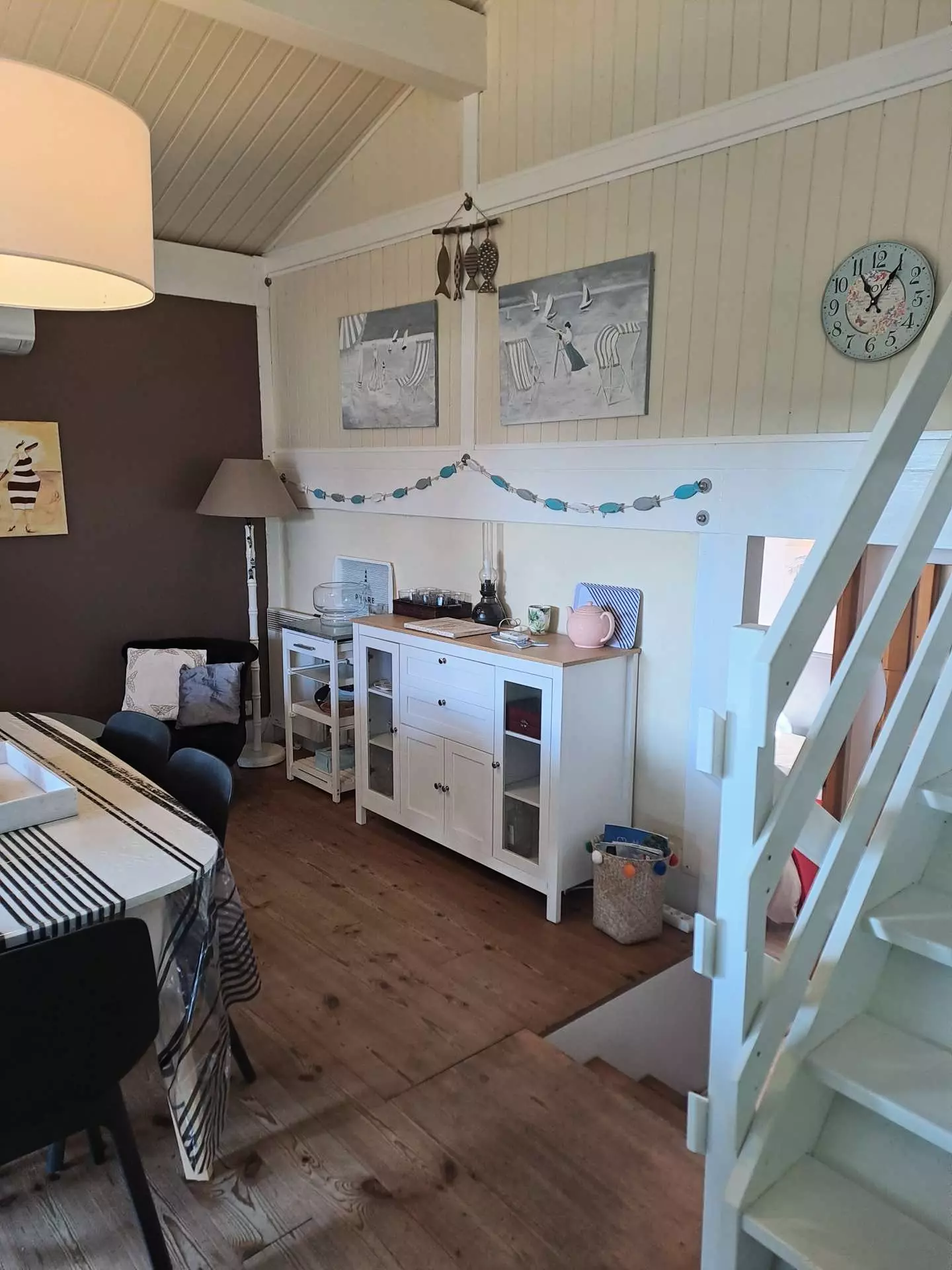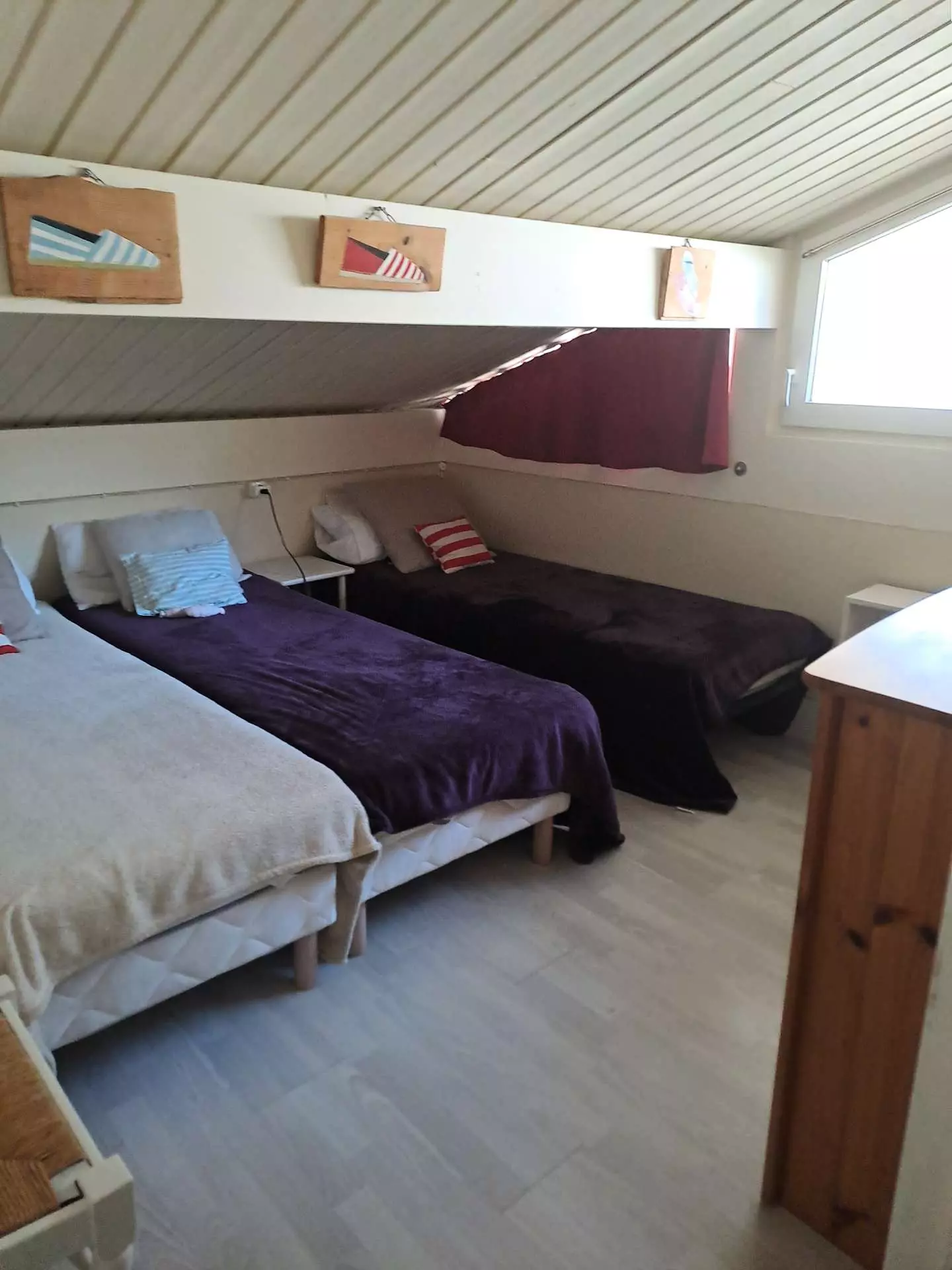 - on the mezzanine: a living room with a convertible sofa and a bedroom with 3 single beds.