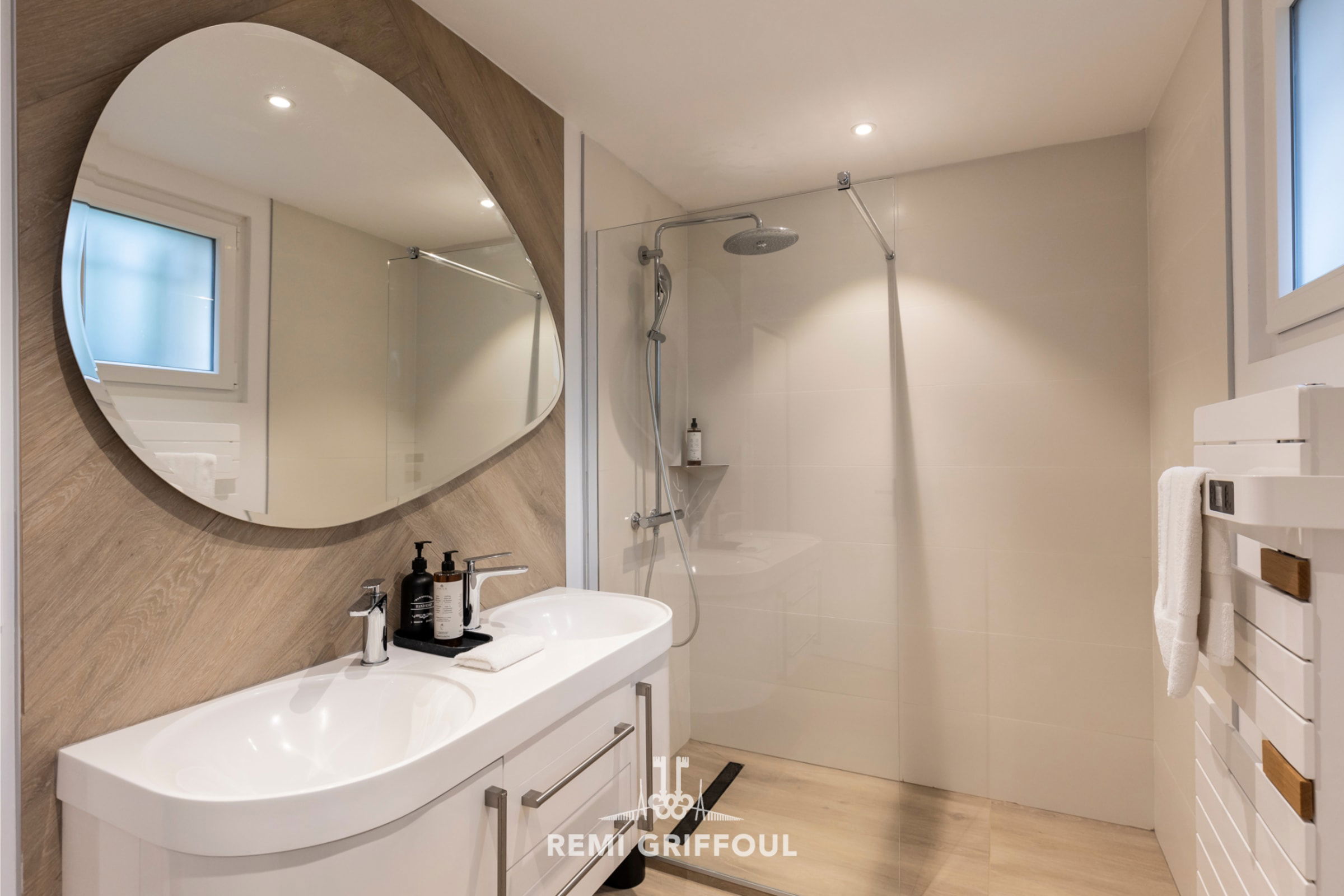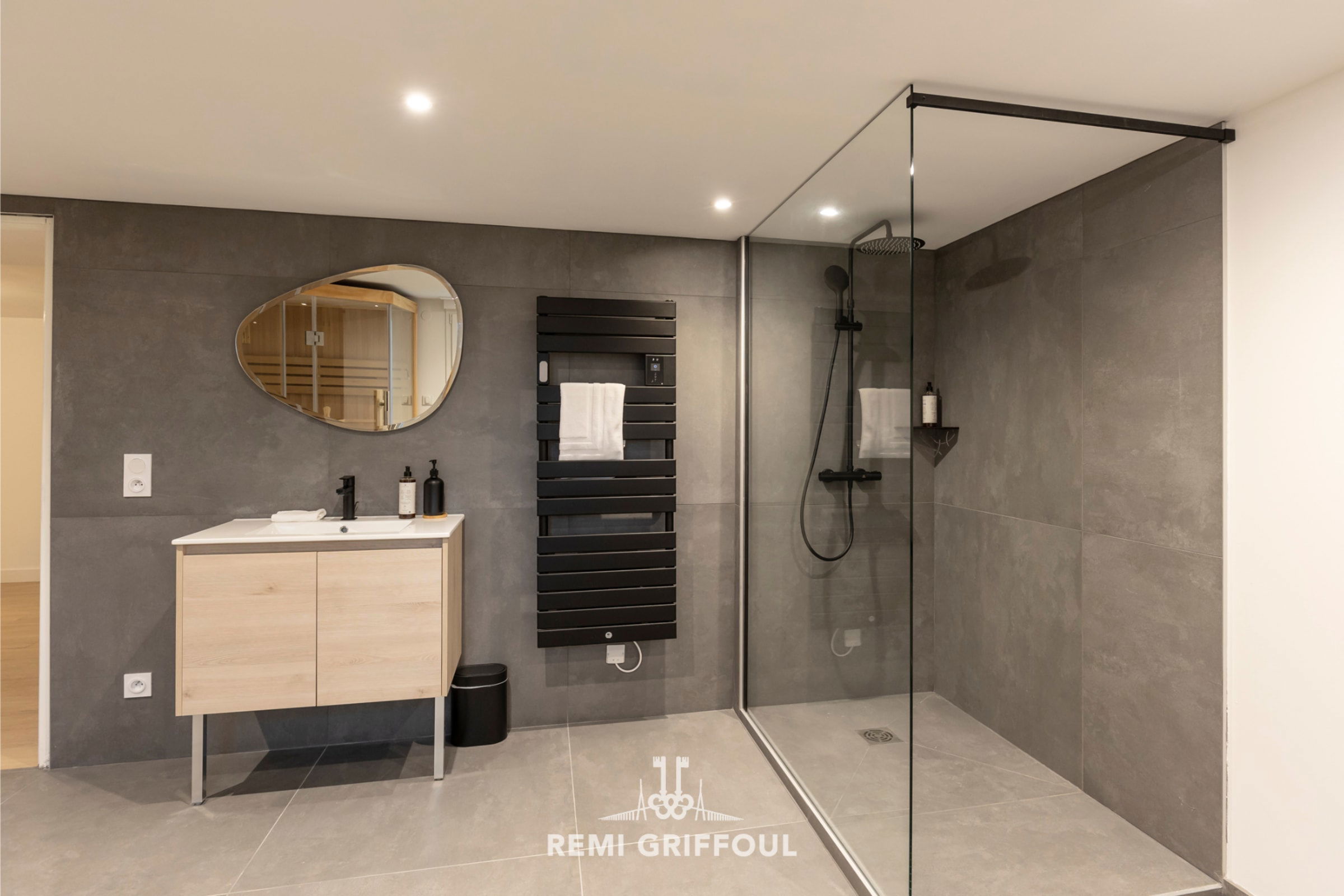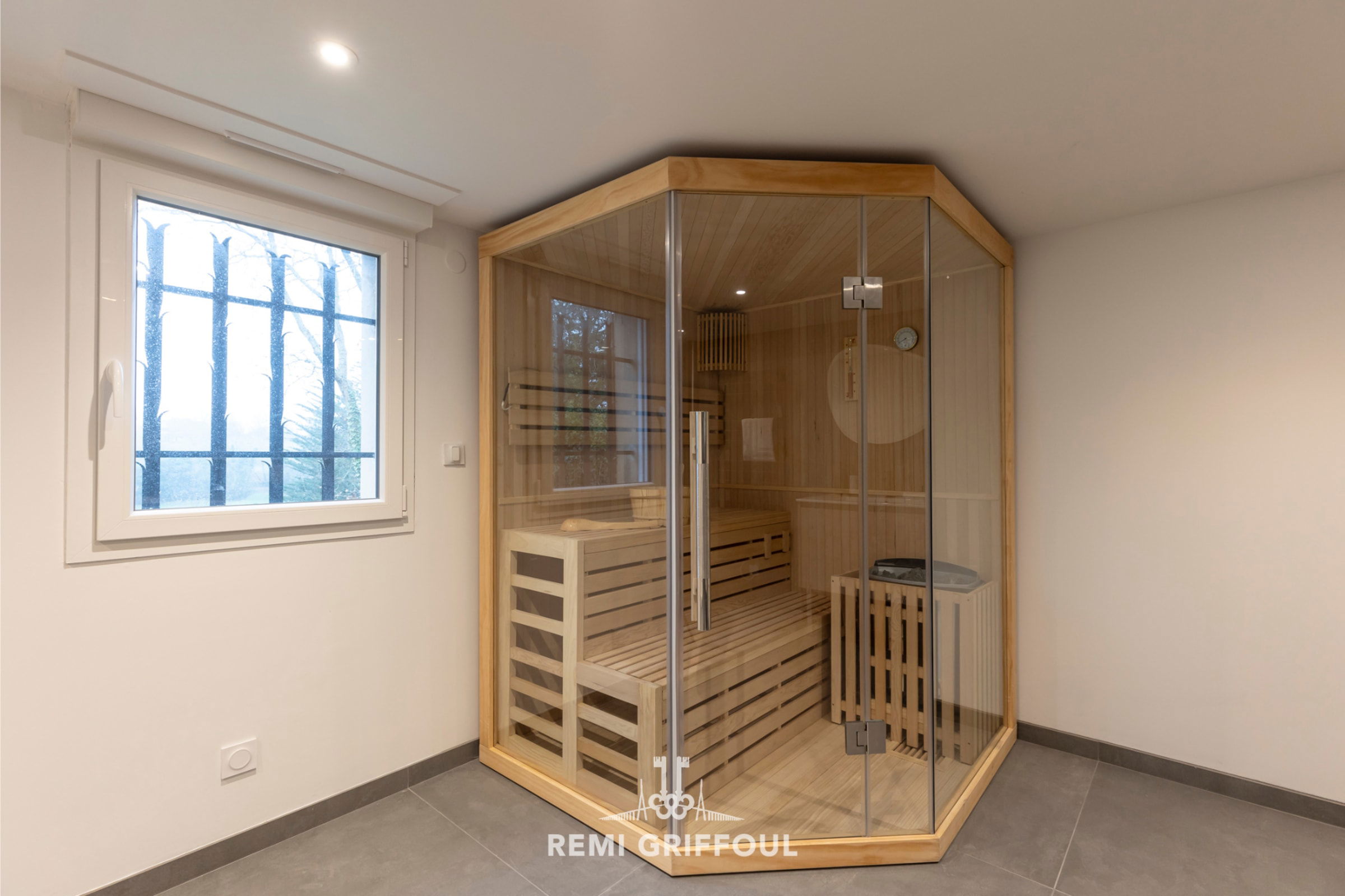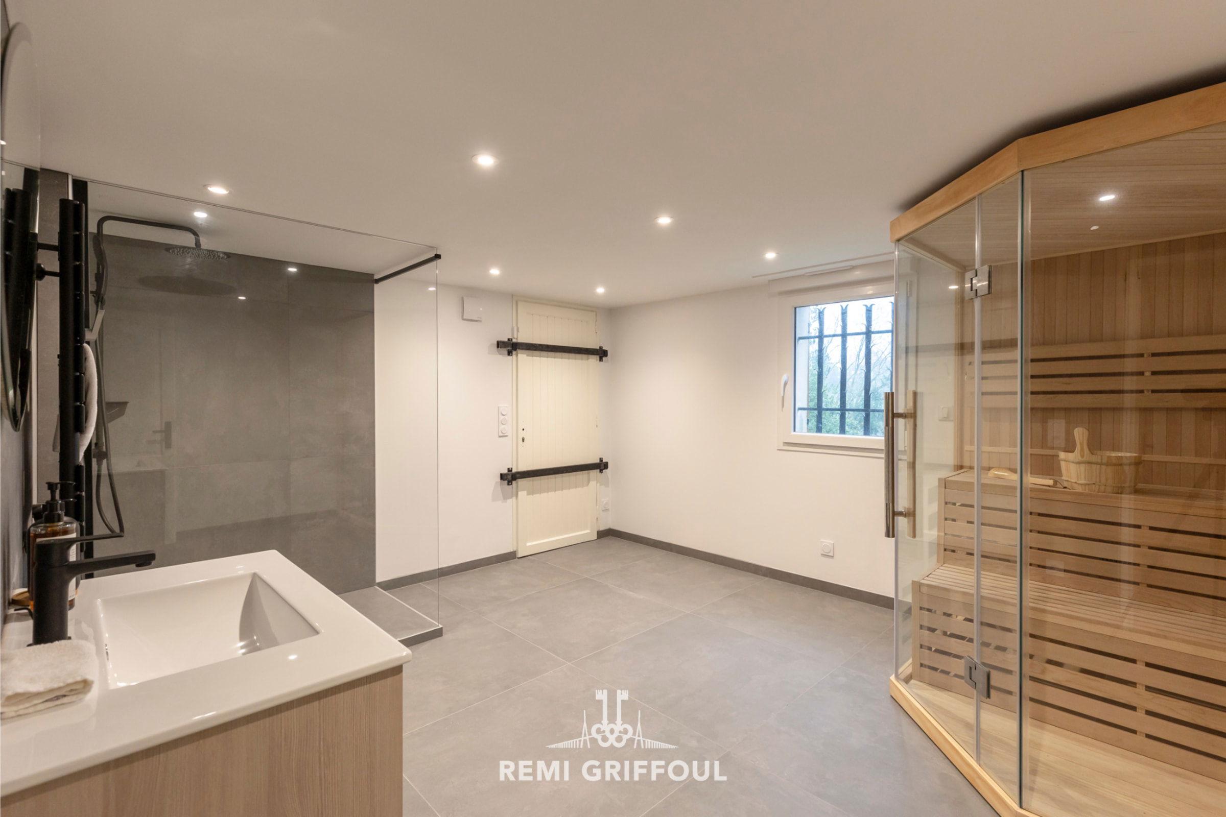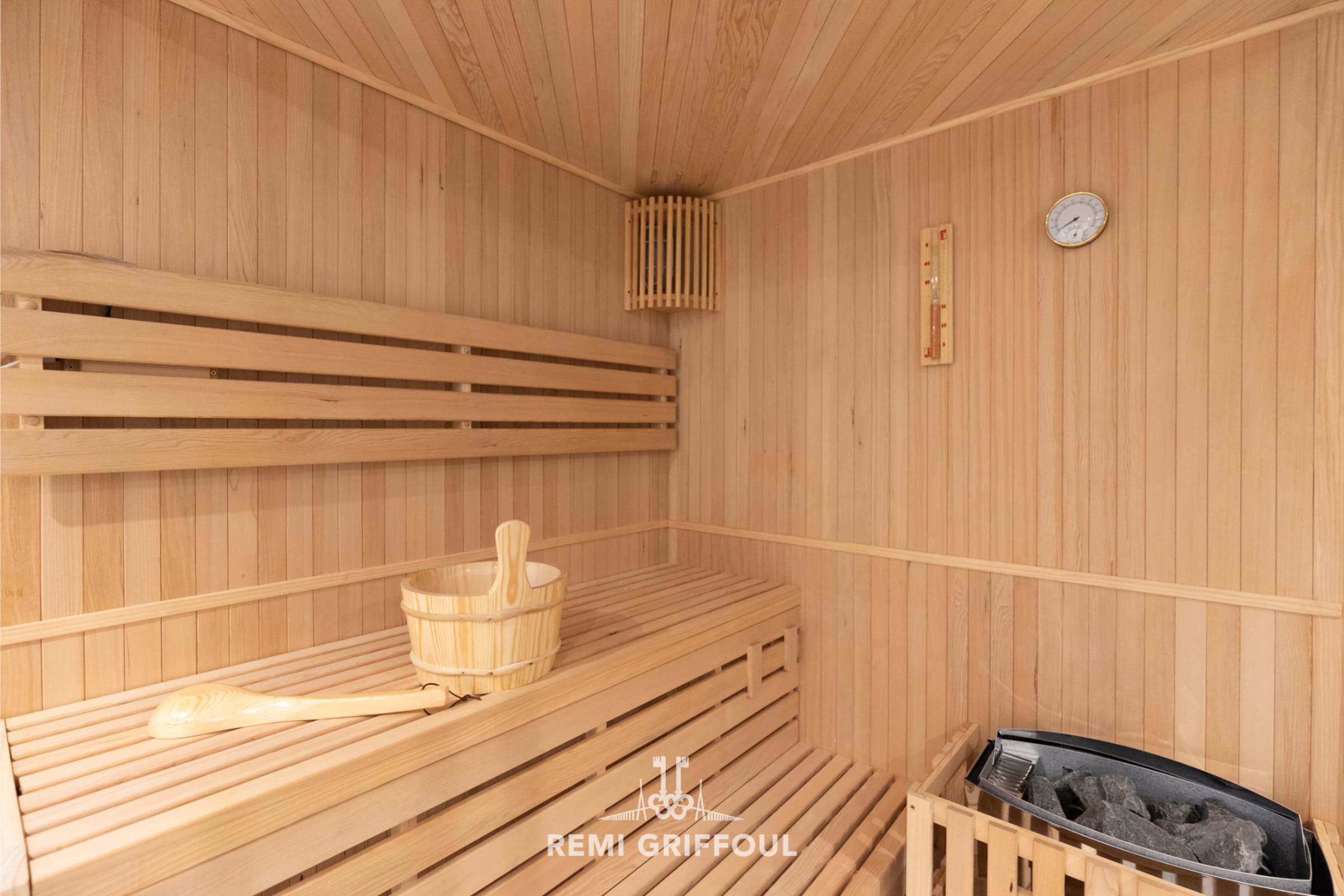 The basement houses a spacious garage for up to three standard-sized vehicles and includes a charging station for electric vehicles, enabling a full charge in just 5 hours. You'll also find a laundry room with a washer and dryer for your convenience. A wellness area with a sauna and shower completes this level, perfect for total relaxation.