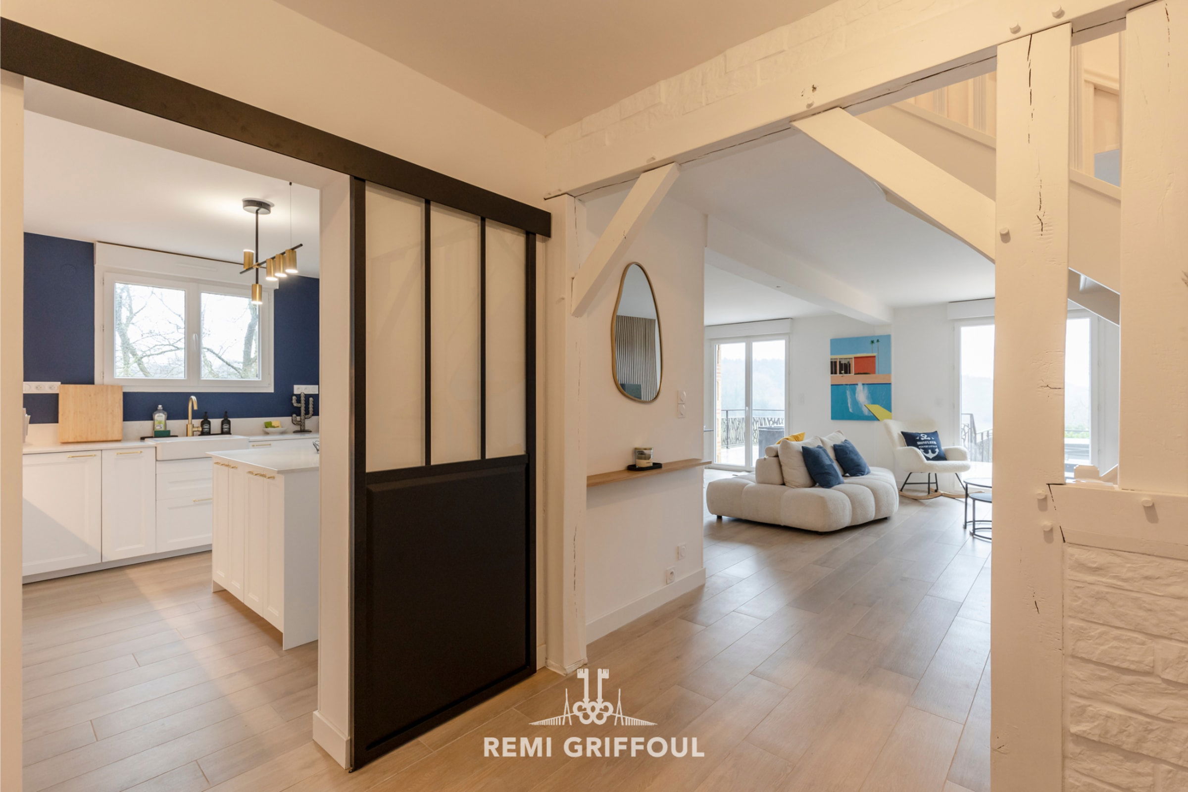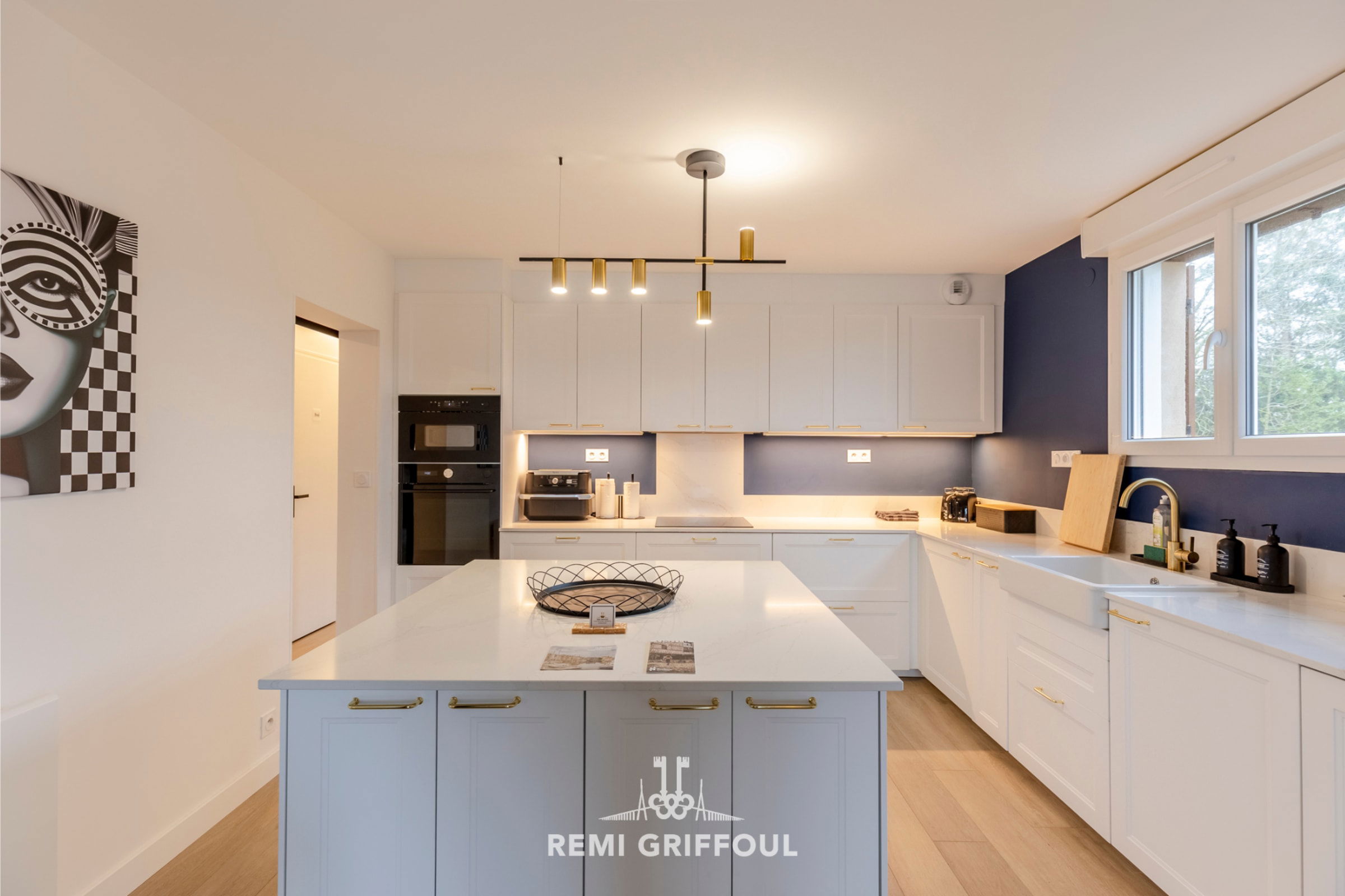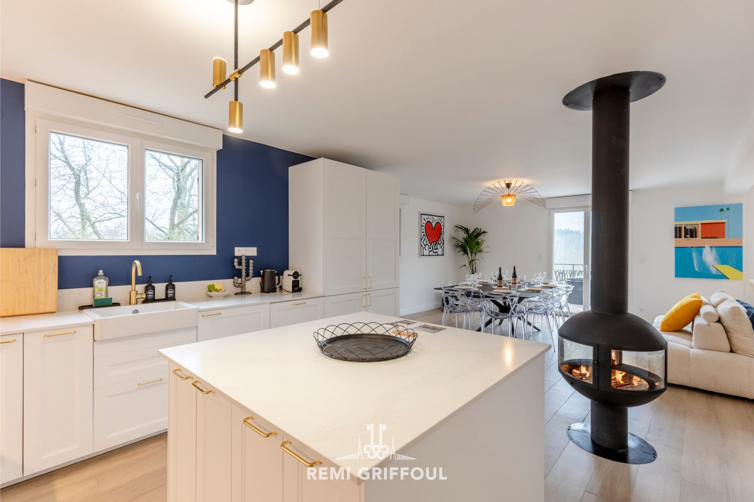The open kitchen, fully equipped, will delight culinary enthusiasts with its many appliances: microwave, oven, toaster, kettle, Nespresso coffee machine, refrigerator, freezer, air fryer, raclette grill, crepe maker, and blender.