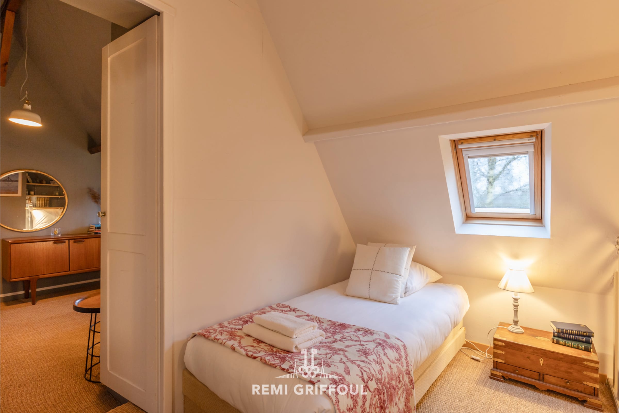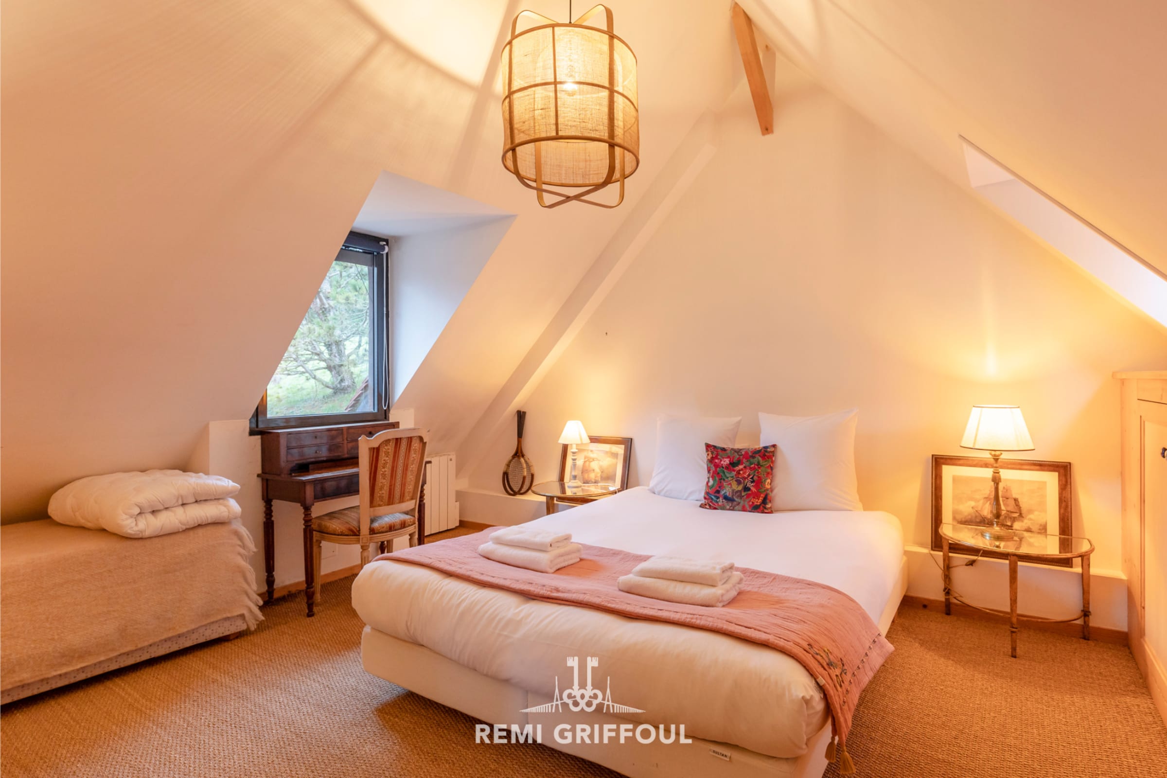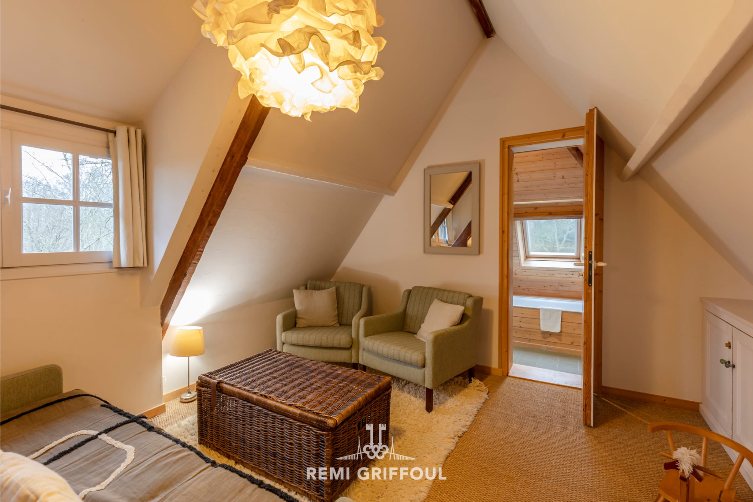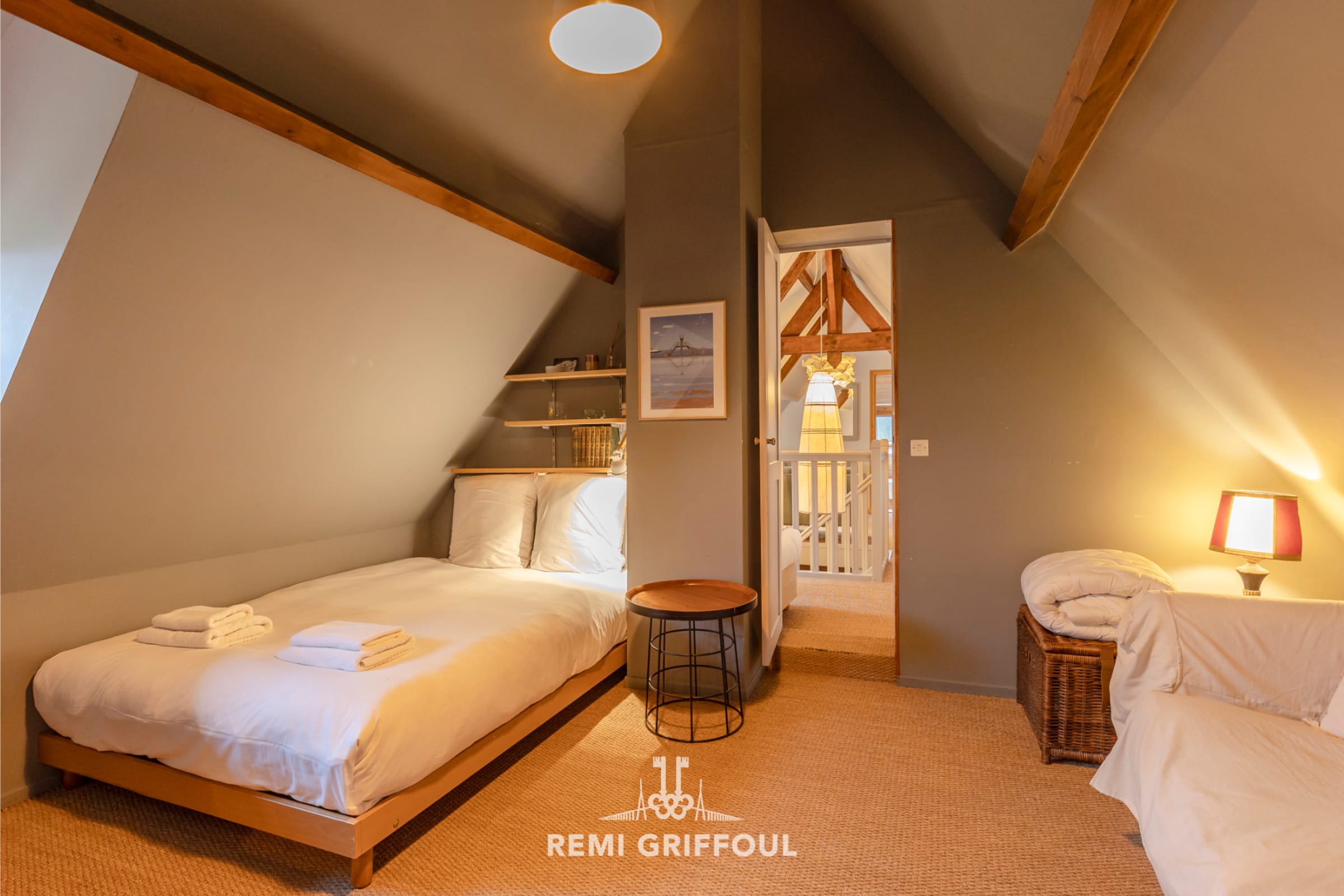 Upstairs, a single bed (90x190 cm) is placed on the landing. An en-suite bedroom, equipped with a double bed (140x190 cm), leads to a living room providing access to another bedroom with a queen-size bed (160x200 cm).