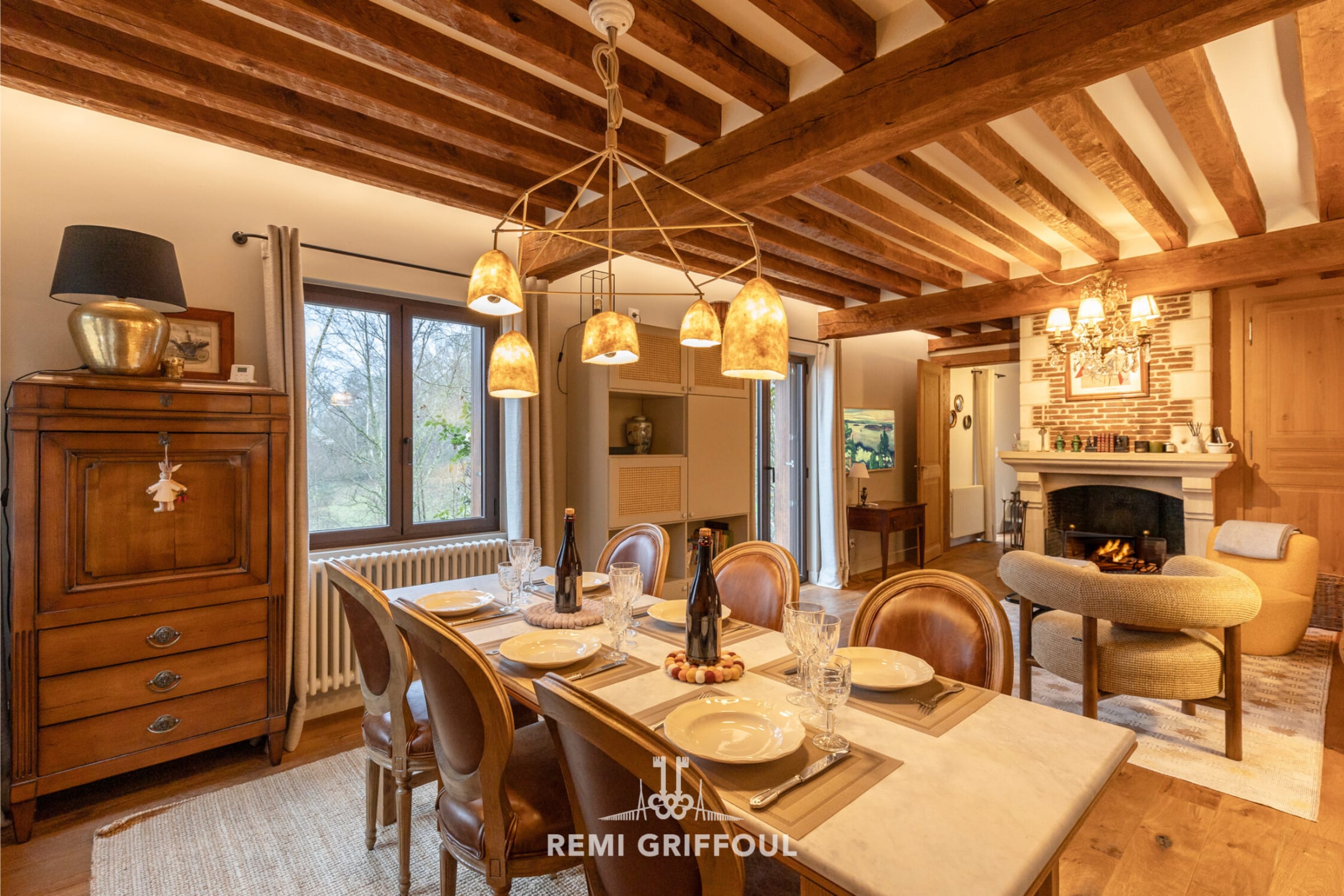 A living room equipped with a TV and a functional fireplace (wood provided) invites relaxation, while the adjoining dining area is perfect for sharing convivial moments.