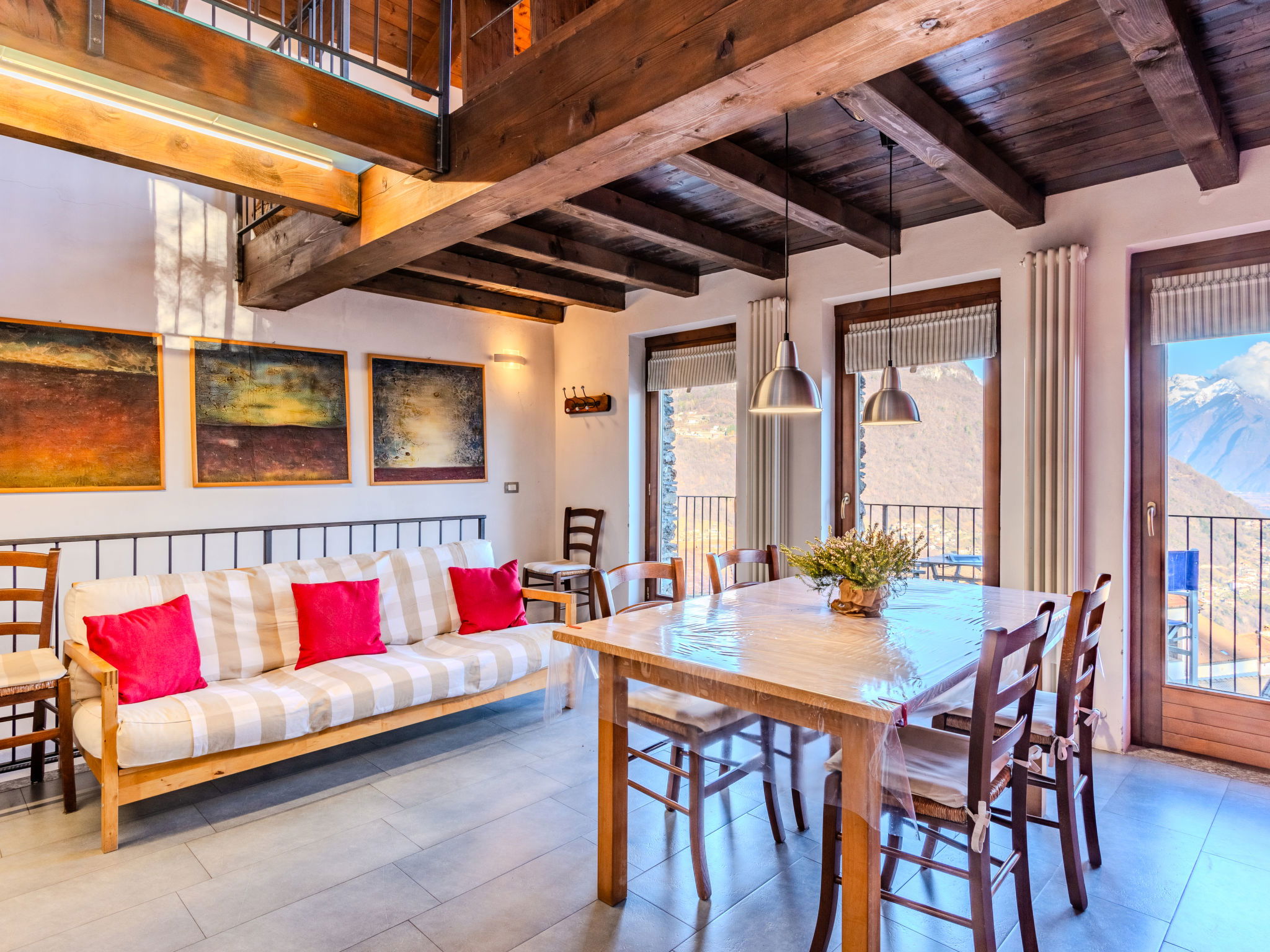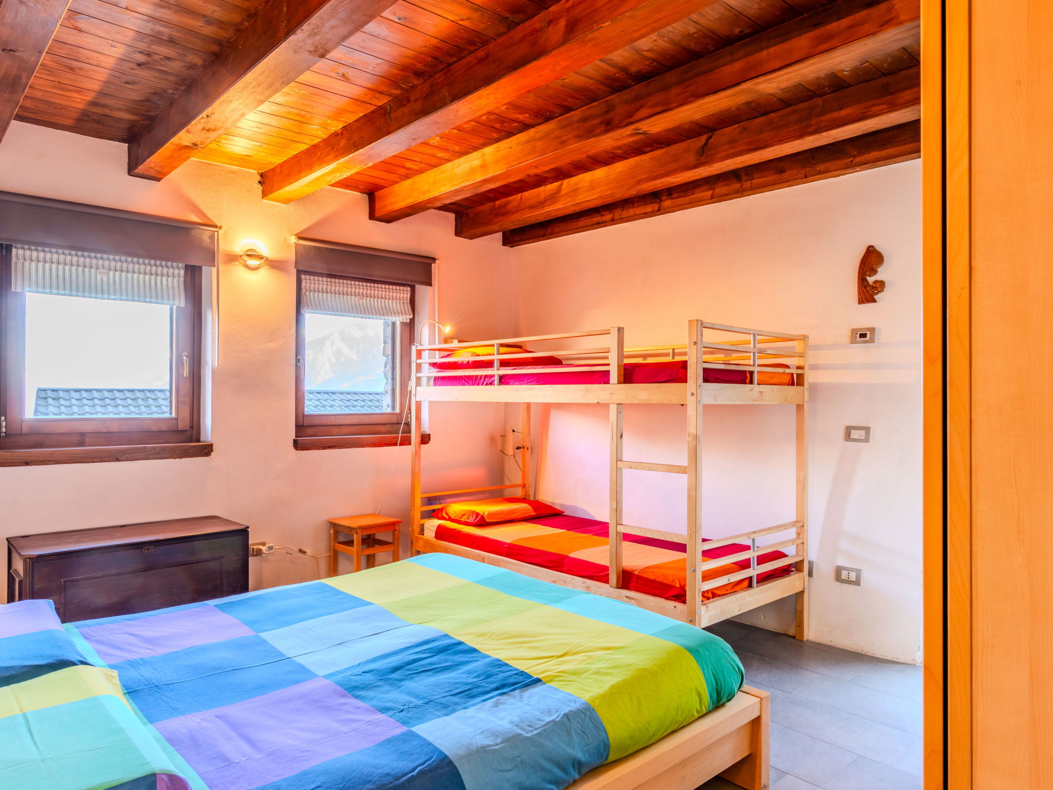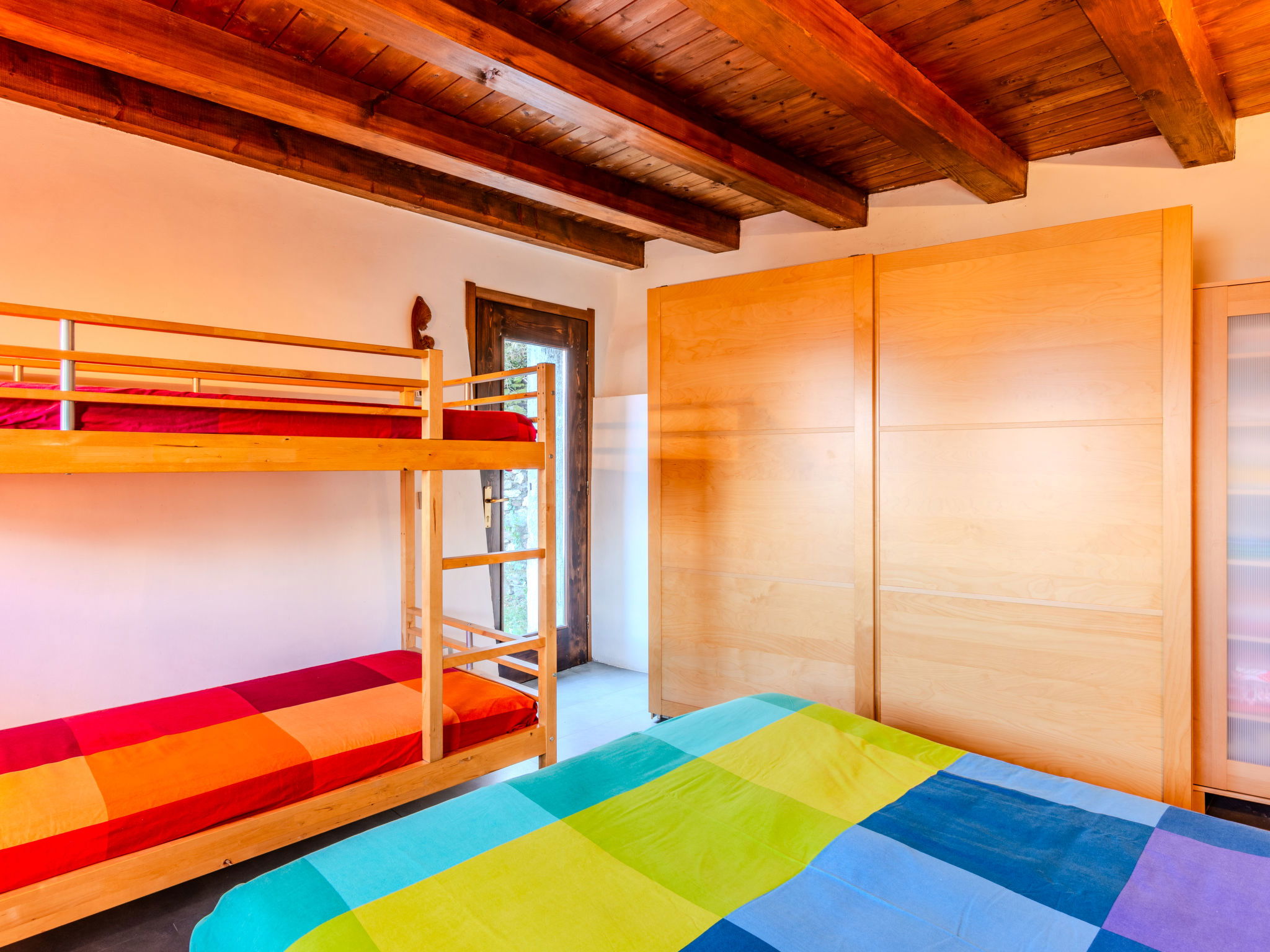 3-room house 70 m2 on 2 levels. Beautiful and tasteful furnishings: open living/dining room with Scandinavian wood stove (only for decoration), dining table and TV (flat screen). Exit to the garden, to the balcony, to the terrace. Open gallery. Open kitchen (oven, dishwasher, Gas stove, 4 gas rings, toaster, kettle, microwave, freezer). On the lower ground floor: 1 room with 1 x 2 bunk beds, 1 double bed. Exit to the garden. Shower/bidet/WC. Gas heating. Heating available only from 15.10. to 30.04. Natural stone floors. Small balcony, large terrace, garden. Terrace furniture, deck chairs (2). Marvellous panoramic view of the lake, the mountains and the resort. Facilities: washing machine, children's high chair, hair dryer. Internet (WiFi, free). Please note: non-smoking house, no parking. Maximum 1 pet/ dog allowed. Smoke alarm, fire extinguisher. IT013249C2G3DY7FHC