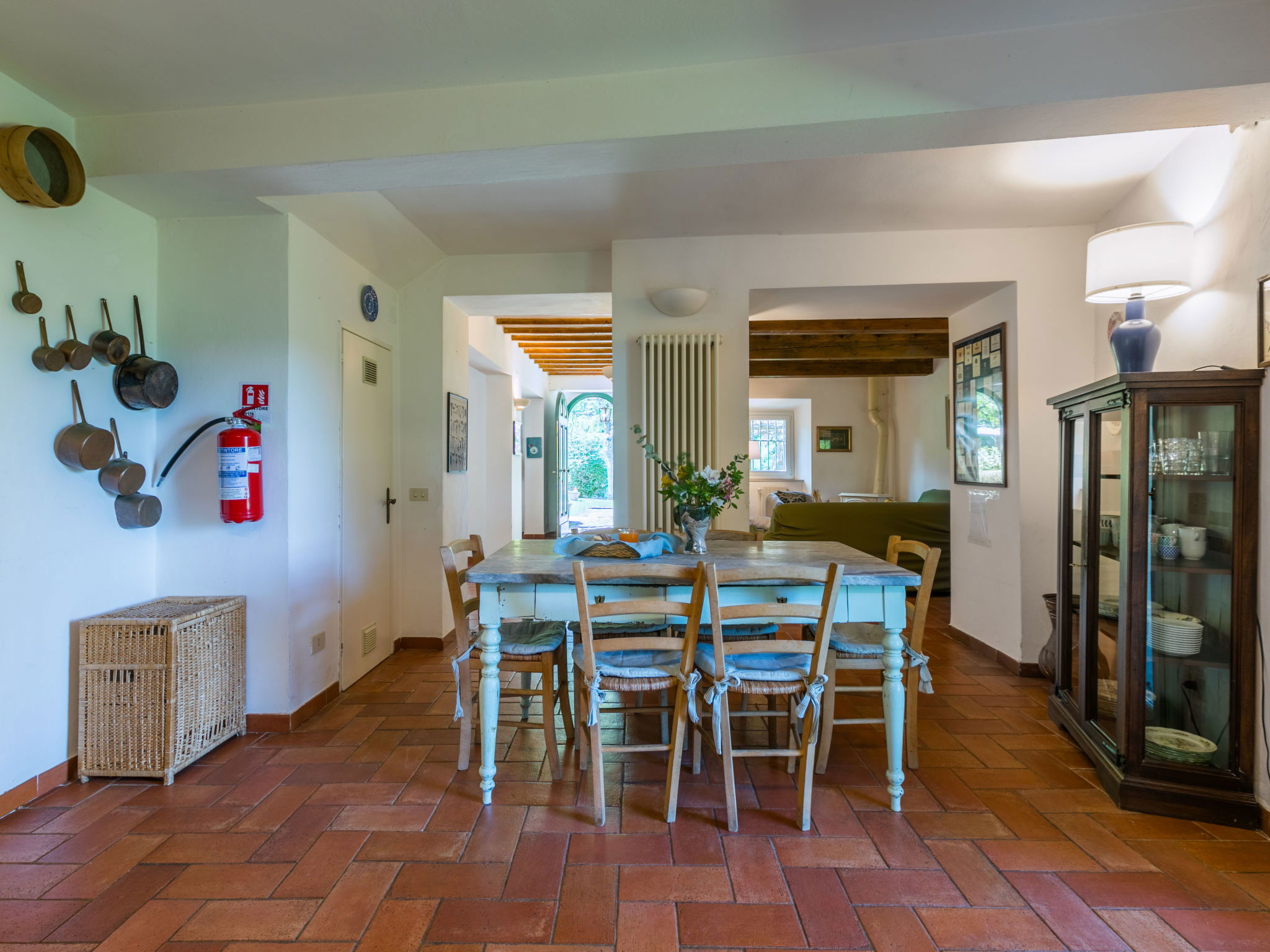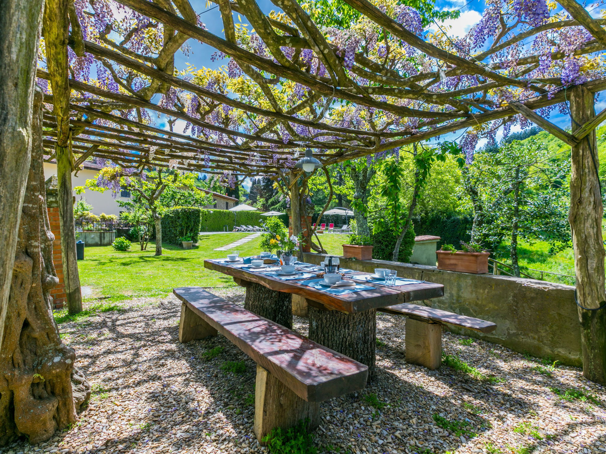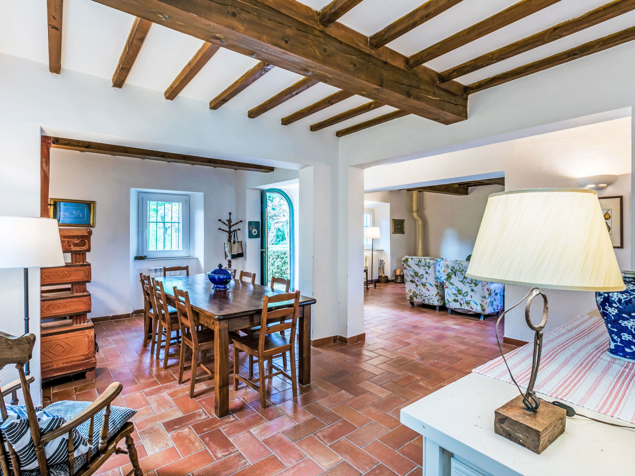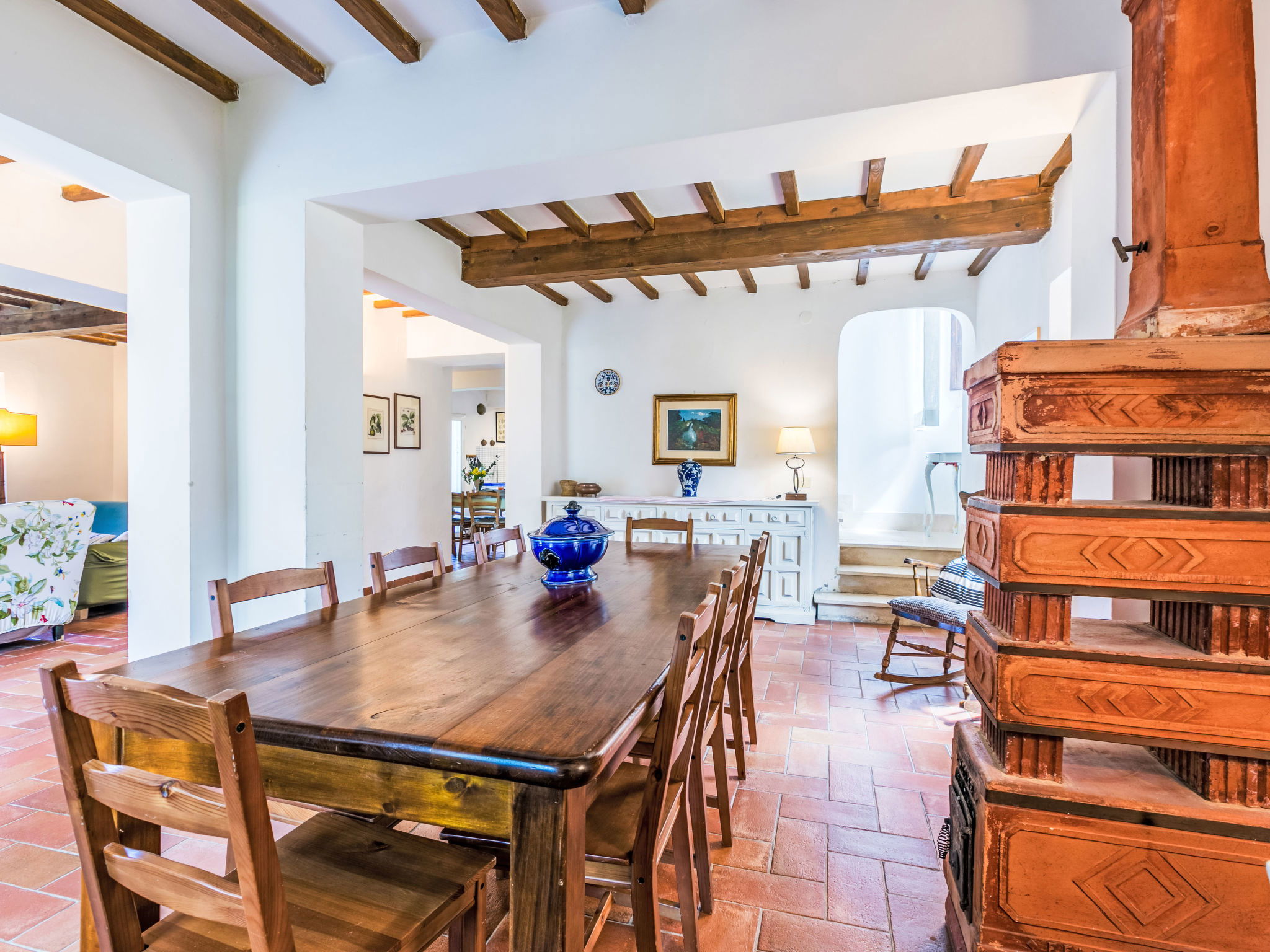 "Borgo Castagnoli", 14-room house 470 m2 on 2 levels. Wooden furniture furnishings: living/dining room with open-hearth fireplace, dining table, kitchen corner and satellite TV. Living/dining room with dining table and satellite TV. 1 room with 1 french bed (160 cm). 1 room with 2 beds (80 cm). Open kitchen (oven, dishwasher, 5 gas rings, freezer, electric coffee machine) with small dining table, open-hearth fireplace. Shower/WC, sep. WC. Upper floor: living/dining room with open-hearth fireplace, dining table and satellite TV. 5 rooms, each room with 1 french bed (160 cm). 3 rooms, each room with 2 beds (80 cm). Open kitchen (oven, dishwasher, 4 gas rings, freezer, electric coffee machine). Bath/WC, 4 showers/WC. Gas heating. Parquet floors. Terrace roofed. Facilities: washing machine, iron, baby cot for up to 2 year olds. Internet (WiFi, free). Parking (5 cars) at the house. Please note: non-smokers only. Maximum 1 pet/ dog allowed. Smoke alarm. No internal connecting door between the separated properties. The pool mentioned in the description is for private use. When booking this property you make a reservation for the whole house. Facilities for shared use are then for private use. No mandatory extra charges to be paid on-site except for local tax. IT048021B49F5V68X8